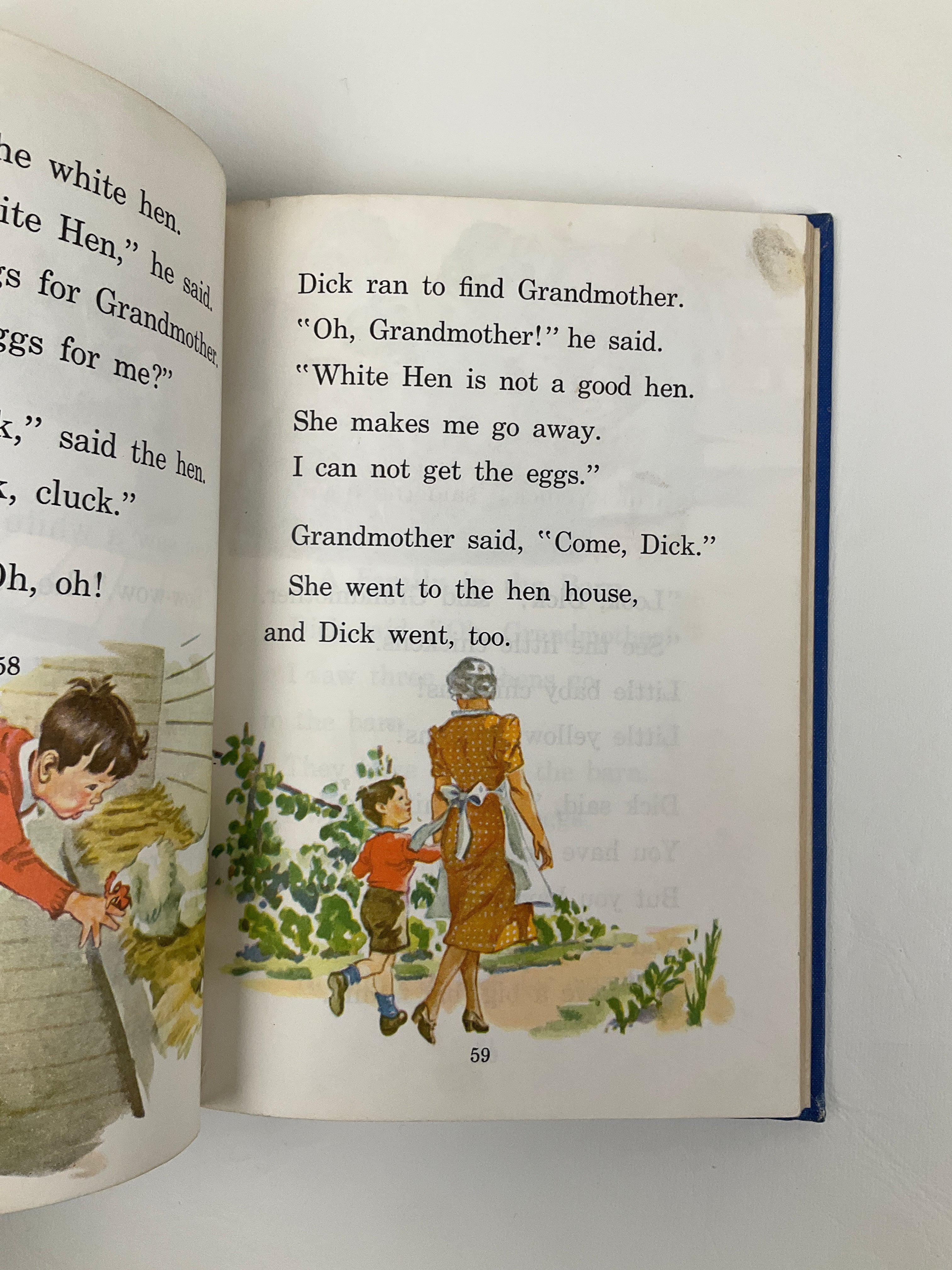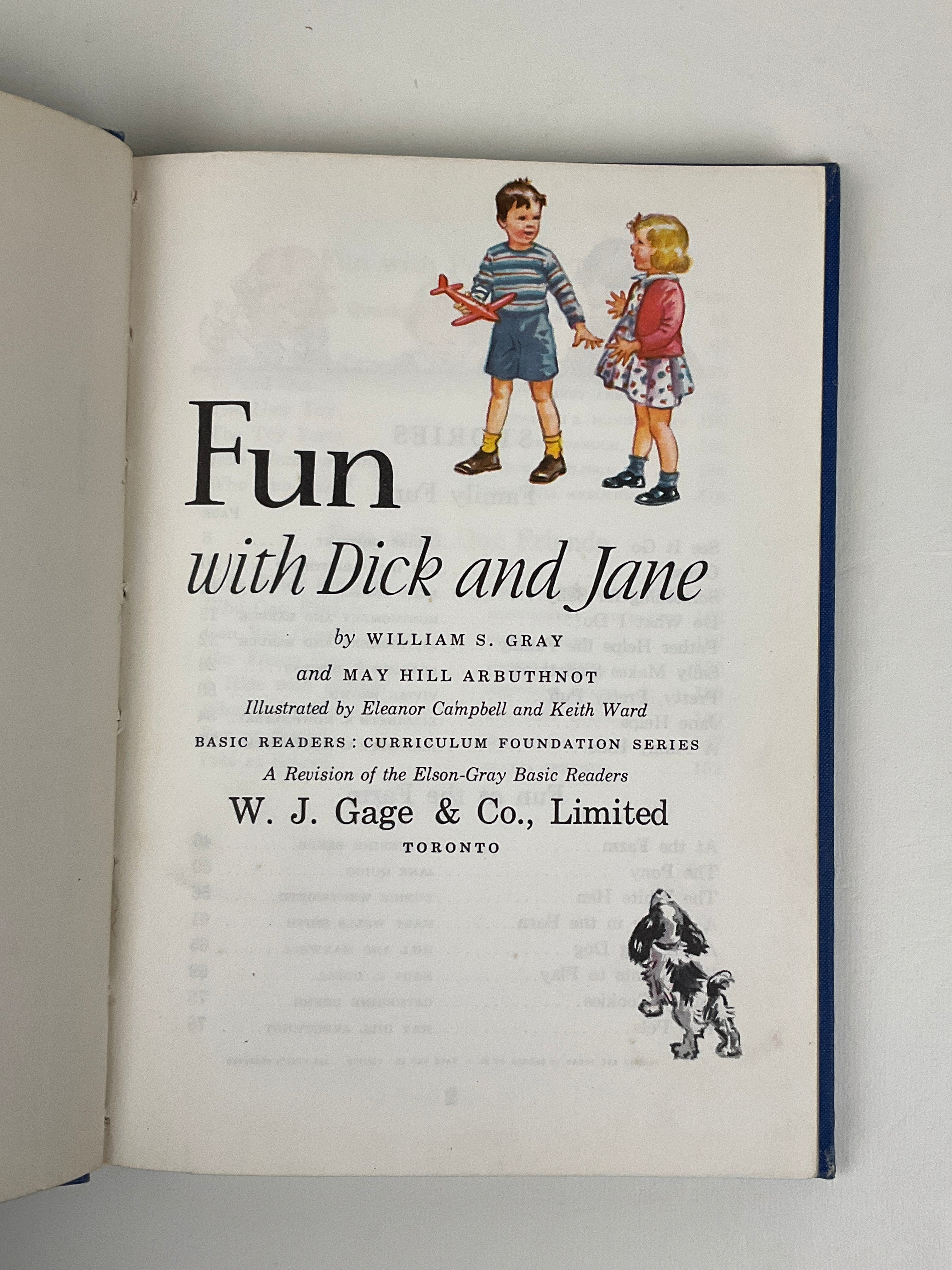The beloved Dick and Jane series, created under the direction of educator William S. Gray with stories by Mary Hill Arbuthnot and others, became the standard reading primer from the late 1940s through the 1960s. The books introduced generations of children to literacy through simple, repetitive sentences and gentle watercolor illustrations depicting the everyday life of an idealized mid-century family—Mother, Father, Dick, Jane, Sally, and their pets.