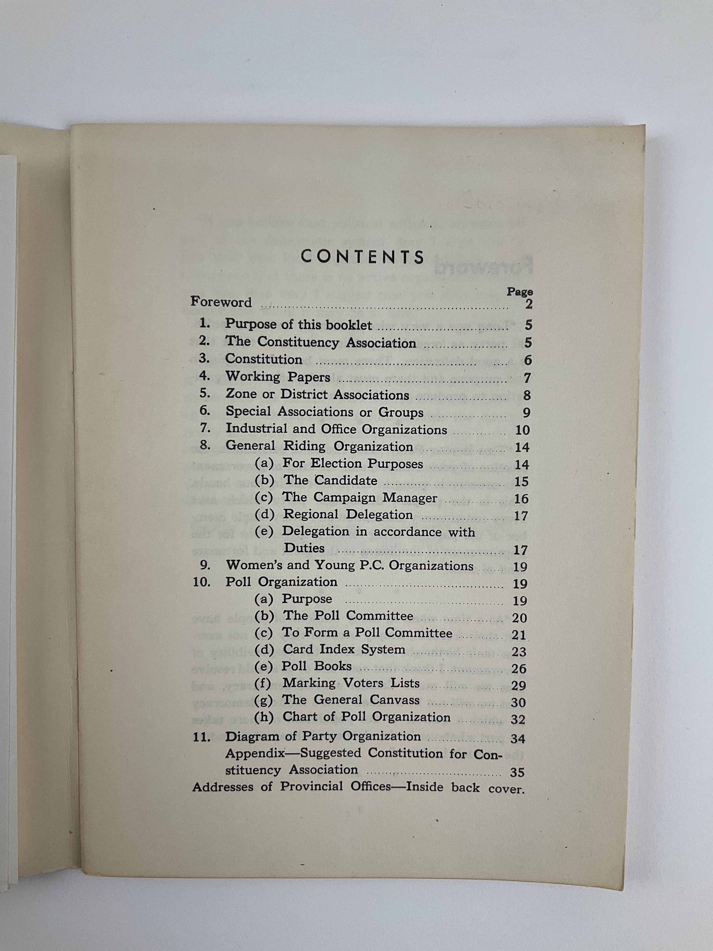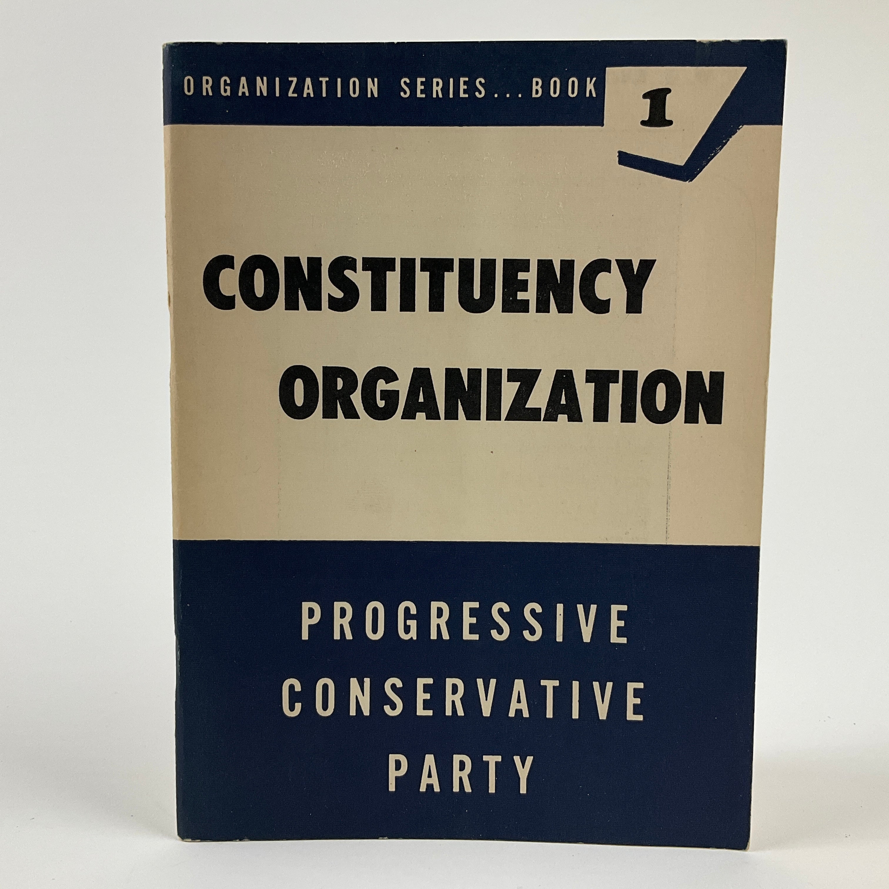Ahead of Canada’s 1949 federal election, the Progressive Conservative Party published an Organization Series of booklets to facilitate the creation/growth of local party cells. This first booklet in the series discusses local constituency organizations. From setting up an office to fielding election candidates to keeping track of voter lists, the booklet offers administrative advice for Progressive Conservative supporters organizing at the local level. While avoiding platform points, the volume provides insight into canvassing, promotional, and electoral processes endorsed by the Progressive Conservatives in the late 1940s. Laid in is a 1949 mailing on Saskatchewan Progressive Conservative Party stationary from Alvin Hamilton (Director of Organization, soon to be elected Saskatchewan’s Progressive Conservative Party leader) announcing a National Membership Drive. Lauding federal party leader George Drew, Hamilton’s letter requests recipients to sell membership tickets to build support for the Progressive Conservatives in Saskatchewan.