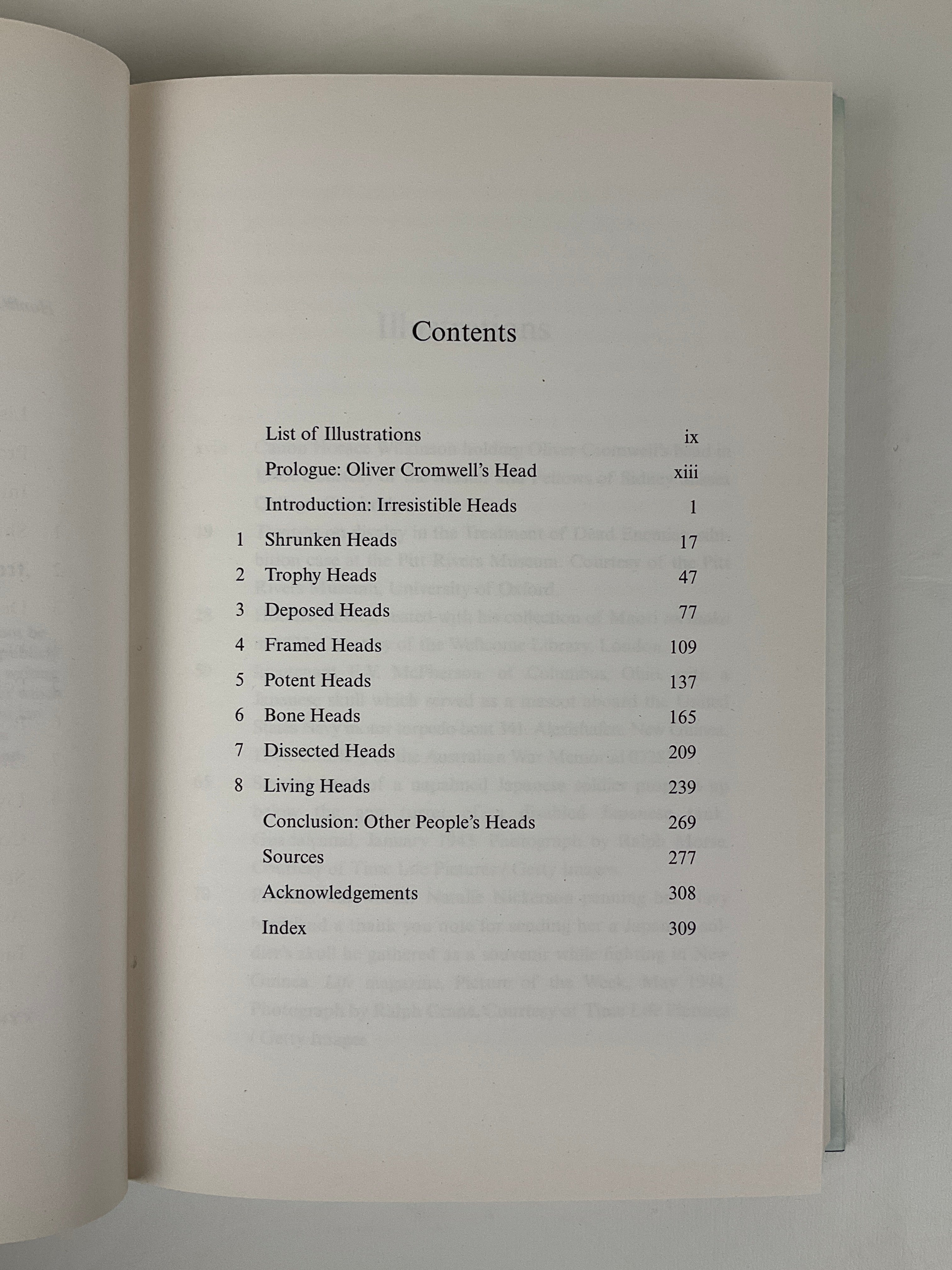 “This book is about severed heads. Our history is littered with them. The word headhunting conjures up exotic, strange, and dangerous worlds far from civilization, but the truth is that human heads have long been paraded closer to home. We have our own particular traditions when it comes to headhunting, and over the centuries human heads have embellished almost every facet of our society—from the scaffold to the cathedral, and from the dissecting room to the art gallery. Our traditions of decapitation run deep and linger on, albeit tacitly, even today.”