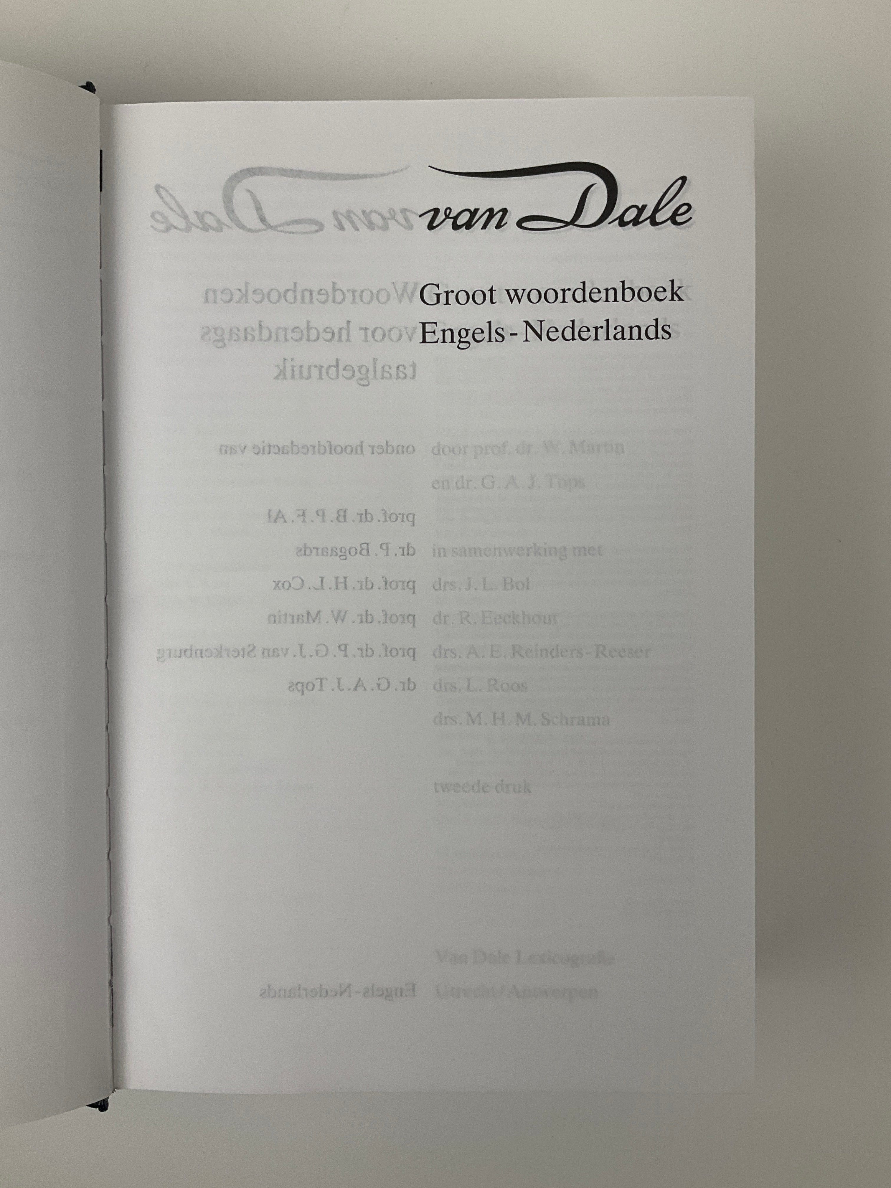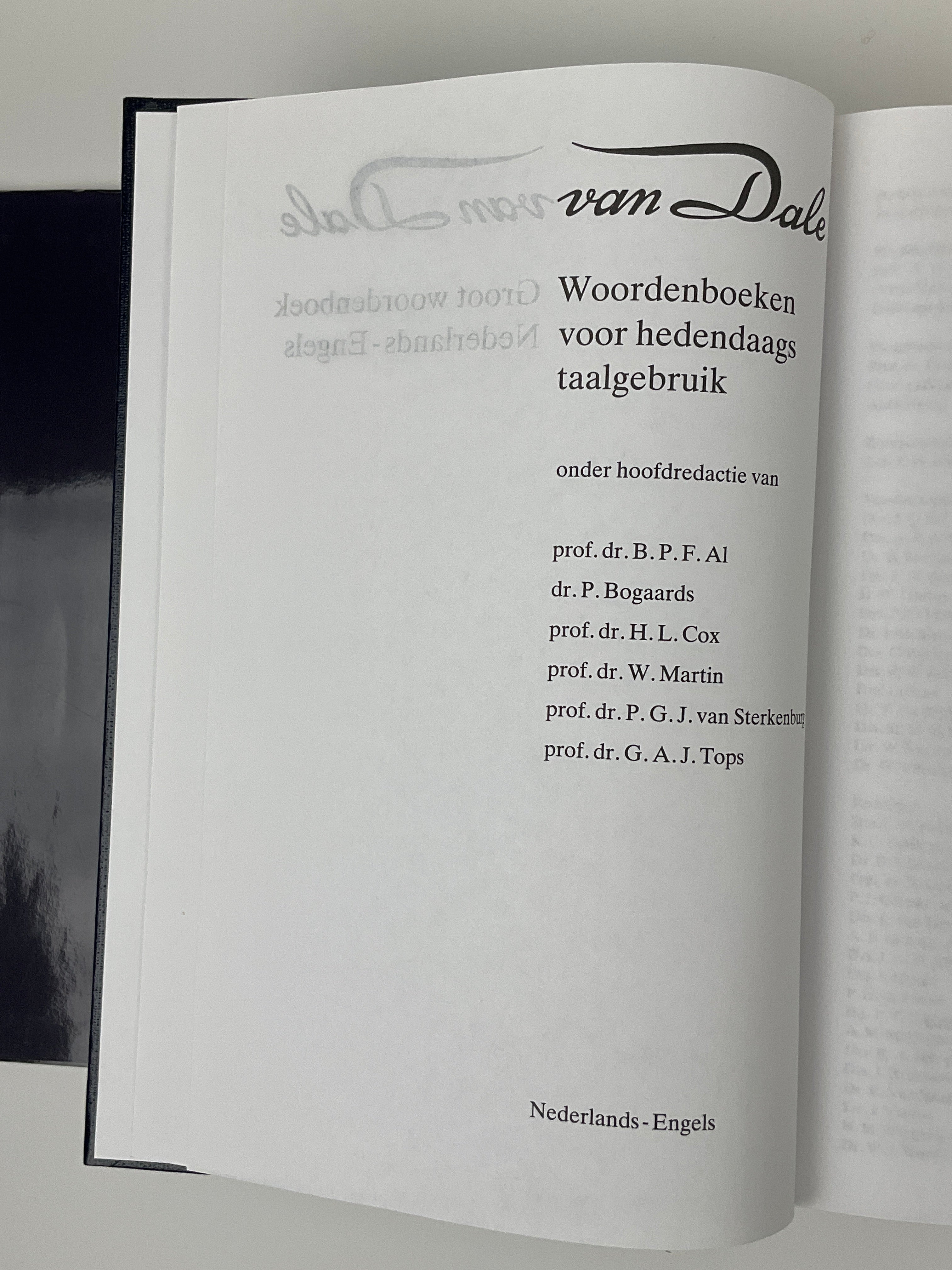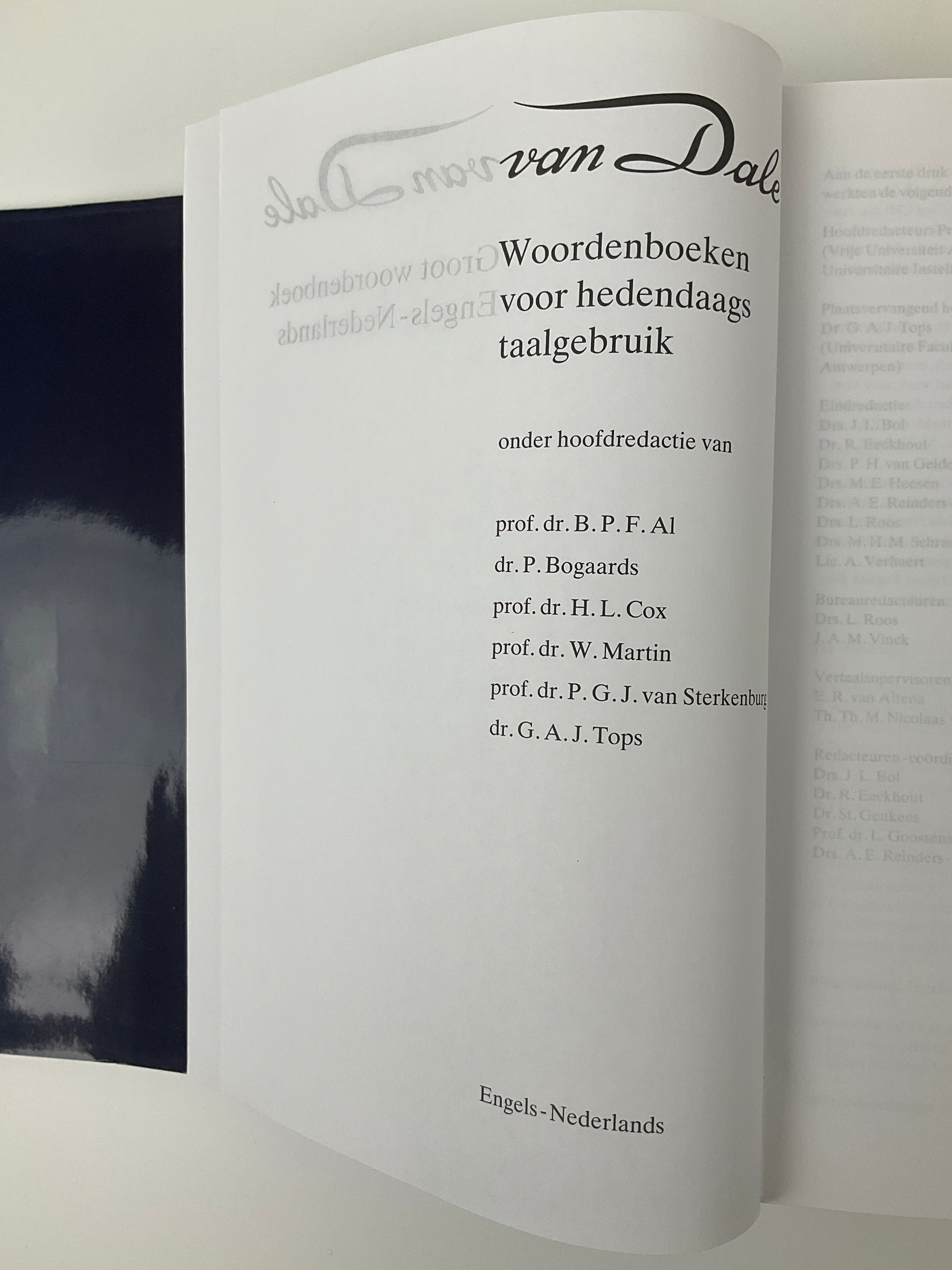 van Dale’s English-to-Dutch dictionary, extensively revised and expanded from the 1984 original. The volume spans 1,654 pages, offering lexical entries designed for translators, educators, and advanced learners. Emphasizes modern English usage with accurate Dutch renderings.