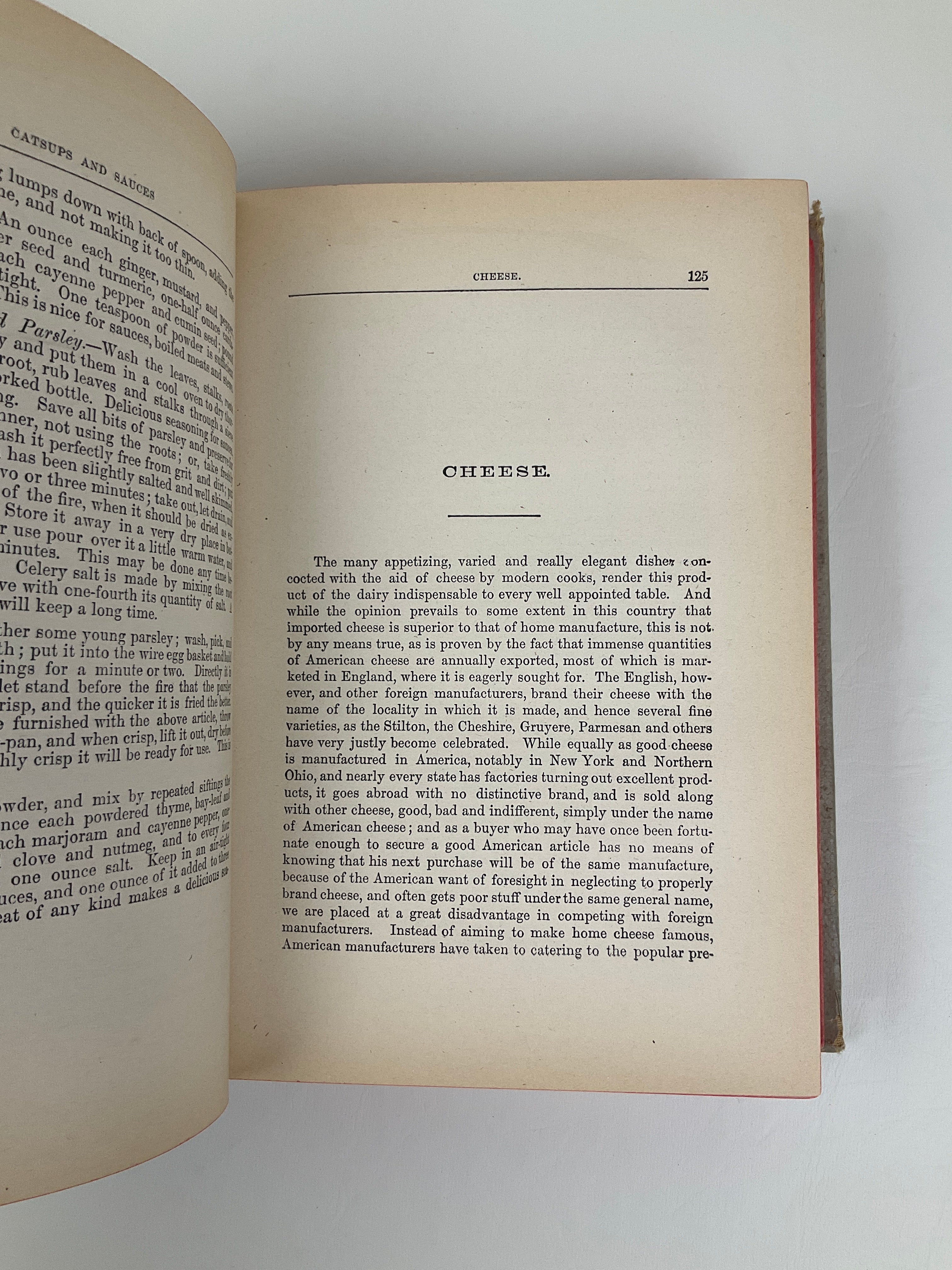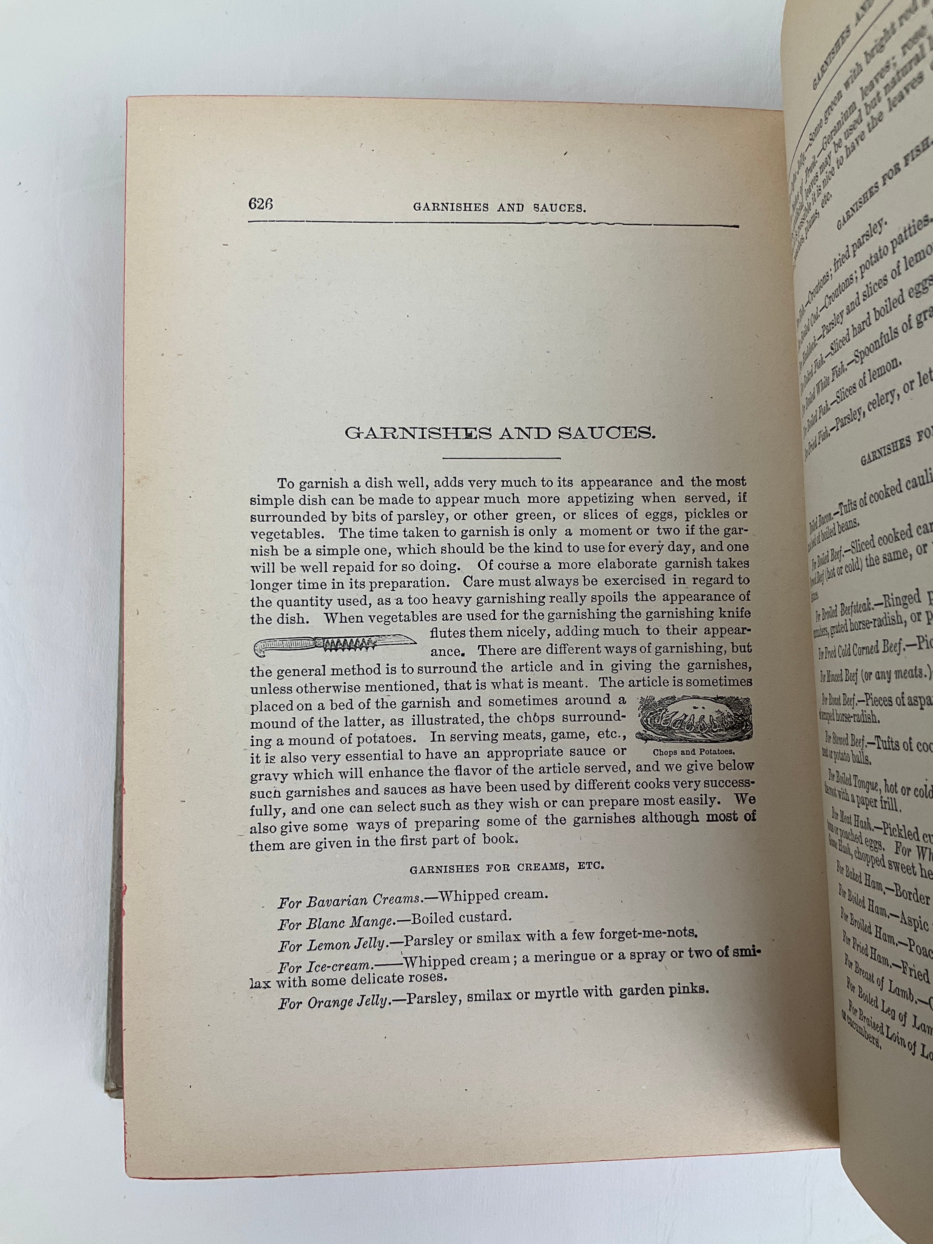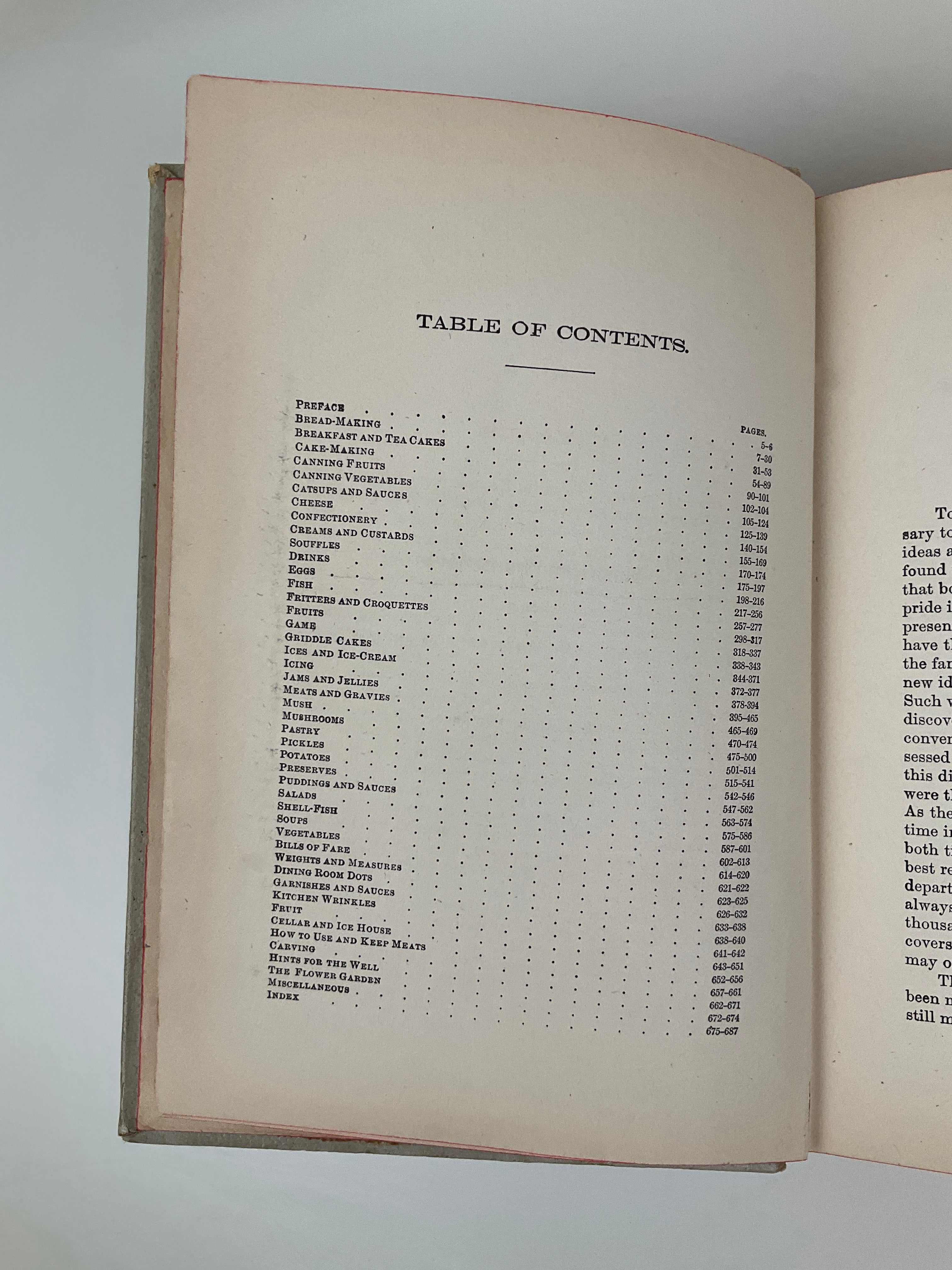 A comprehensive domestic manual comprising forty-four chapters, a preface, and an index, extending to 689 pages. Covers all aspects of household management and practical cookery, from breadmaking and confectionery to preserving, pickling, and meats and gravies, with additional sections on the dining room, household hints, and the management of the flower garden. A wide-ranging compilation of “choice and carefully tested recipes,” intended as a complete guide to the running of an efficient household at the turn of the twentieth century.