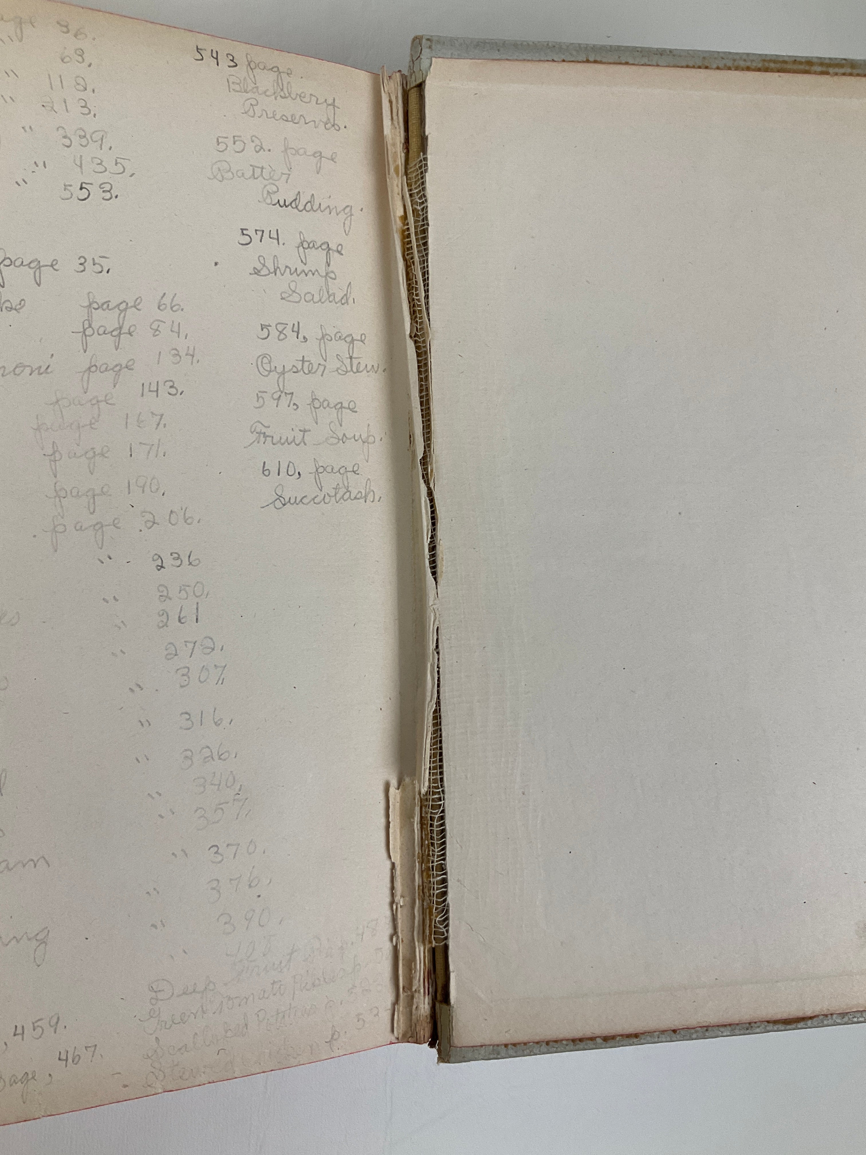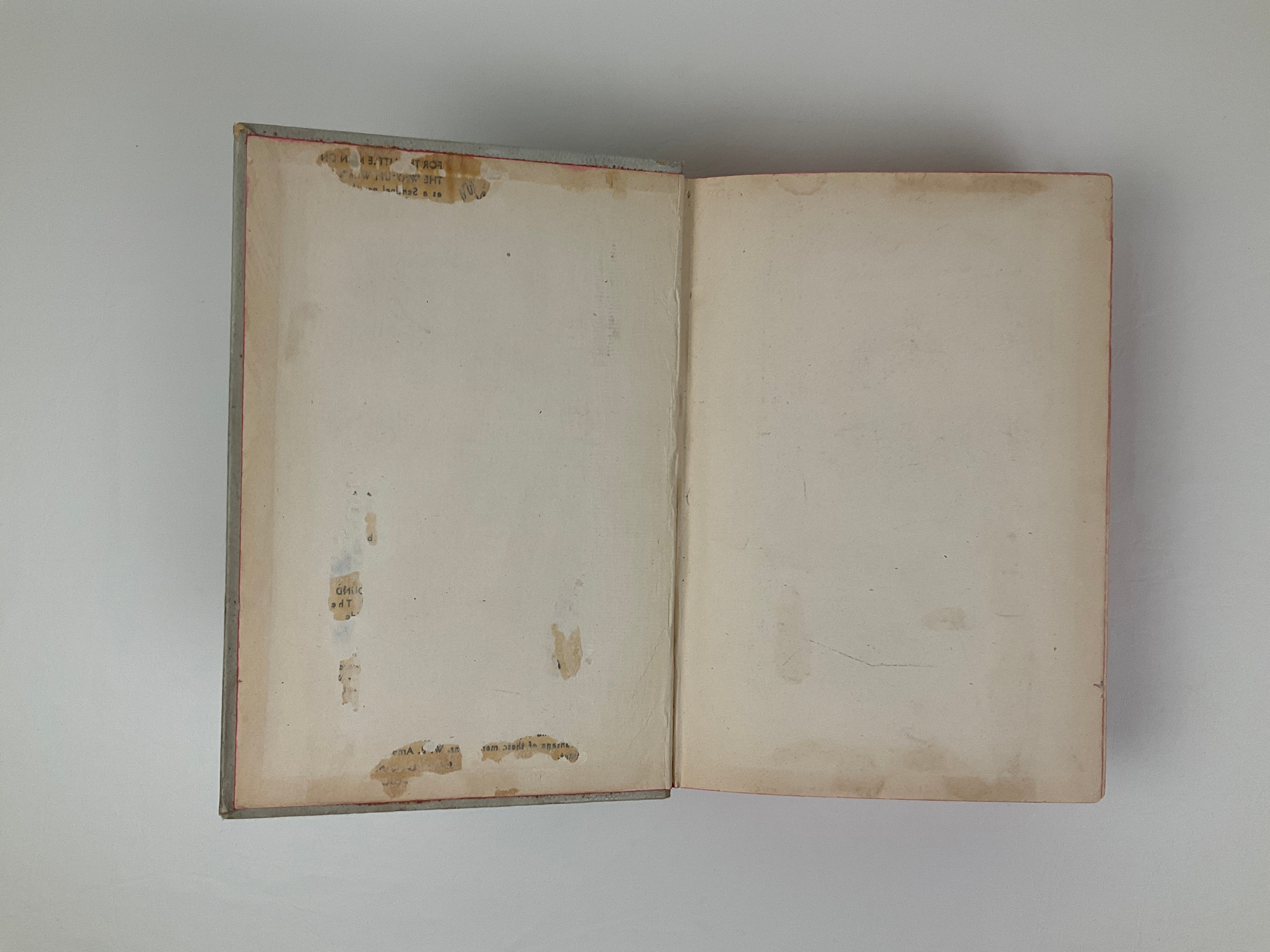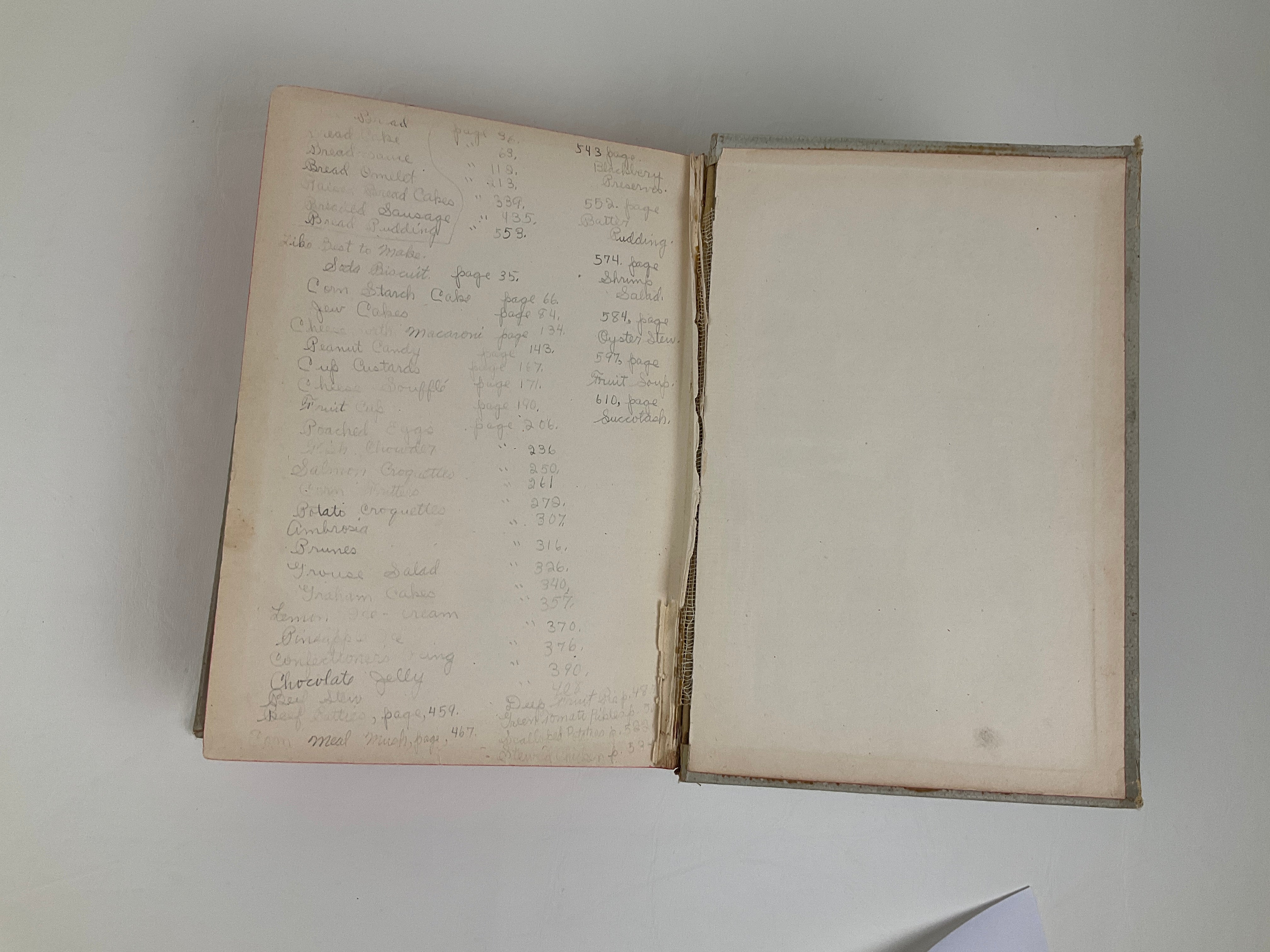 Rear hinge cracked, exposing the mull. Rear blank endpaper with pencil annotations referencing useful pages, corresponding pages neatly marked in pencil. Frontispiece torn. Remnants of an unidentified printed sheet adhering to the front pastedown. Light staining and age toning throughout. Covers worn and stained.