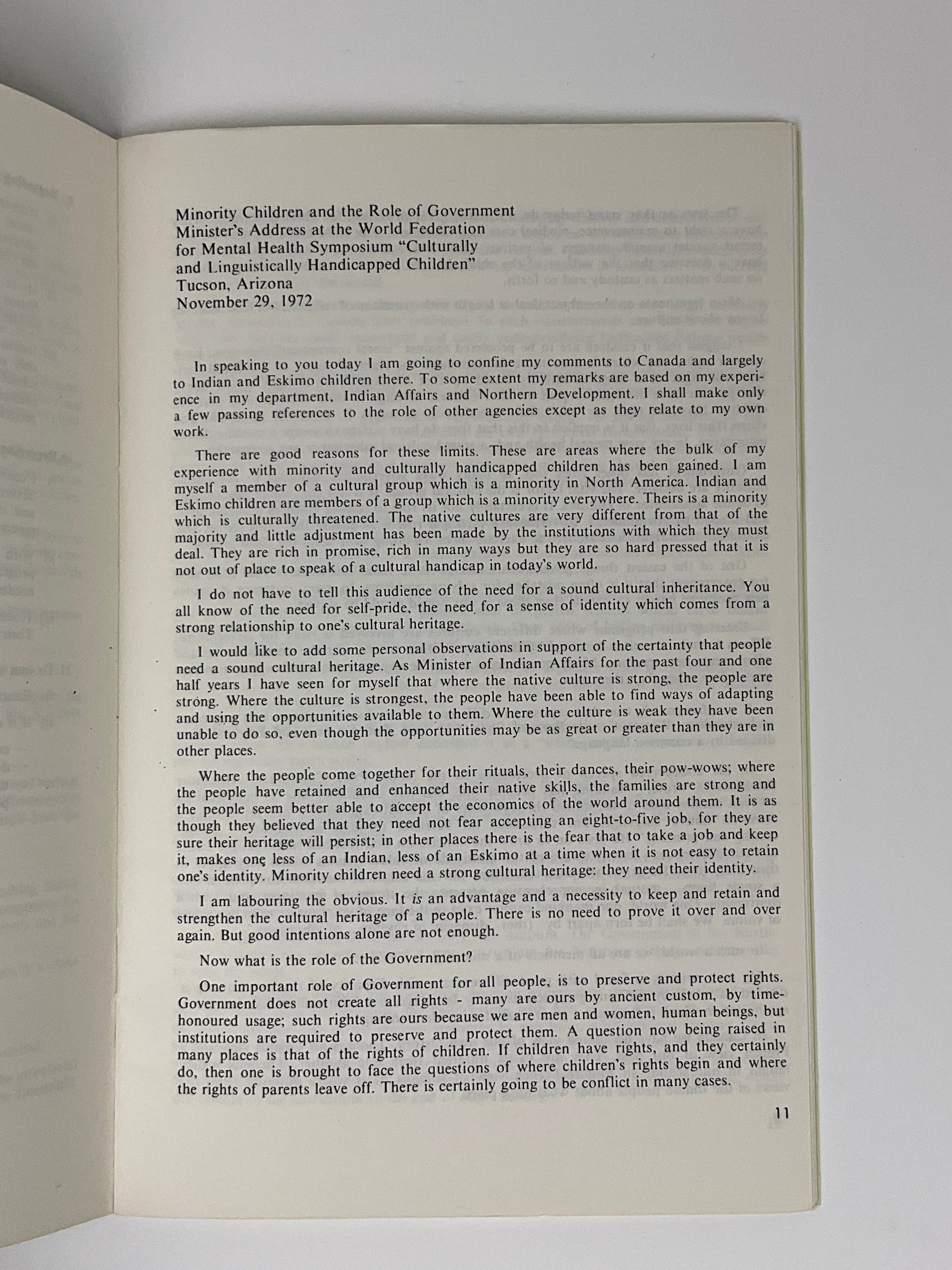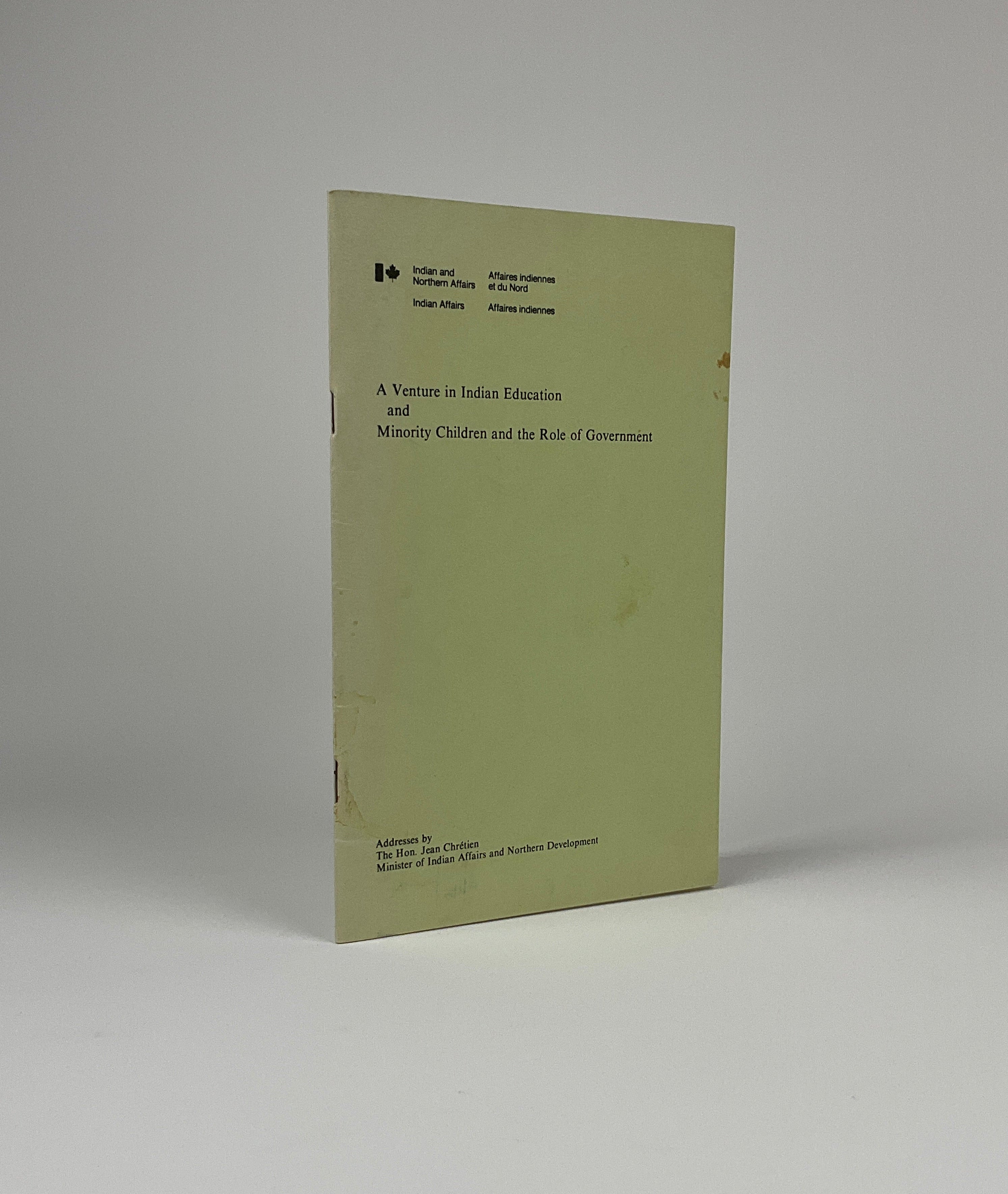 The first address, "A Venture in Indian Education," was presented to the Council of Ministers of Education in Regina, Saskatchewan on June 23, 1972. The second, "Minority Children and the Role of Government," was delivered at the World Federation for Mental Health Symposium in Tucson, Arizona on November 29, 1972.