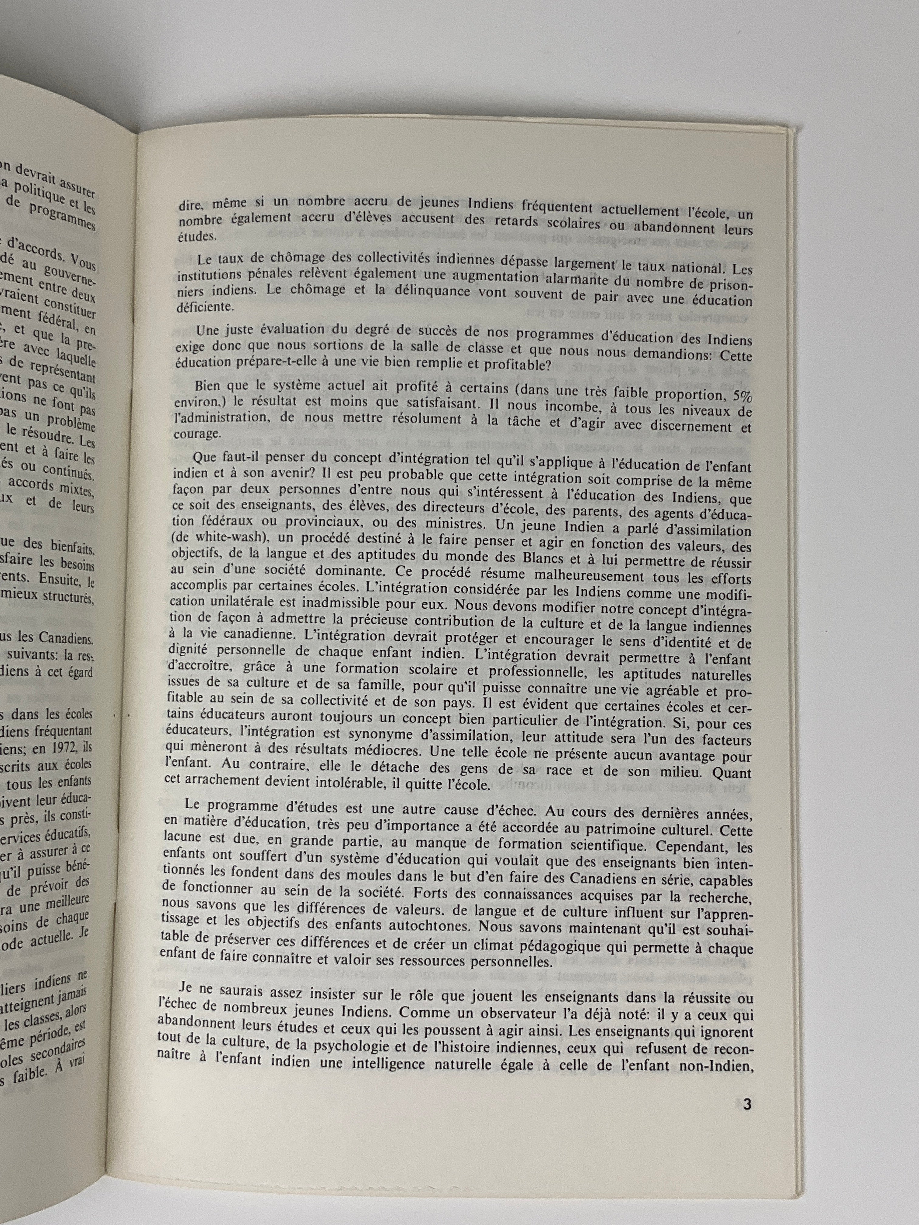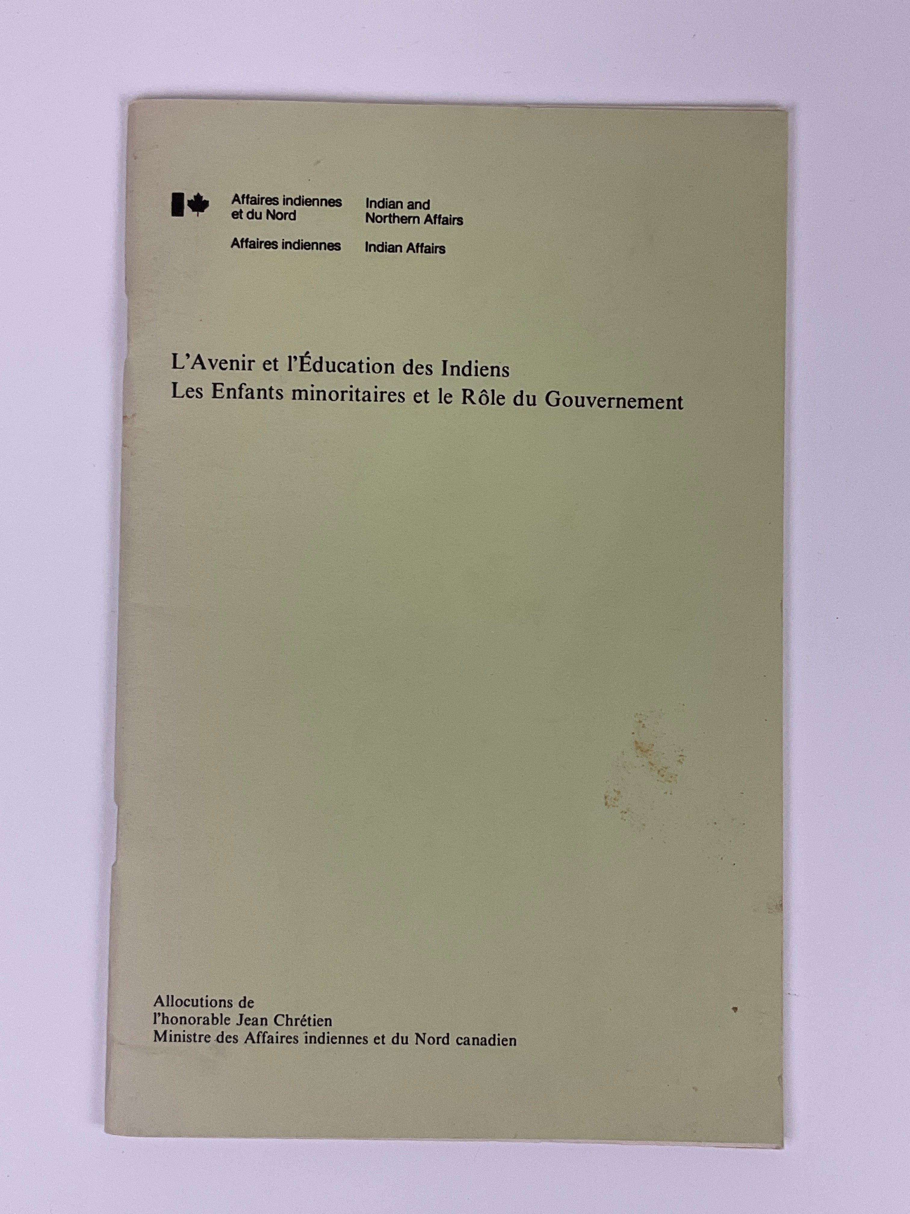 A slender pamphlet containing the full text of two speeches delivered in 1972 by the Honourable Jean Chrétien during his tenure as Canada’s Minister of Indian Affairs and Northern Development—prior to his later role as Prime Minister.