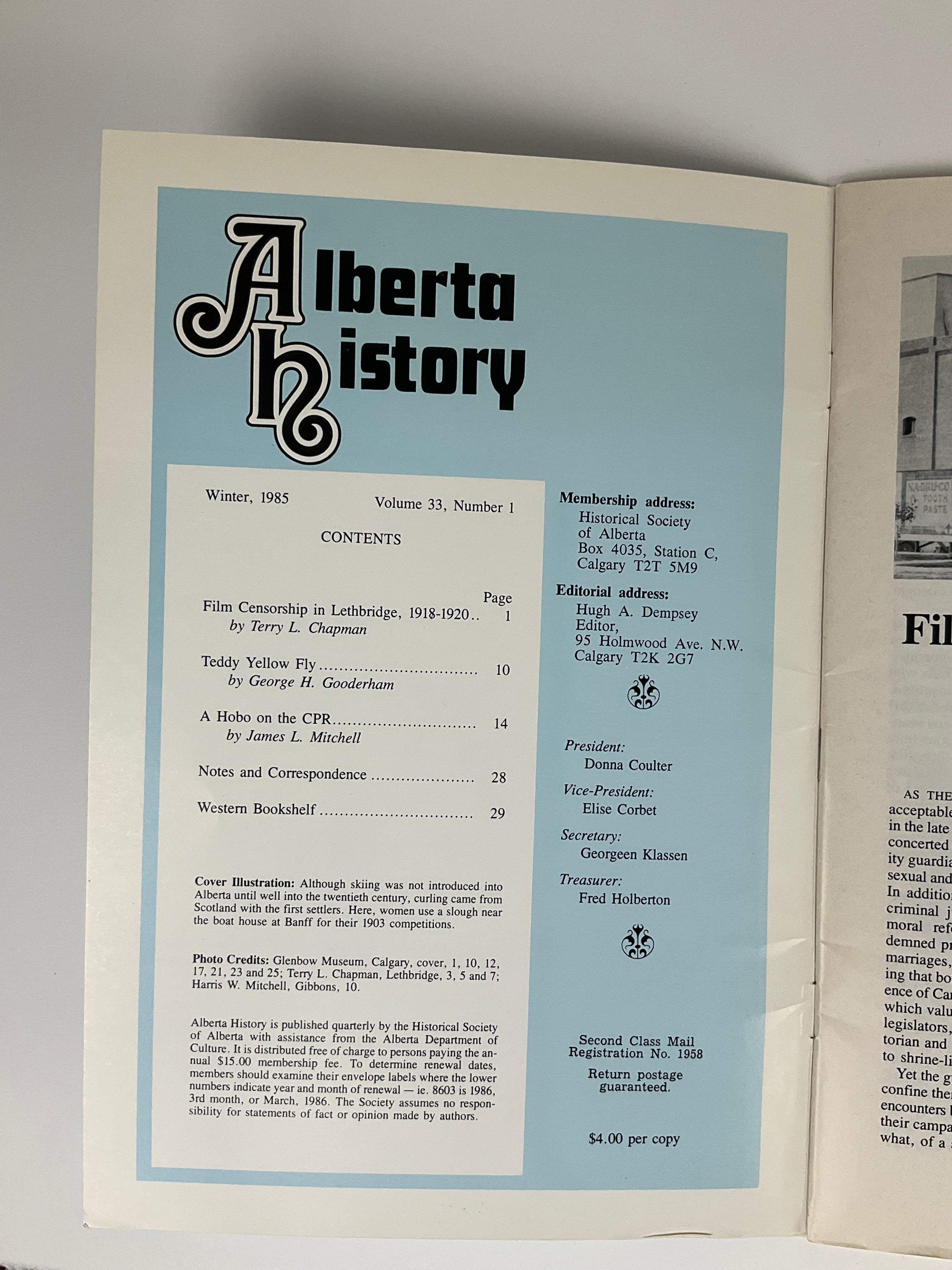 First published in 1953 as a quarterly by the Historical Society of Alberta, the Alberta Historical Review was renamed Alberta History in 1975. The publication features both academic and popular historical content. This issue features articles on Film Censorship in Lethbridge, Tenting In Edmonton, Hoboing on the CPR circa 1904, and a profile of Teddy Yellow Fly.
