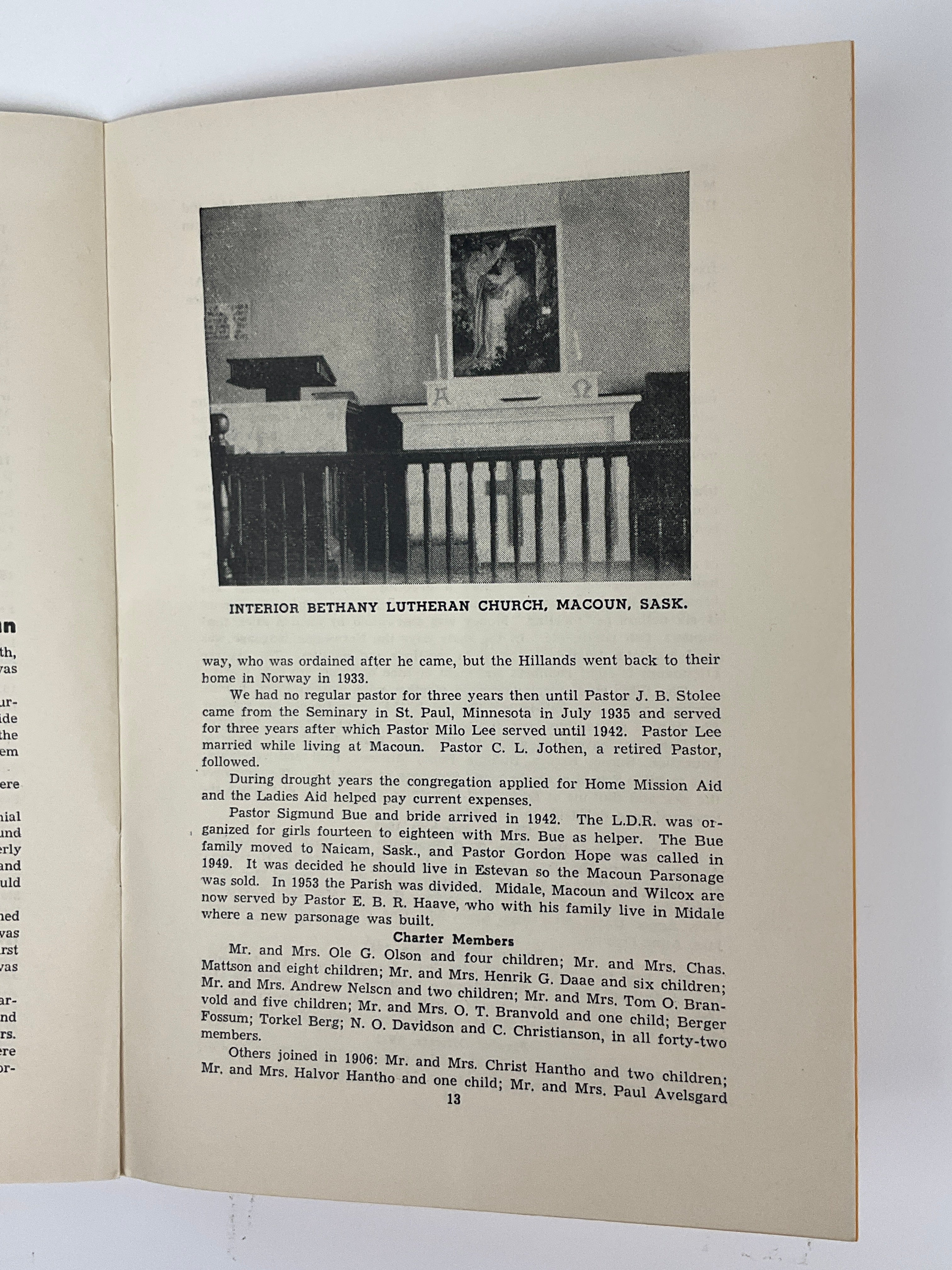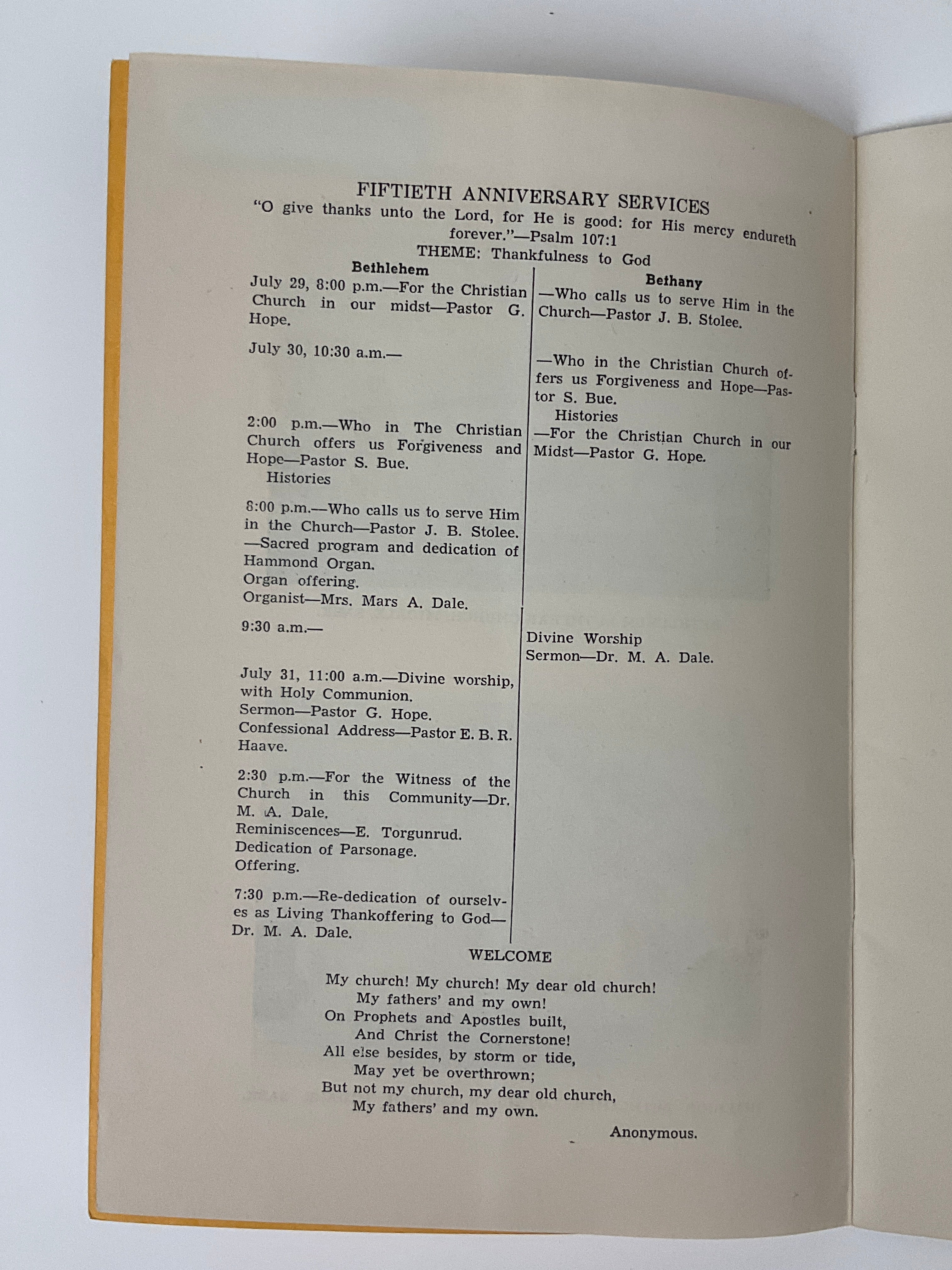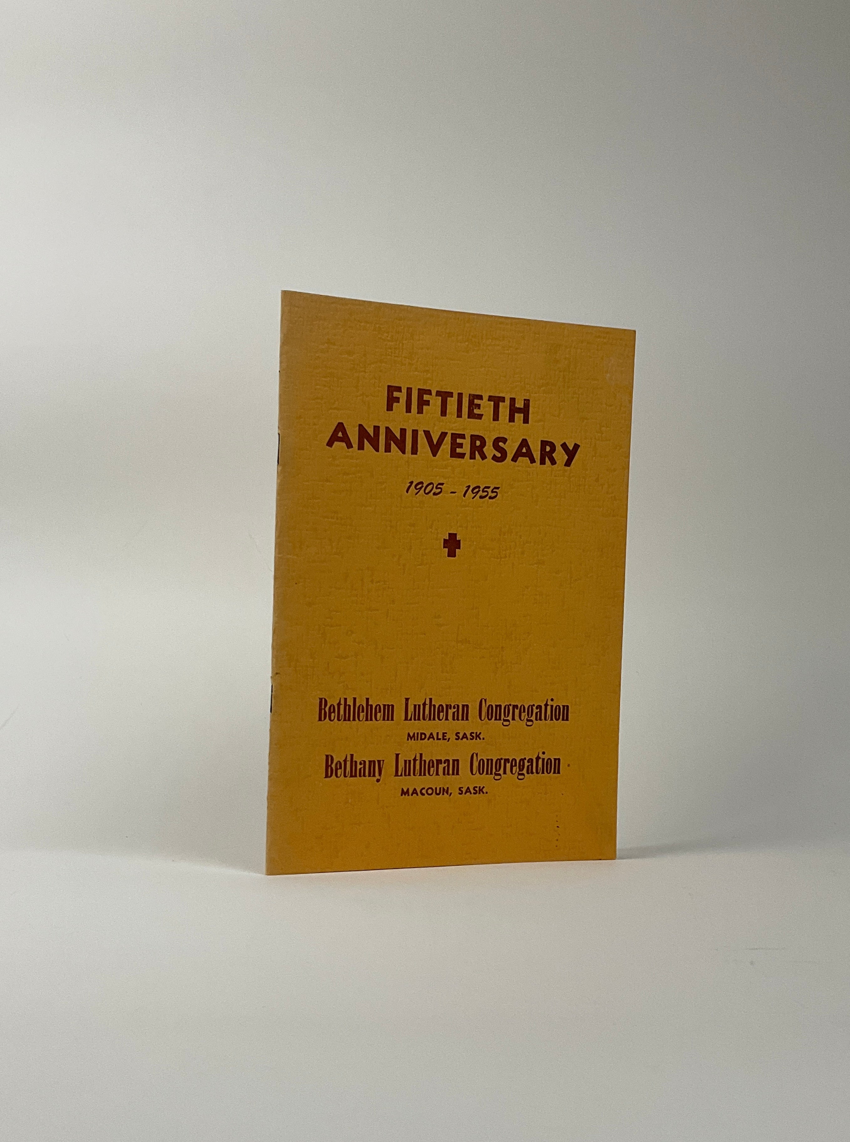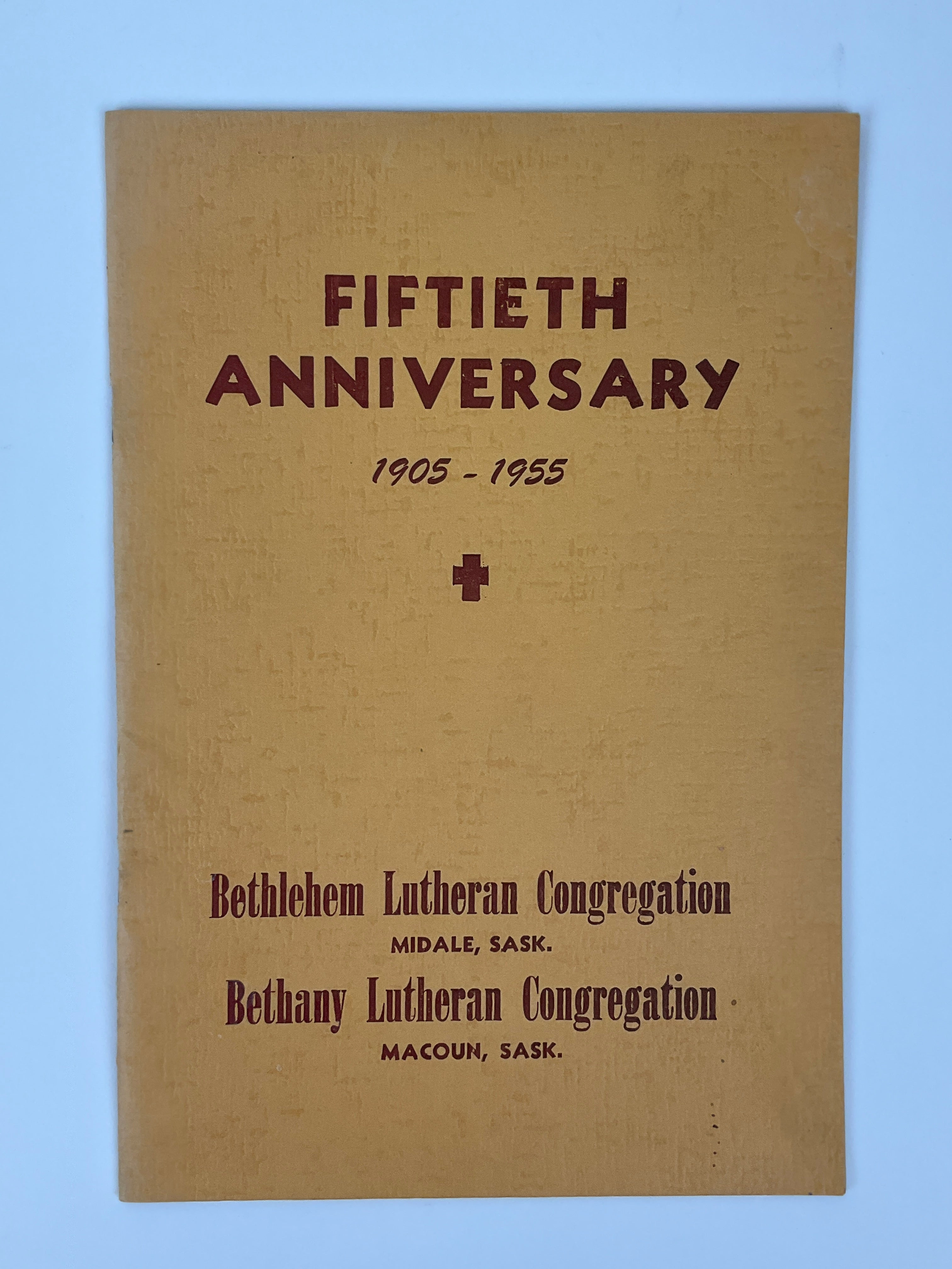 Slim commemorative pamphlet issued to mark the fiftieth anniversary (1905–1955) of the Bethlehem Lutheran Congregation (Midale, Saskatchewan) and the Bethany Lutheran Congregation (Macoun, Saskatchewan), which shared a minister. Contents include a concise programme of the anniversary services, a chronological list of pastors who served the two congregations, brief historical overviews of each congregation, summaries of associated church organizations, and a record of confirmation class graduates from 1912 to 1955.