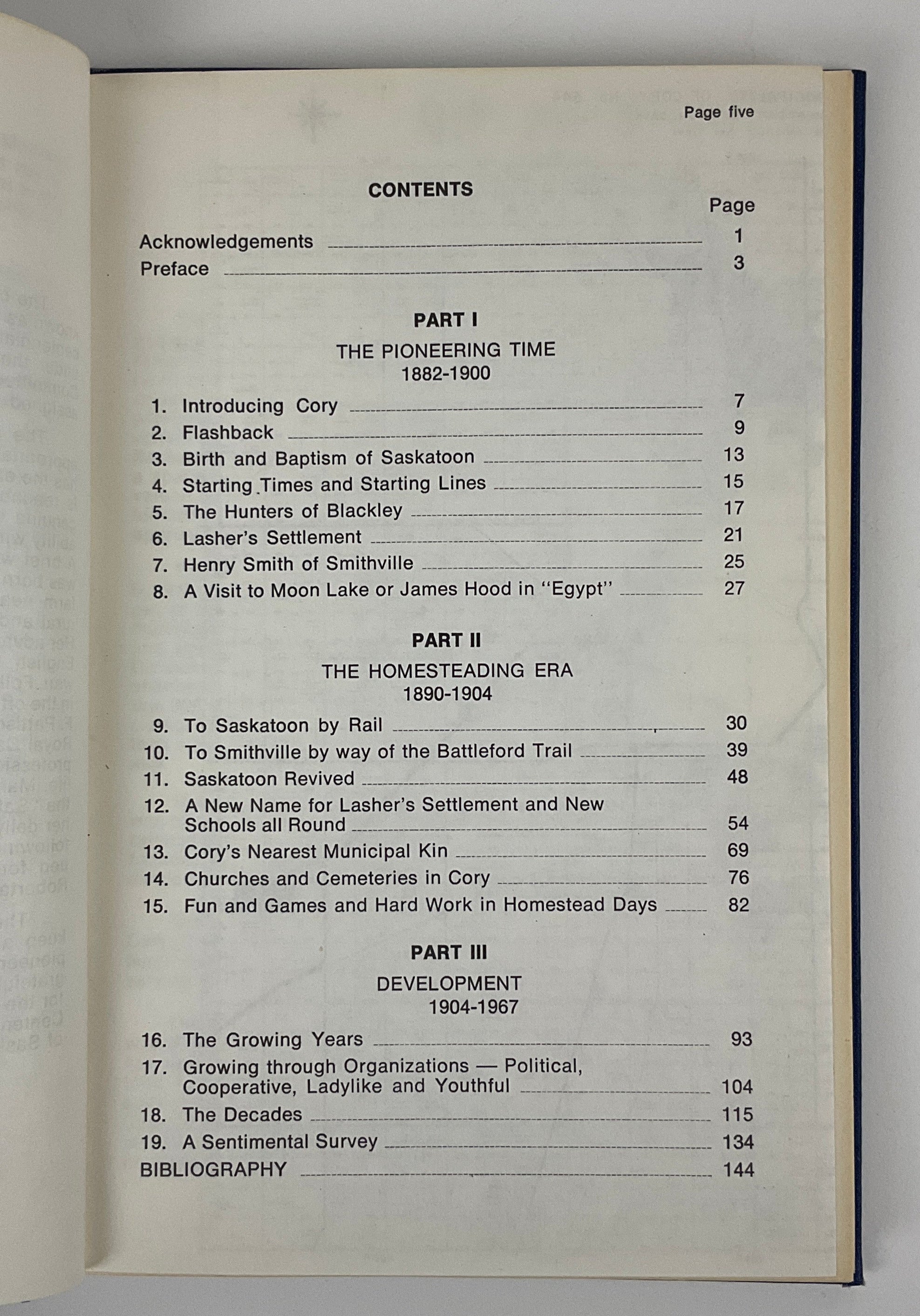 The Centennial Committee of Saskatchewan’s Rural Municipality of Cory #344 (now part of the Rural Municipality of Corman Park #344, surrounding Saskatoon) commissioned prolific CBC radio drama author Mary Pattison to write this municipal history. Pattison divides the region’s history into three overlapping periods, running from the early 1880s until 1967. She recounts the arrival of pioneers, the establishment of homesteads, and the growth of local infrastructure, articulating regional themes in development through stories of individual families. Includes 22 x 25 cm (8.5 x 10 in) fold-out map. No publication date indicated, but the"Acknowledgements" section's 1967 dating suggests a publication year of 1967 or later.