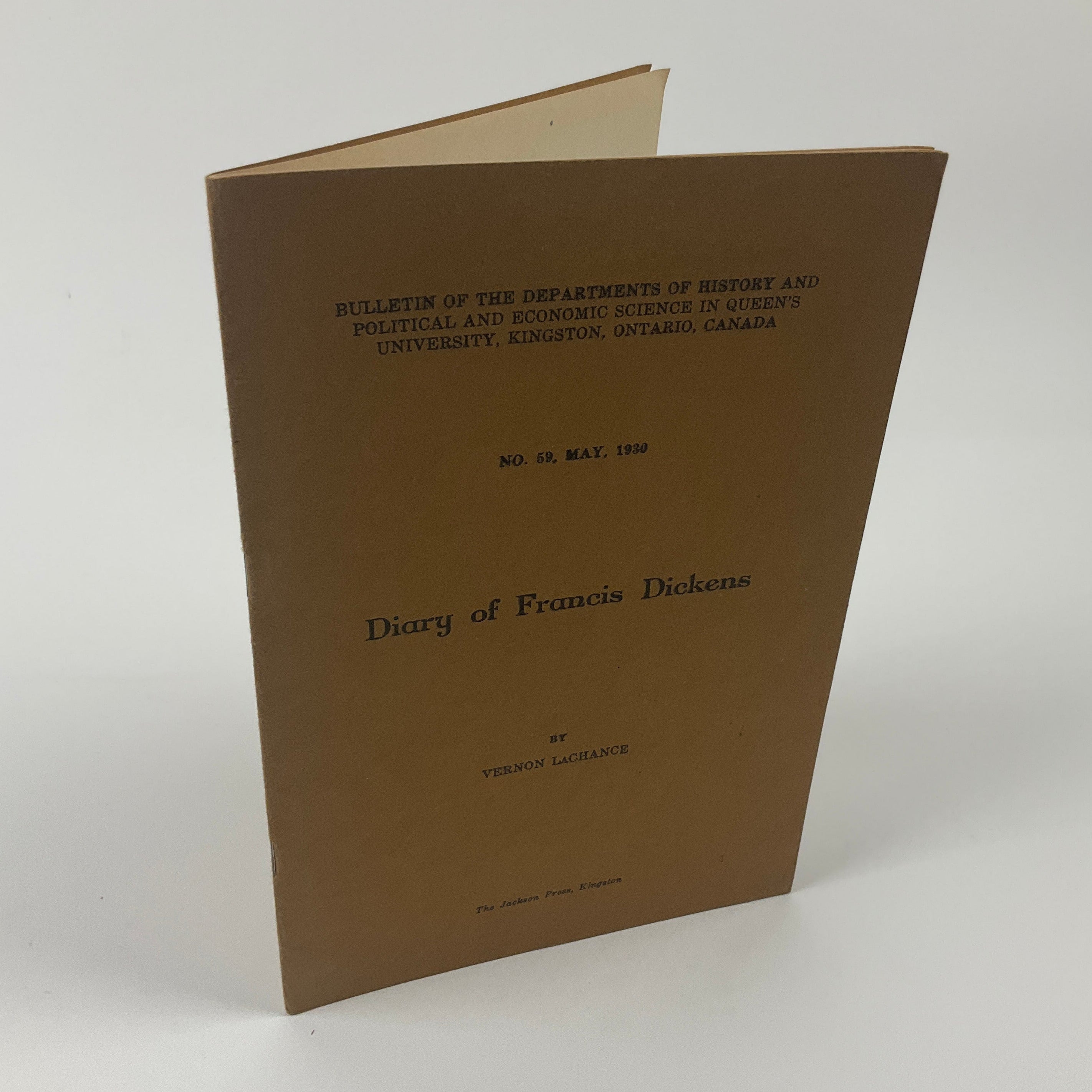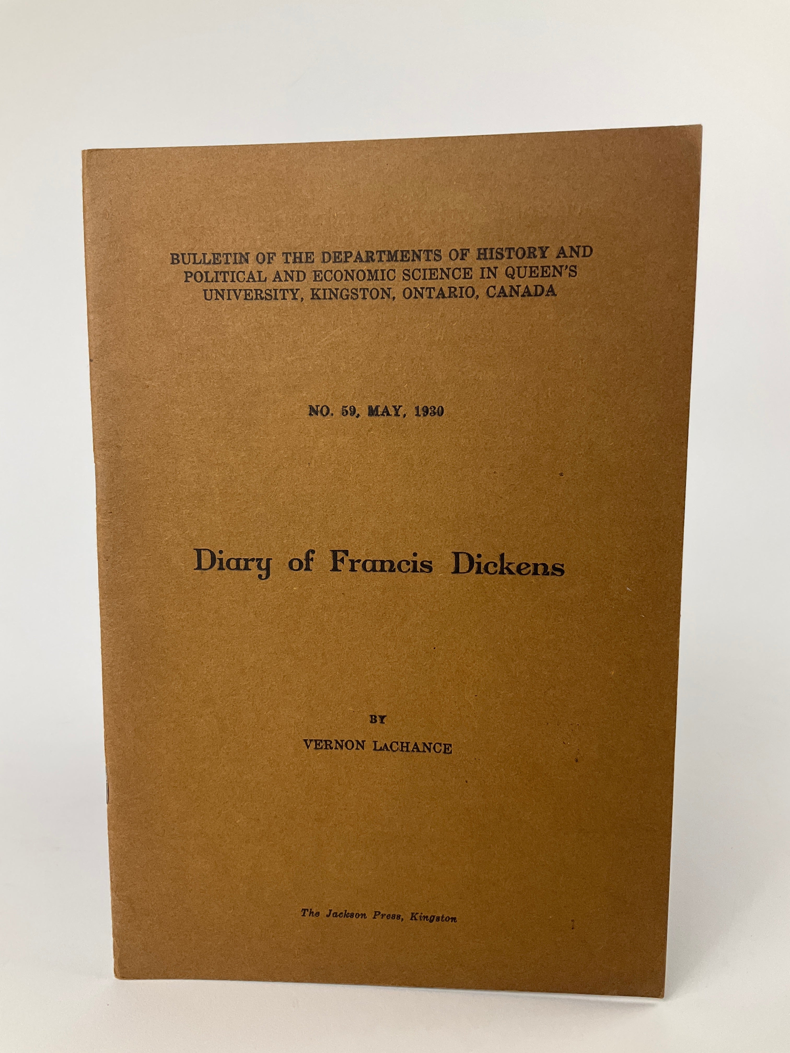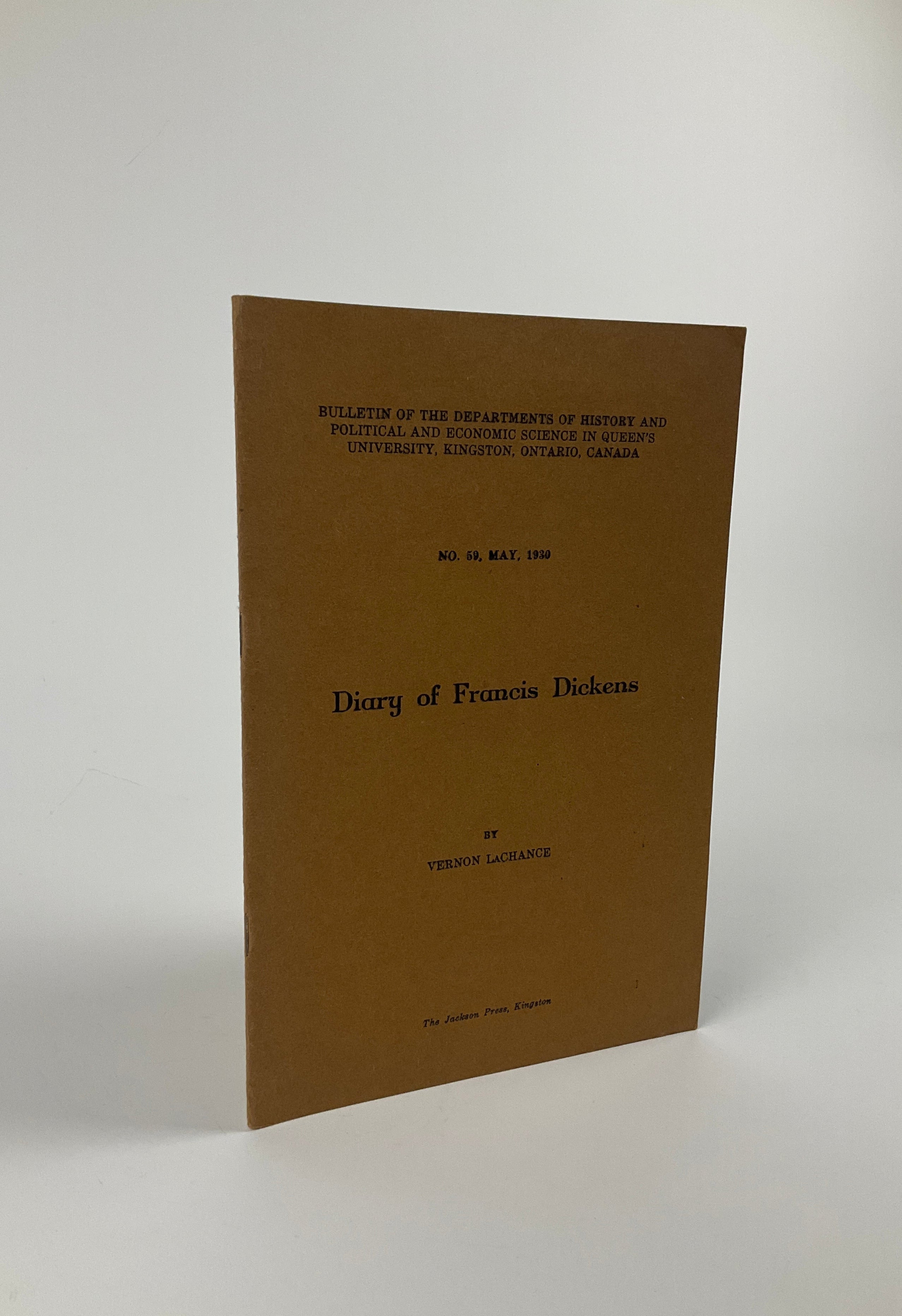Bulletin of the Departments of History and Political and Economic Science in Queen’s University, Kingston, Ontario, Canada, No. 59. Francis Jeffrey Dickens (1844-1886, son of author Charles Dickens) joined the North-West Mounted Police in 1874, rising to Inspector rank in 1880. Dickens oversaw Fort Pitt’s defense during the 1885 North-West Resistance, when Métis and Indigenous groups clashed with Canadian militia and the NWMP in present-day Saskatchewan and Alberta. This volume reprints Dickens’ diary from Mar. 4 – Apr. 15, 1885 and contains an understated, precise account of life at Fort Pitt amidst growing confrontation and violence. He records news of the Frog Lake Massacre, notes the growing threat of Resistance forces in the region, and concludes with the events leading up to the Apr. 15 Battle at Fort Pitt and the NWMP's subsequent departure. Contextual remarks and commentary by Vernon LaChance begin and end the volume. Peel(3) 1431.