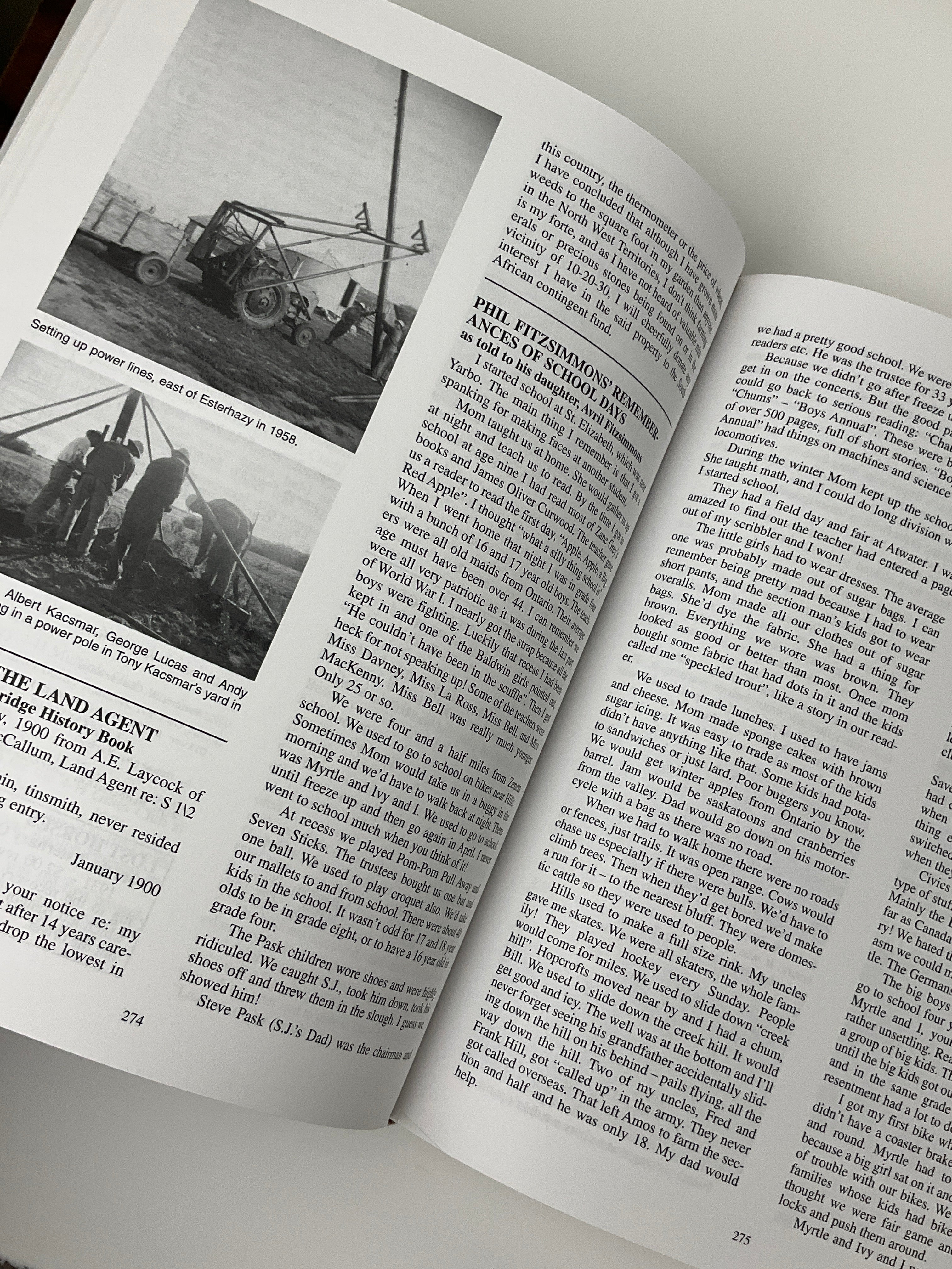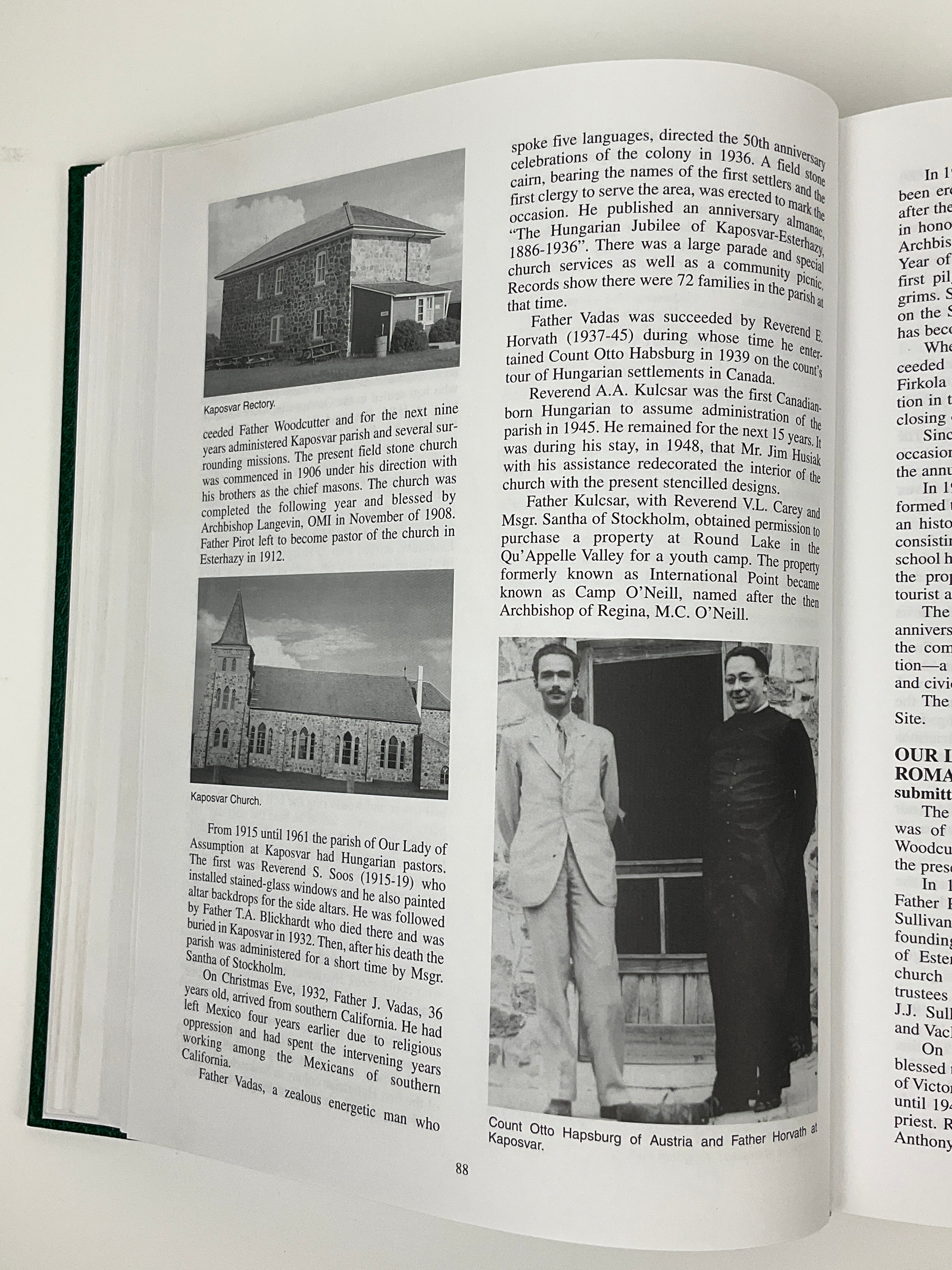 Esterhazy And Area : From Past To Present 95 Years Of History 1903-1998. This is the community history for Esterhazy, a town located in southeastern Saskatchewan within the Rural Municipality of Fertile Belt No. 183. The volume outlines the town’s development over nearly a century, with sections devoted to key community institutions, including churches, schools, medical services, law enforcement, service clubs, sports and recreation, local businesses, and agriculture. Also included are brief historical notes on surrounding settlements—Yarbo and Zeneta—as well as concise entries on area schools: Kingslynn, Kolin, St. Elizabeth, St. Istvan, and Zeneta. The bulk of the volume consists of contributed family histories. Includes a family name index.