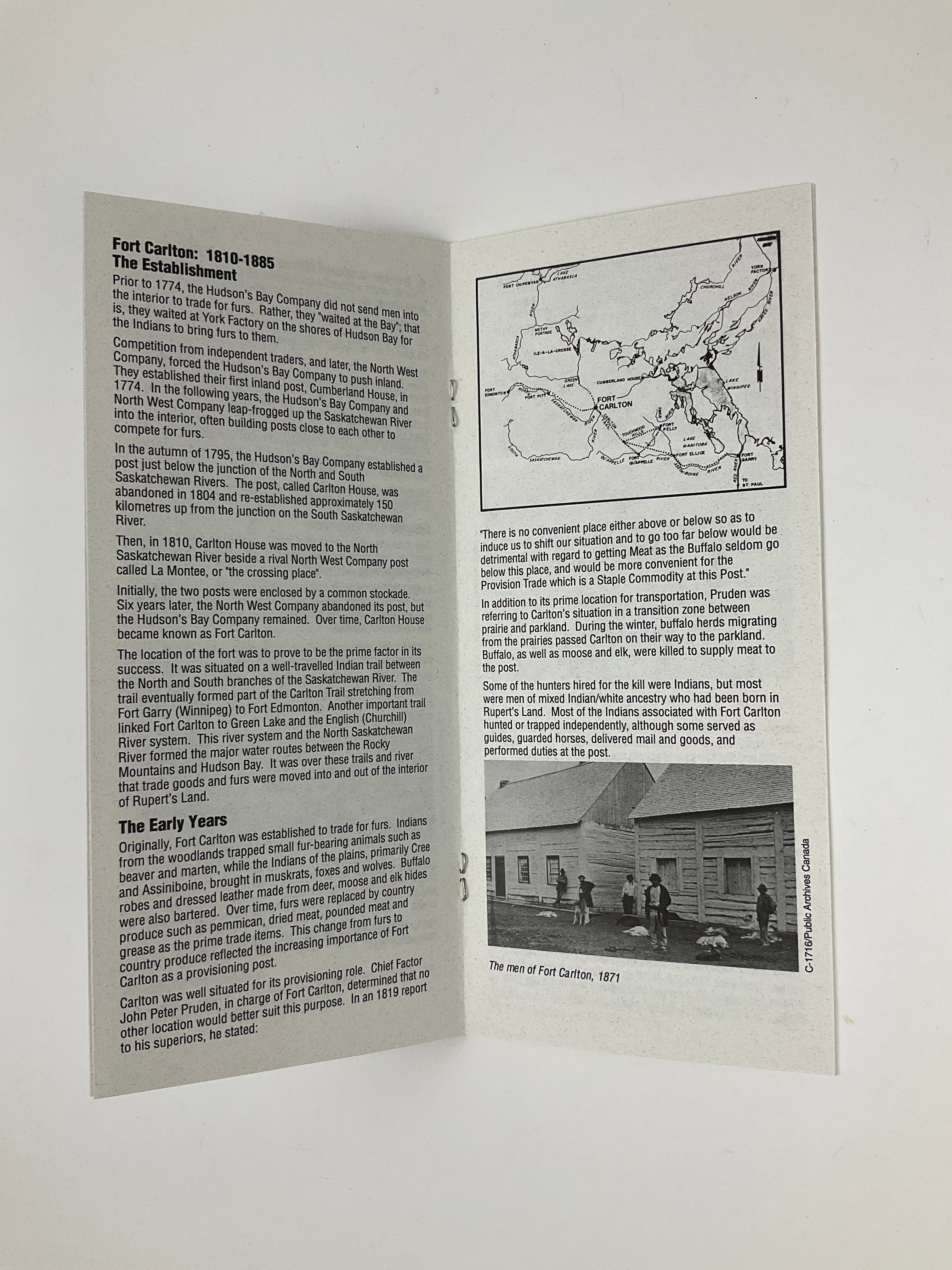 This brochure outlines the features that visitors can encounter at Saskatchewan’s Fort Carlton Provincial Park. The text forms a self-guided tour, explaining the functions of various site buildings as well as the Fort’s role as a fur trading post in the 19th century North-West. The brochure also provides a succinct historical overview of Fort Carlton, tracing the Fort’s history from its founding in 1810 through its burning following the 1885 North-West Resistance. No publication date indicated, but a 1983 item in the “Further Reading” section suggests a publication date of 1983 or later.