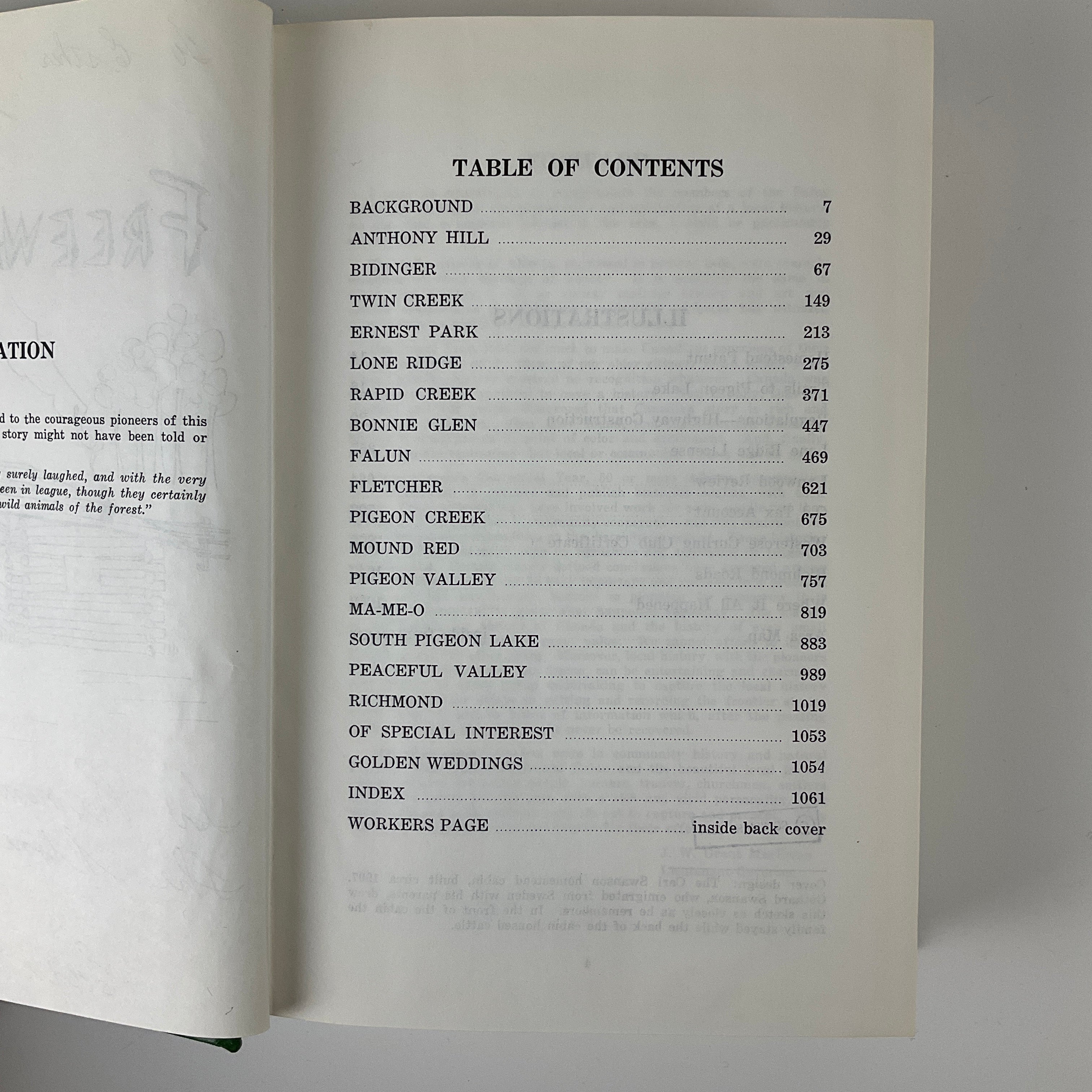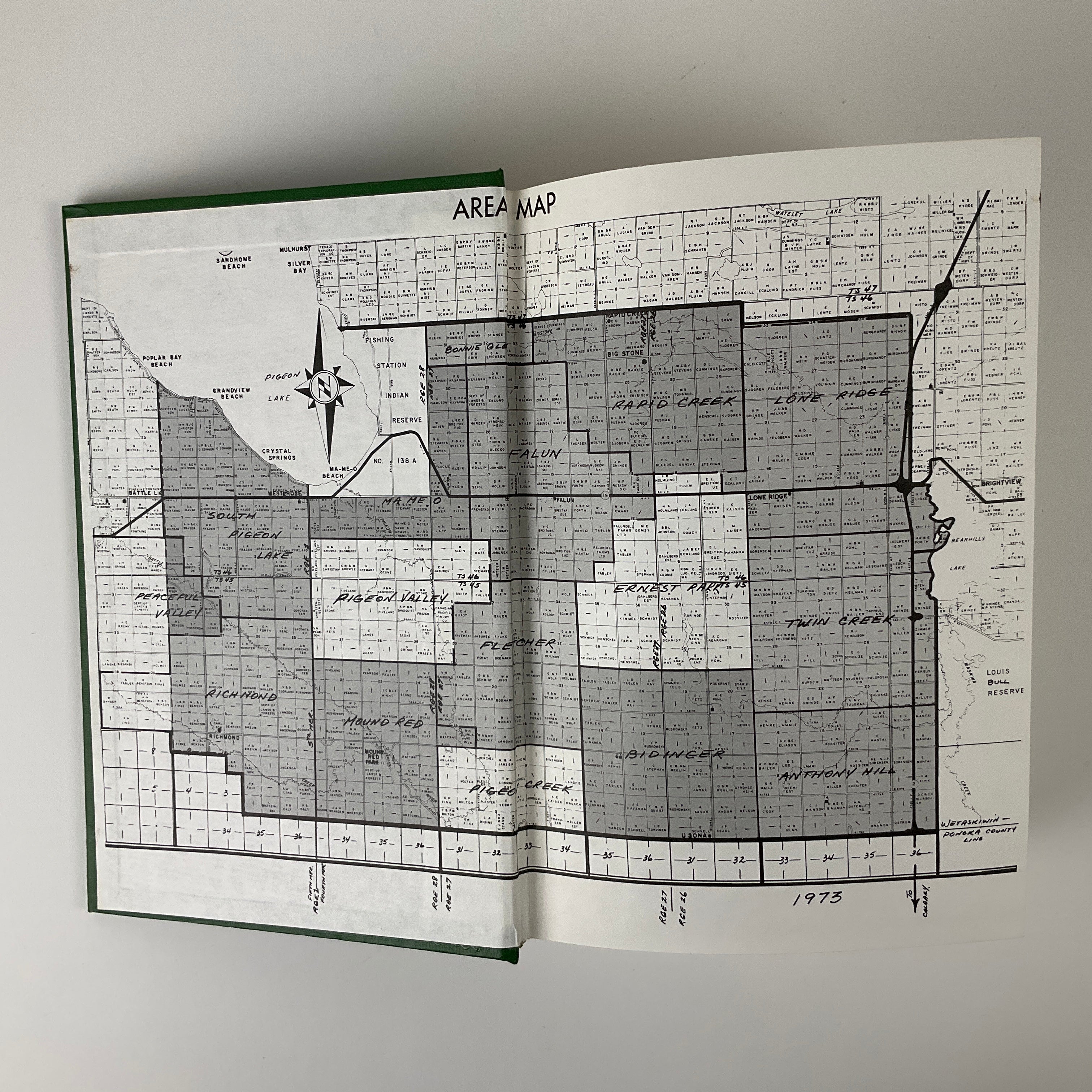 This thick, 16 x 23 cm (6.3 x 9 in) book contains a community history of the hamlet of Falun (in Alberta’s County of Wetaskiwin #10) and its surrounding school districts. Districts covered in the book include Anthony Hill, Bidinger, Bonnie Glen, Ernest Park, Fletcher, Lone Ridge, Ma-Me-O, Mound Red, Peaceful Valley, Pigeon Creek, Pigeon Valley, Rapid Creek, Richmond, South Pigeon Lake, and Twin Creek. Each chapter covers a specific district and opens with a short historical overview, a list of teachers, and a list of homesteaders/section owners. The largest component of each chapter consists of a combination of family histories contributed by area residents and topical histories (of churches, organizations, events, etc.). A short photo section concludes each chapter. Includes index.