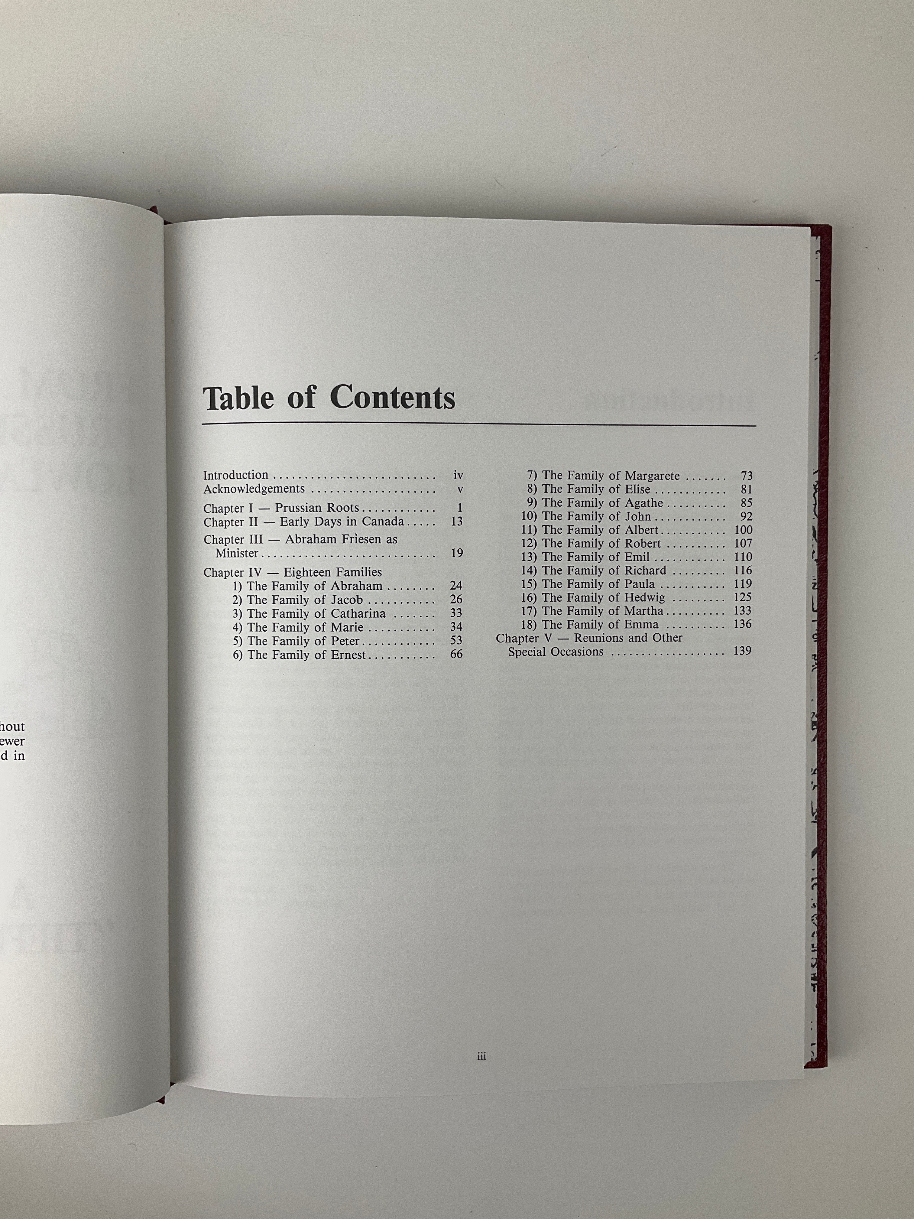 This volume contains a family history of Abraham Friesen, his first (Catharina) and second (Margarete) wives, and their descendants. Friesen immigrated from Europe to Saskatchewan in 1894. The volume begins with a history of the Friesen family in nineteenth century Prussia, an account of Abraham and Margarete’s journey to Canada, and a brief chapter on Abraham’s career as a Mennonite preacher. The book then presents the histories and family trees of eighteen descendants from Abraham and Catharina/Margarete’s lineage: Abraham, Agathe, Albert, Catharina, Elise, Emma, Emil, Ernest, Hedwig, Jacob, John, Margarete, Marie, Martha, Paula, Peter, Richard, and Robert.