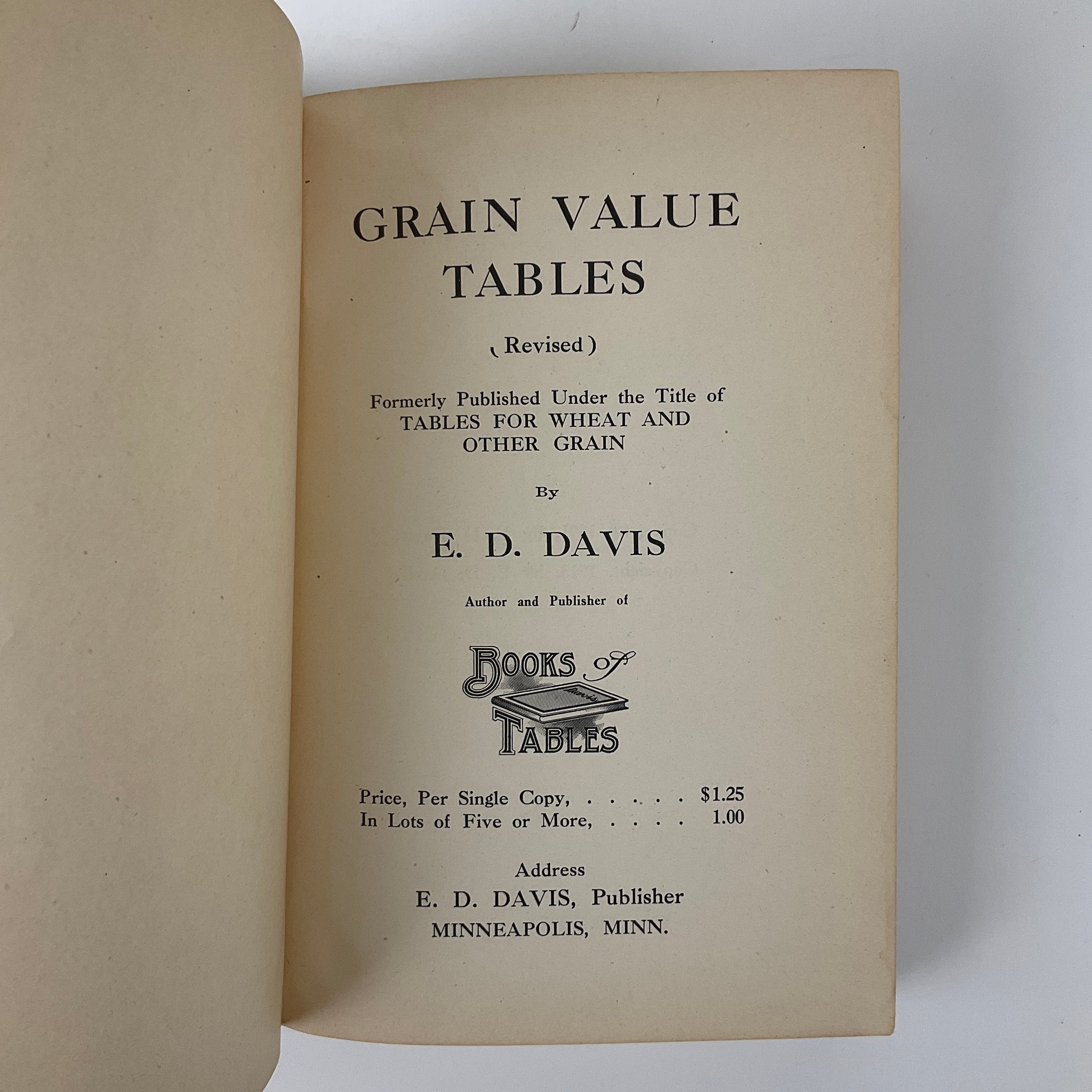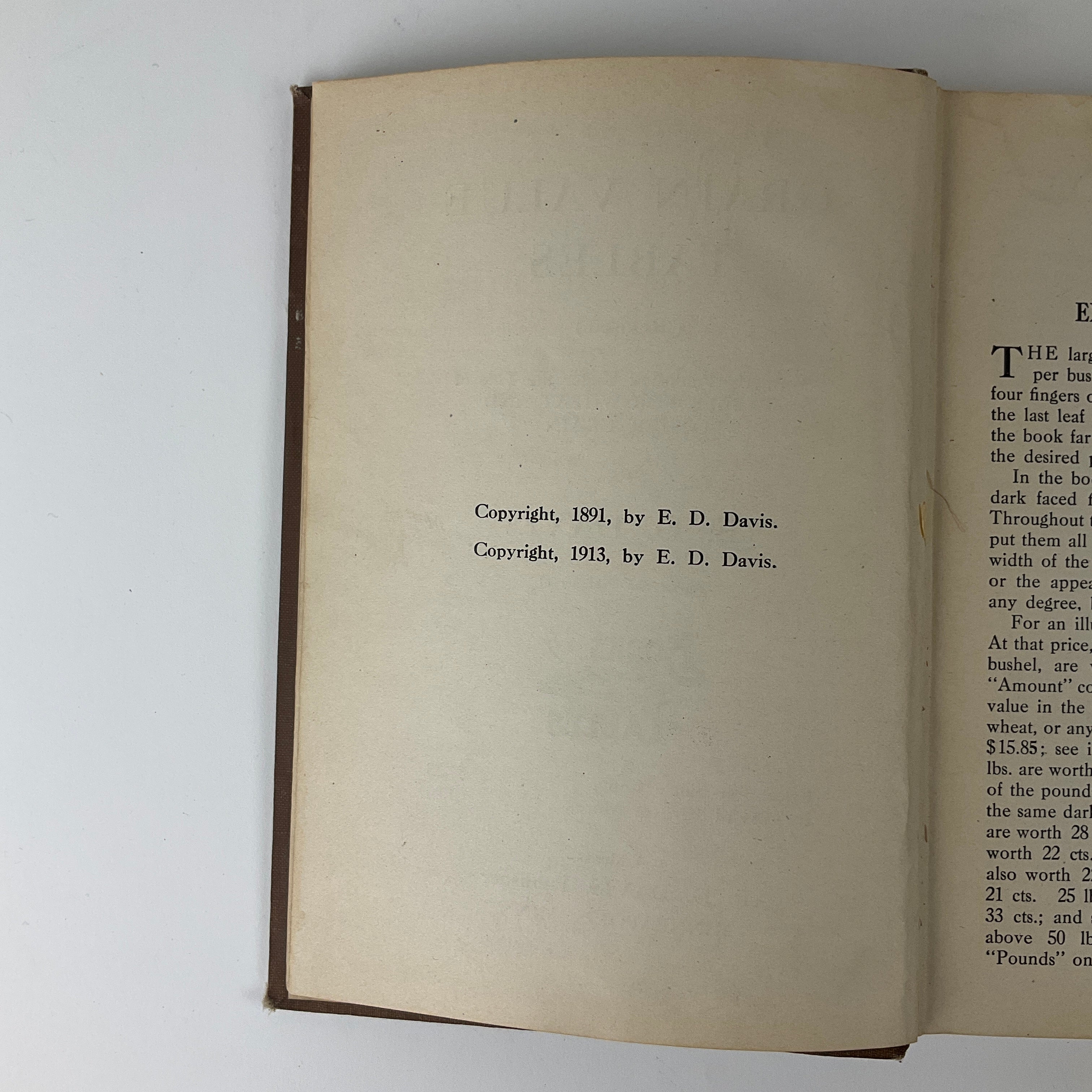 In this book, Edward Douglas Davis provides reference charts for determining grain value at various bushel weights. The volume opens with an explanation of how to read the charts, as well as how to measure the contents of grain bins, corn cribs, and coal bins. The book closes with a brief advertisement offering Davis’s other chart publications (for figuring interest, determining the number of days between two dates, calculating foreign exchange rates, etc.).
