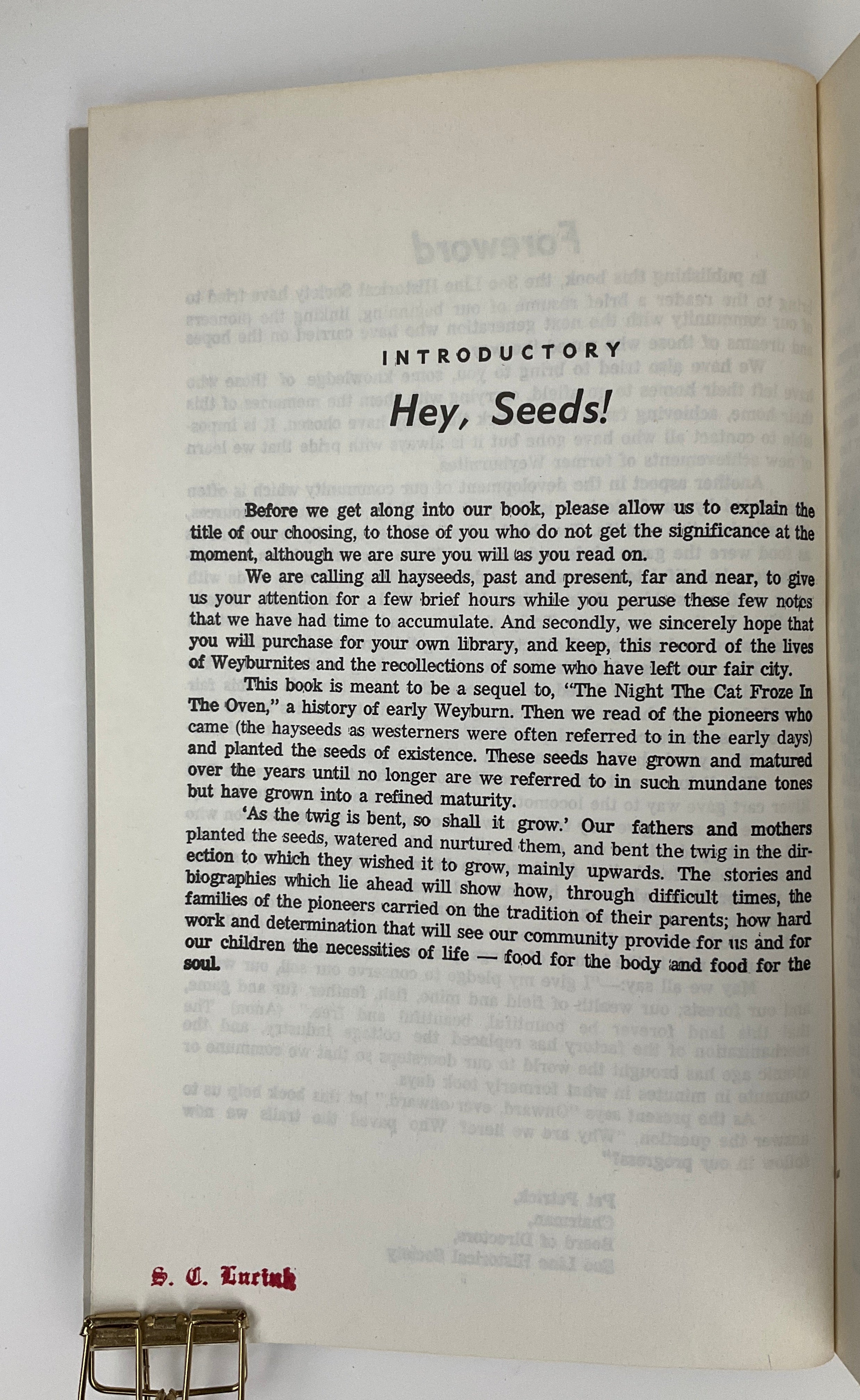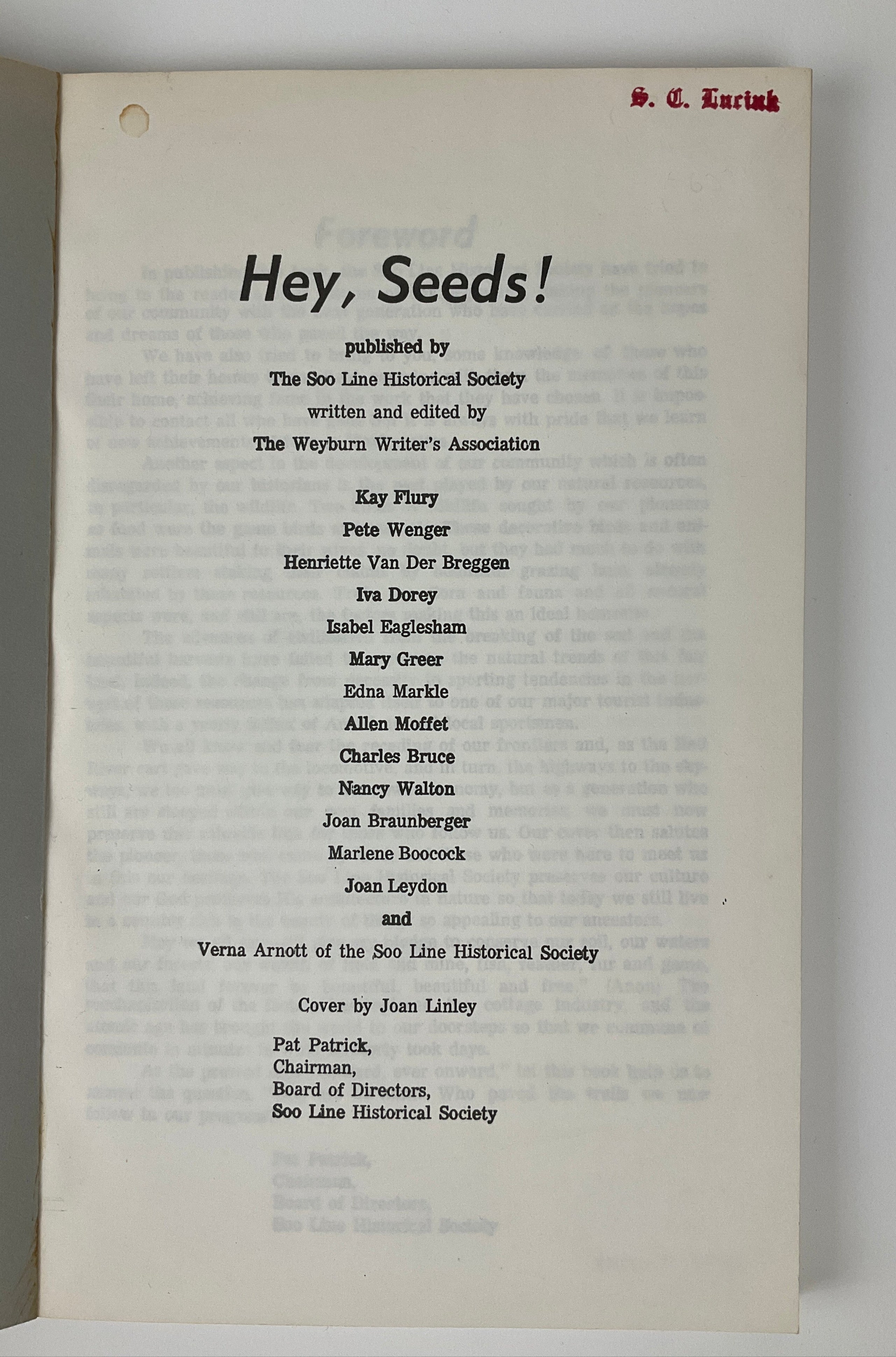 “Hey, Seeds!” is a collaborative history of Weyburn, Saskatchewan. The volume collects biographies of early, current, and former residents (including those who served on Town Council), memories of city life, and historical sketches of Weyburn’s businesses, churches, organizations, and schools. “Hey, Seeds!” is intended as a sequel to “The Night the Cat Froze in the Oven,” an earlier history of Weyburn. No publication date indicated, but contributors refer to events occurring as late as Dec. 1964 in the past tense while referring to 1965 events in the future tense, making a publication date of 1964 or later likely.