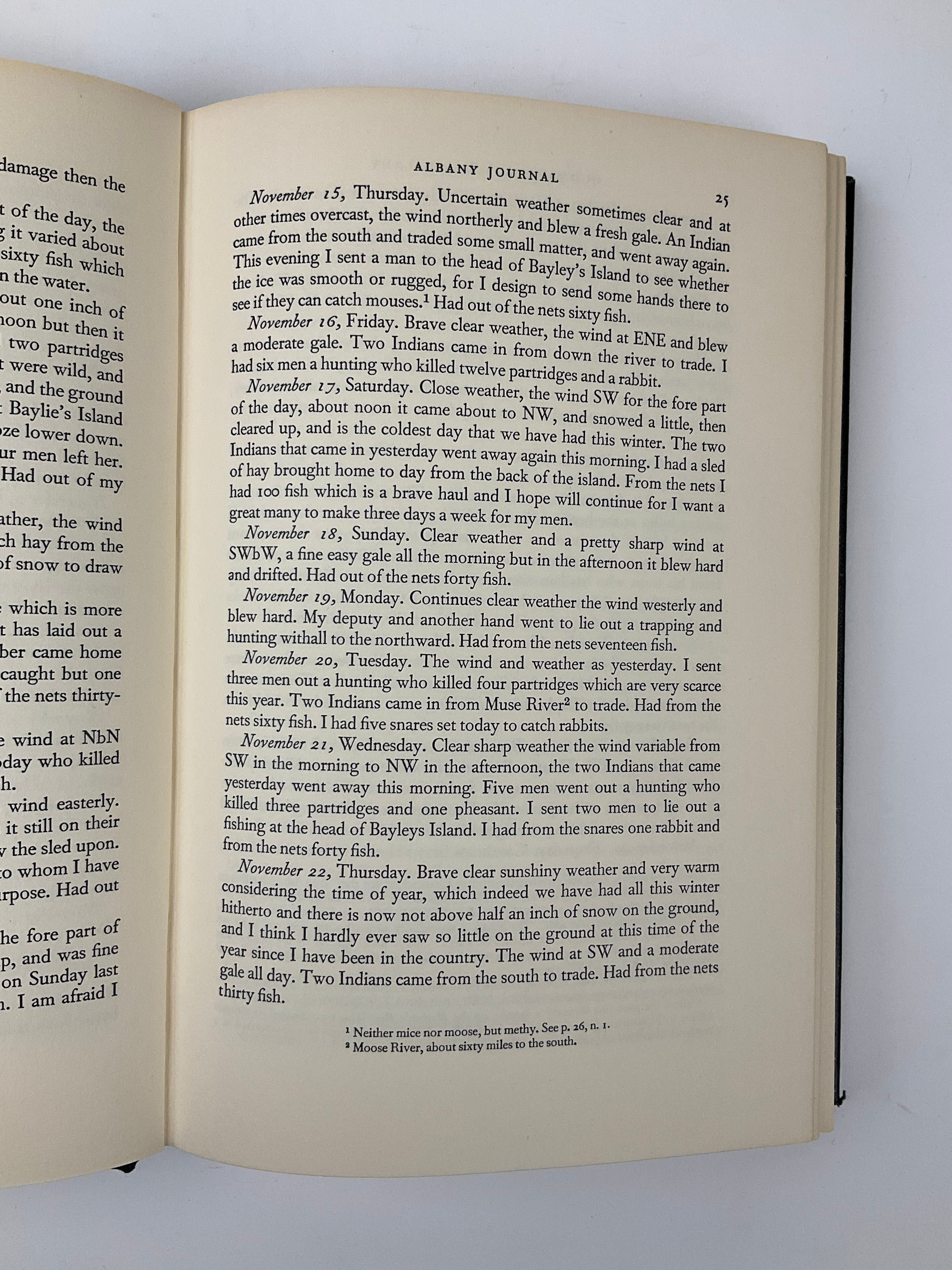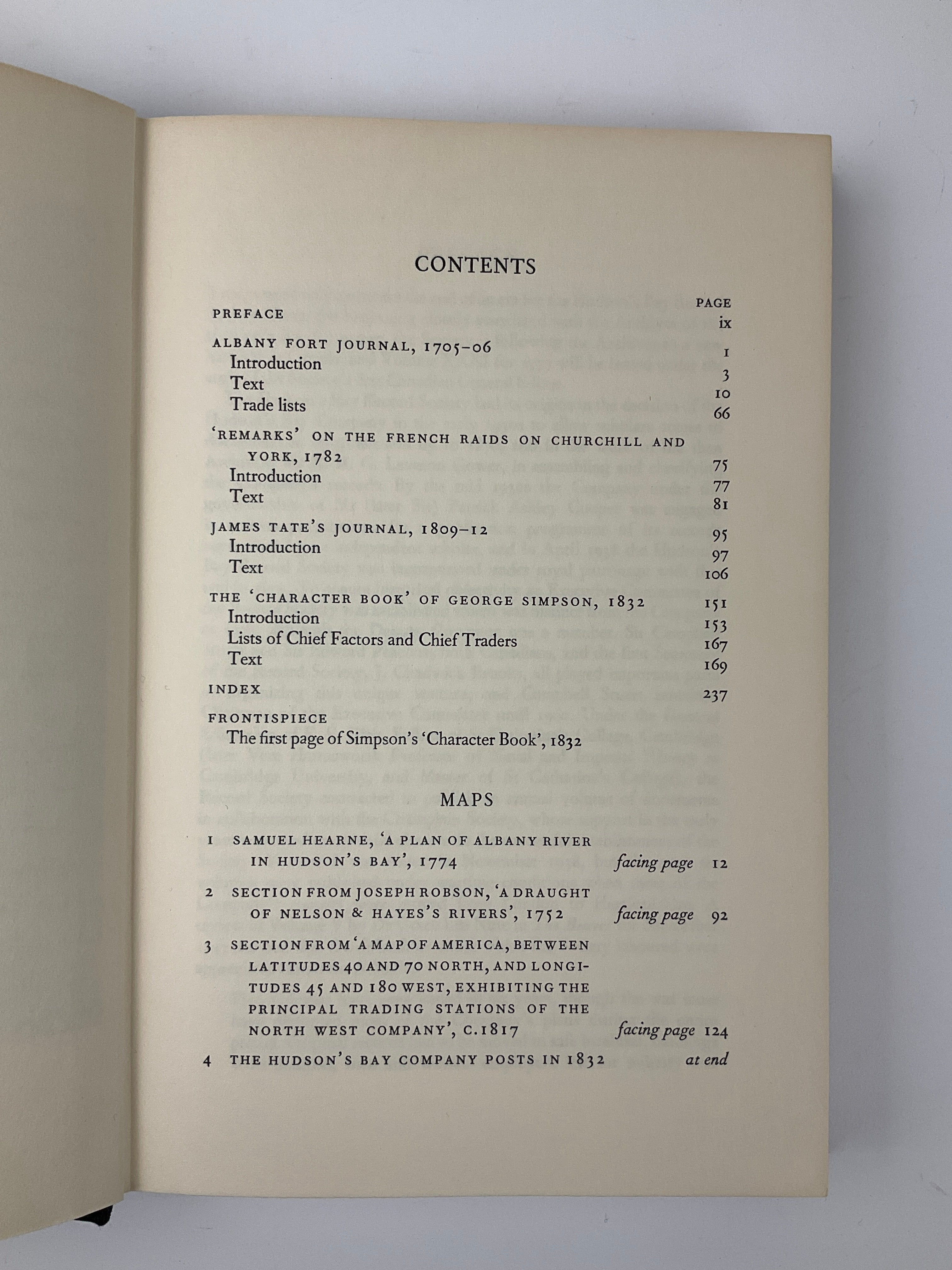 Editor, Glyndwr Williams states in the Preface, "... Volume XXX should in some way, be a commemorative volume; and so he selected for publication four separate documents from the period 1670 to 1870, those two hundred years in the Company's history to which the previous twenty-nine volumes of the Record Society relate. The first document is the Albany journal (B.3/a/I) kept by Anthony Beale in 1705-06. It is the earliest journal from Bay posts to have survived, and as such it is the forerunner of the great series of post journals which form so substantial a source for the history of the Company in the eighteenth and nineteenth centuries. The second document is an anonymous account (E.2/I2,pp.622-42) by a Hudson's Bay officer of the taking and destruction of Prince of Wales Fort, Churchill River, and York Factory, by a French Squadron commanded by La Perouse in 1782. The third document is a narrative (B.57/a/3) by James Tate, a Company labourer at Eagle Lake post, of his experiences in the hands of the Northwesters between 1890 and 1811. The fourth document is perhaps the one of most general interest, Governor George Simpson's celebrated 'Character Book' of 1832 (A.34/2). Probably no single document in the Archives has been used and quoted so extensively, and a critical edition to this remarkable series of confidential entries on the Company's Chief Factors, Chief Traders, clerks and postmasters in the year 1832 ..."