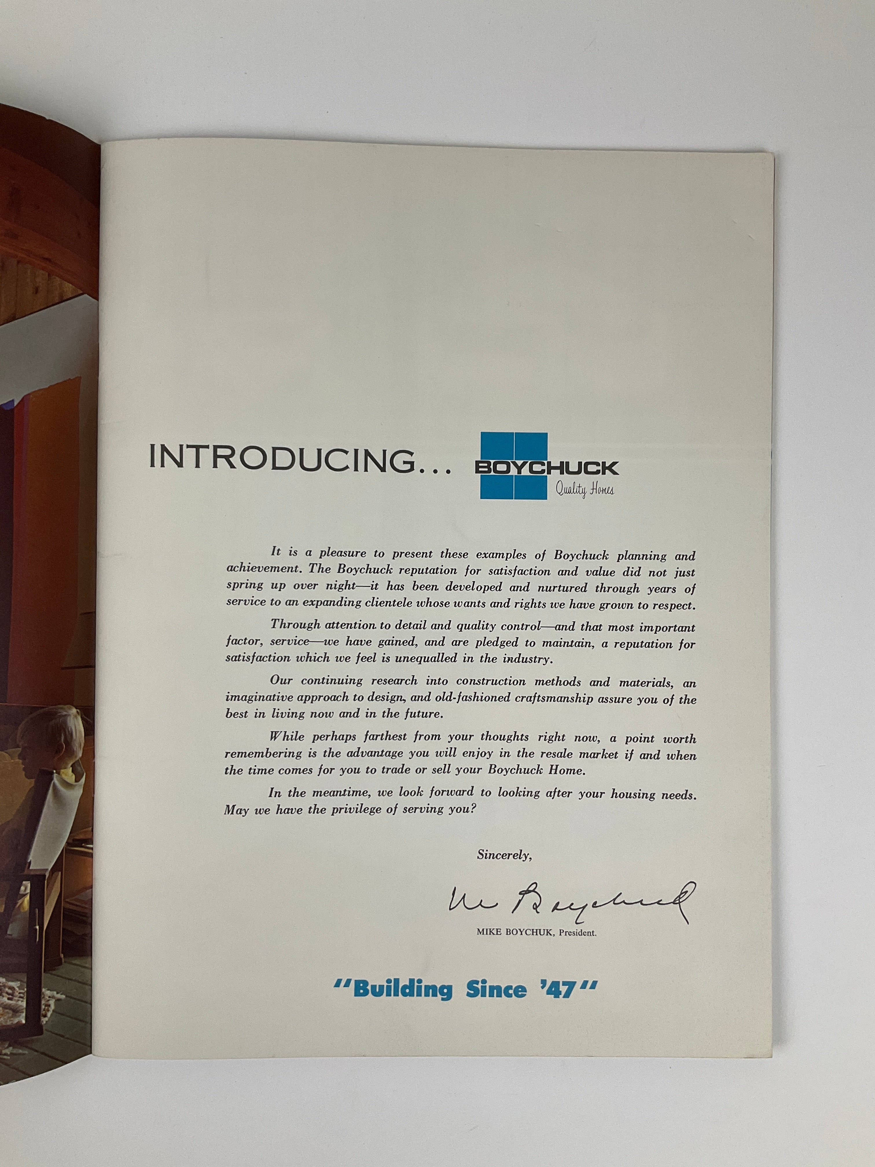 A brochure from Boychuck Construction, showcasing a range of homes and floorplans built by the firm.