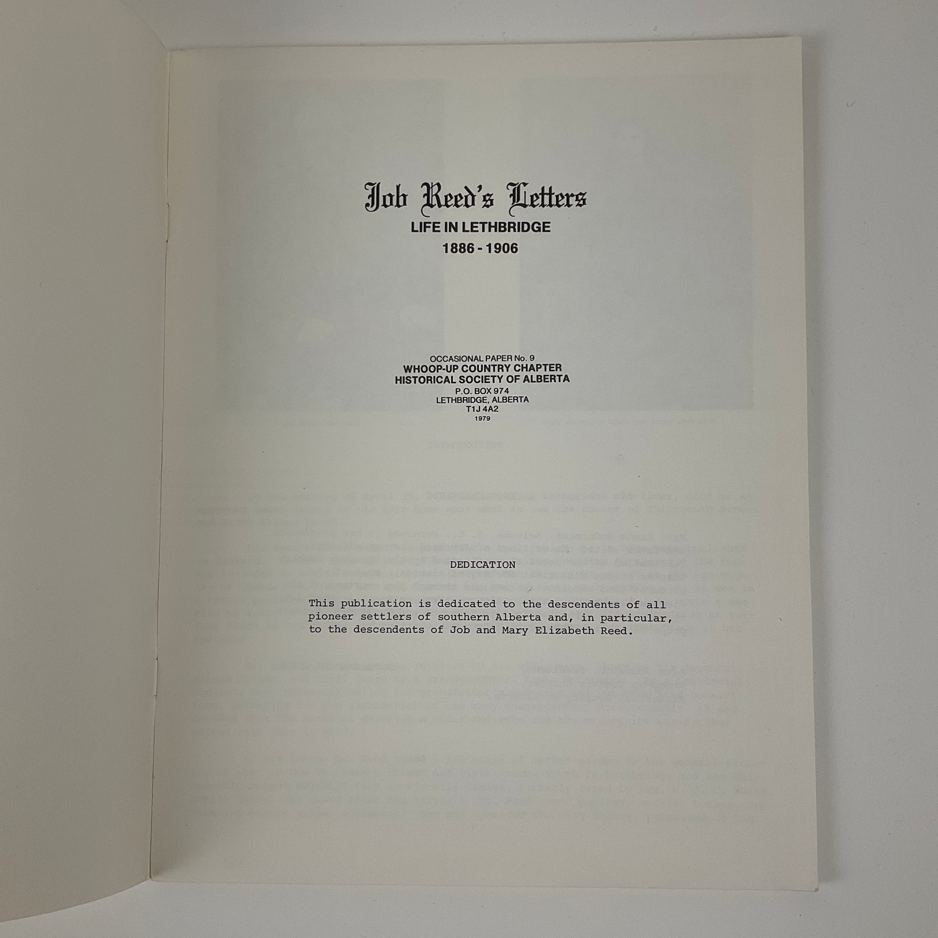 Occasional Paper No. 9, Whoop-Up Country Chapter, Historical Society of Alberta. Job Reed (1841-1906) immigrated from England to Canada with his wife in 1882, and wrote letters that he planned to send back to England as informative accounts of prairie life for potential settlers. This booklet reprints 15 of Reed’s letters written 1884-1905. The letters describe Reed’s work (from mining to market gardening), the trials of prairie life (including cattle lost in snowstorms and floods carrying houses away), and the minutiae of everyday existence (from the cost of butter to playing cricket). Reed also comments on Lethbridge’s growth as a town, remarking on the arrival of new residents and the creation of new services. Editorial remarks provide context and clarification throughout.