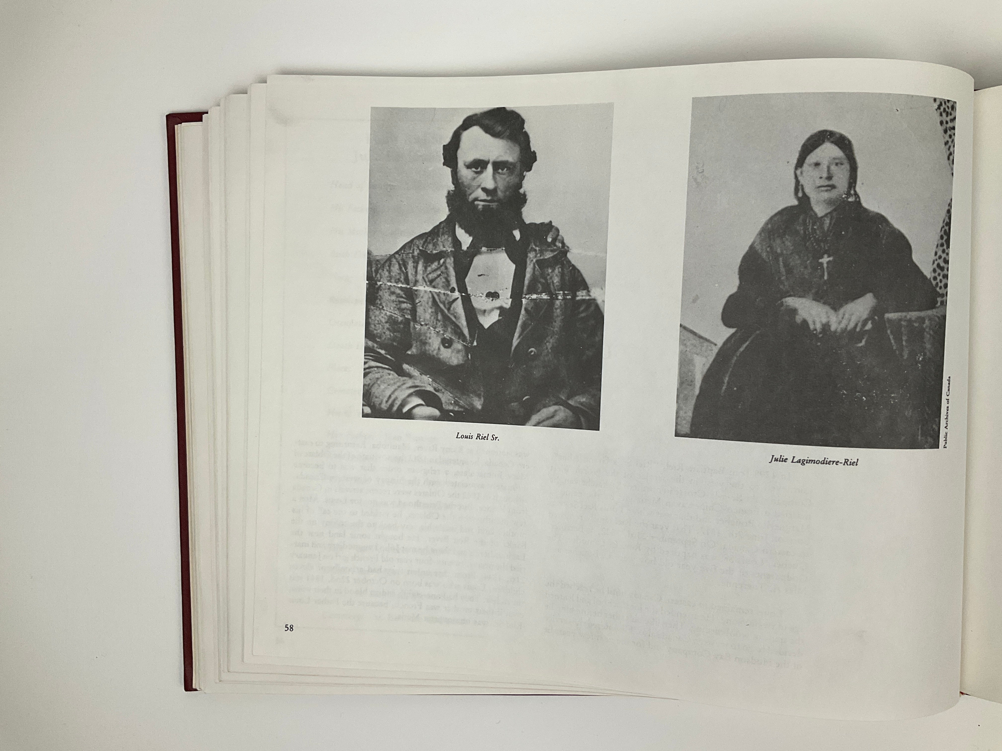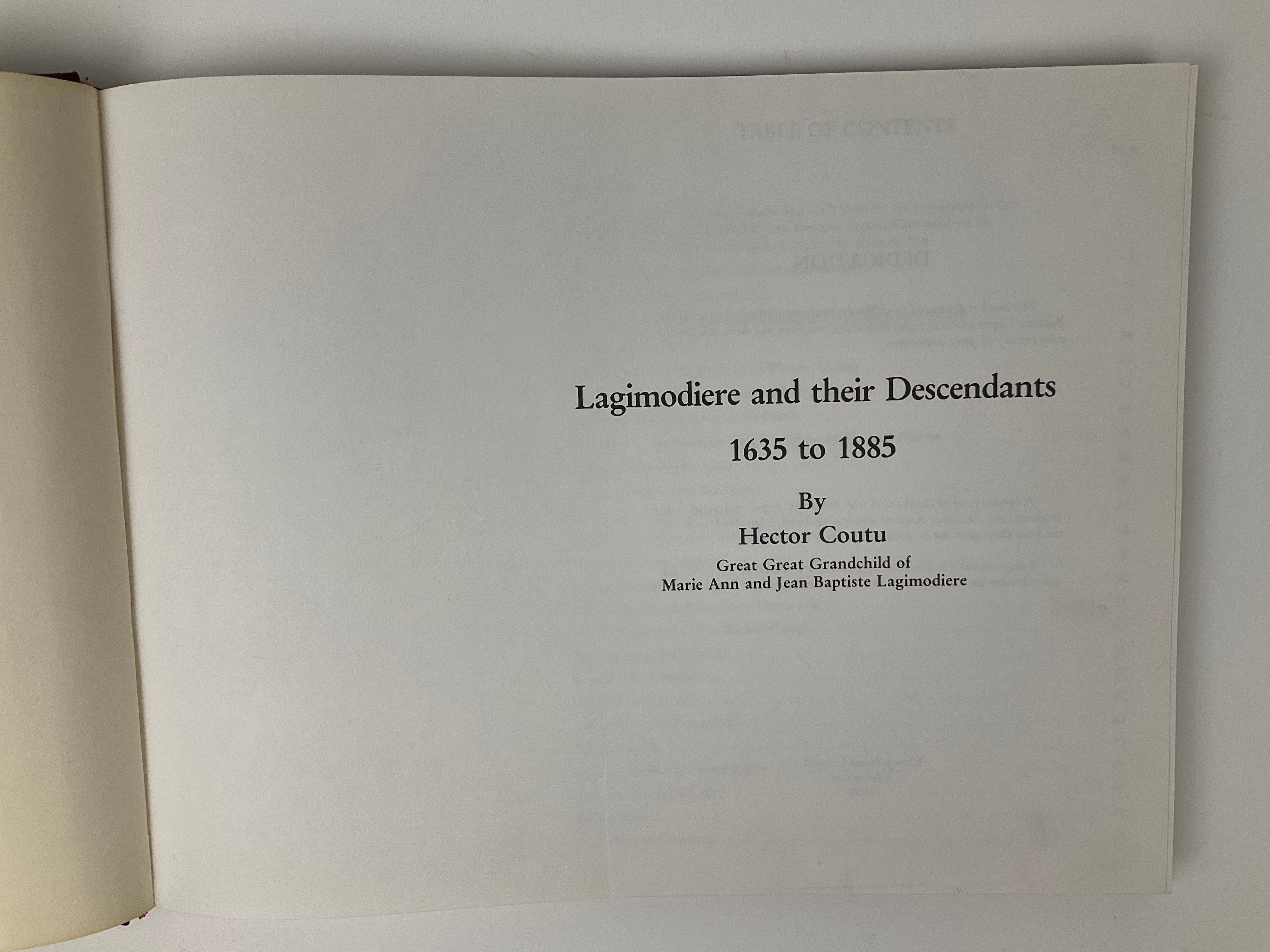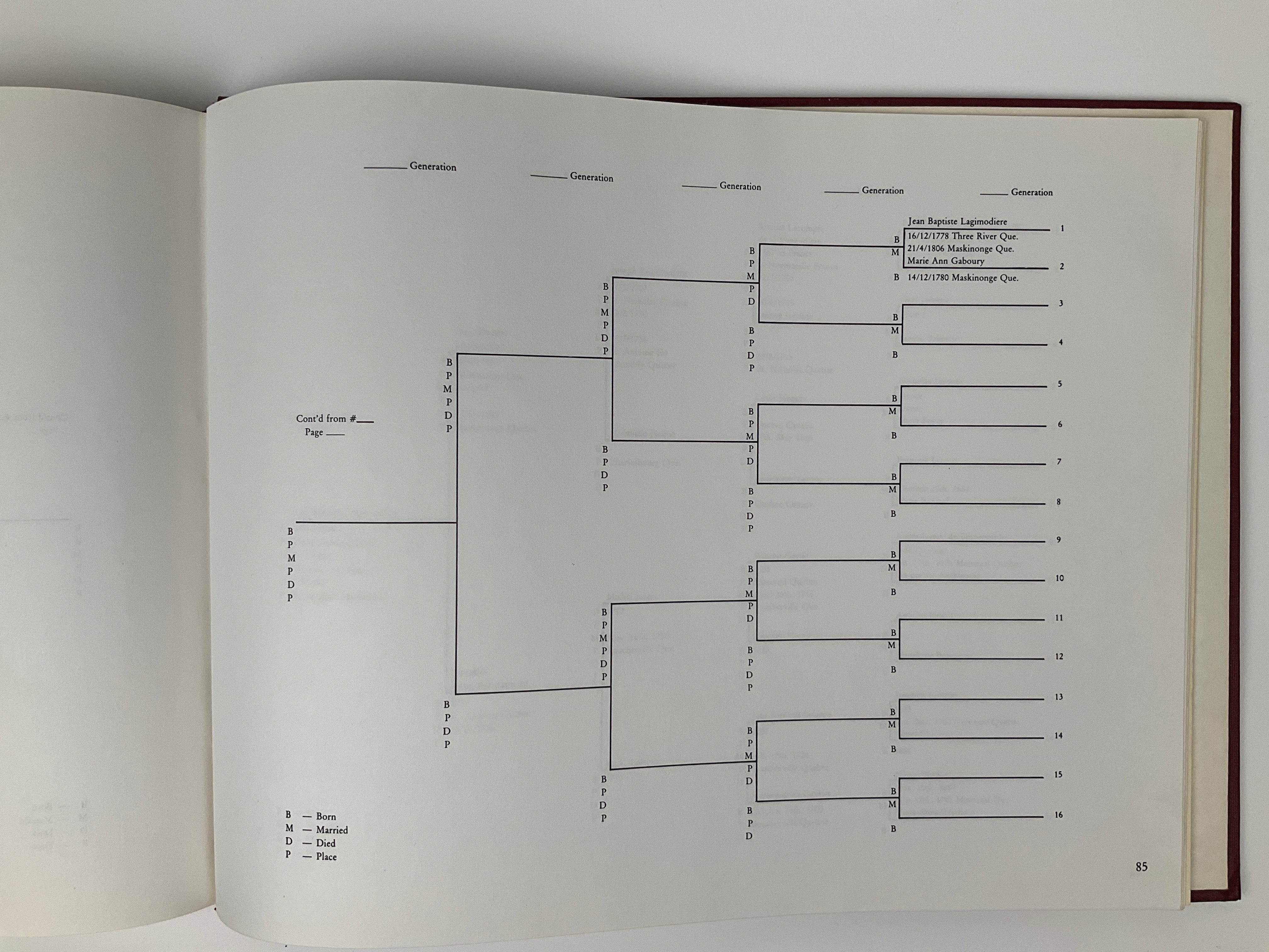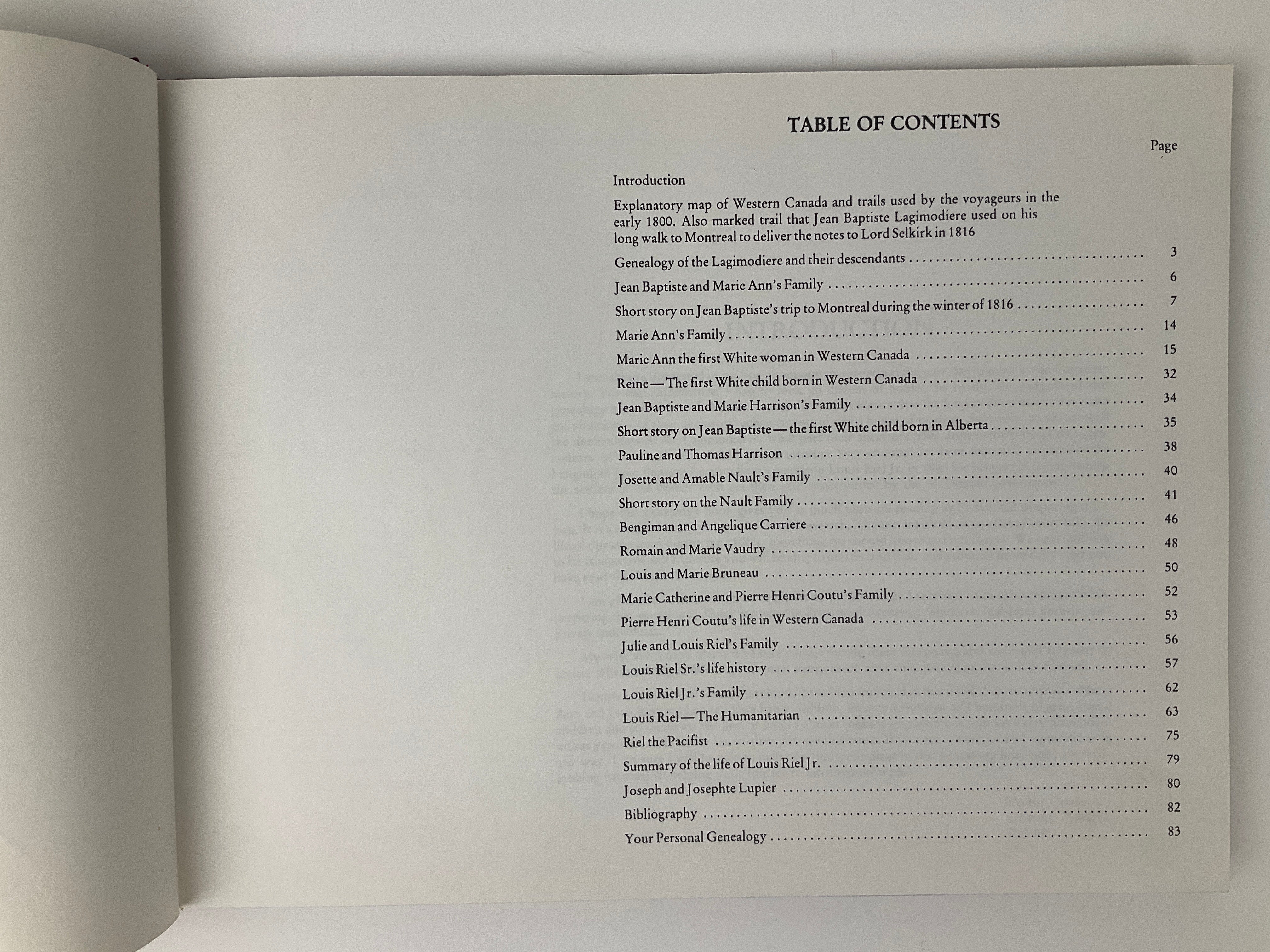 A genealogical history tracing the lineage of Jean-Baptiste Lagimodière and Marie-Anne Gaboury—the latter notably recognized as the first European woman to settle permanently in Western Canada—and their descendants, including their grandson, Louis Riel. The work documents successive generations over a 250-year span, focusing on familial connections, marriages, and descendants. The final leaves include blank genealogical charts intended for the continuation of family records by later generations.