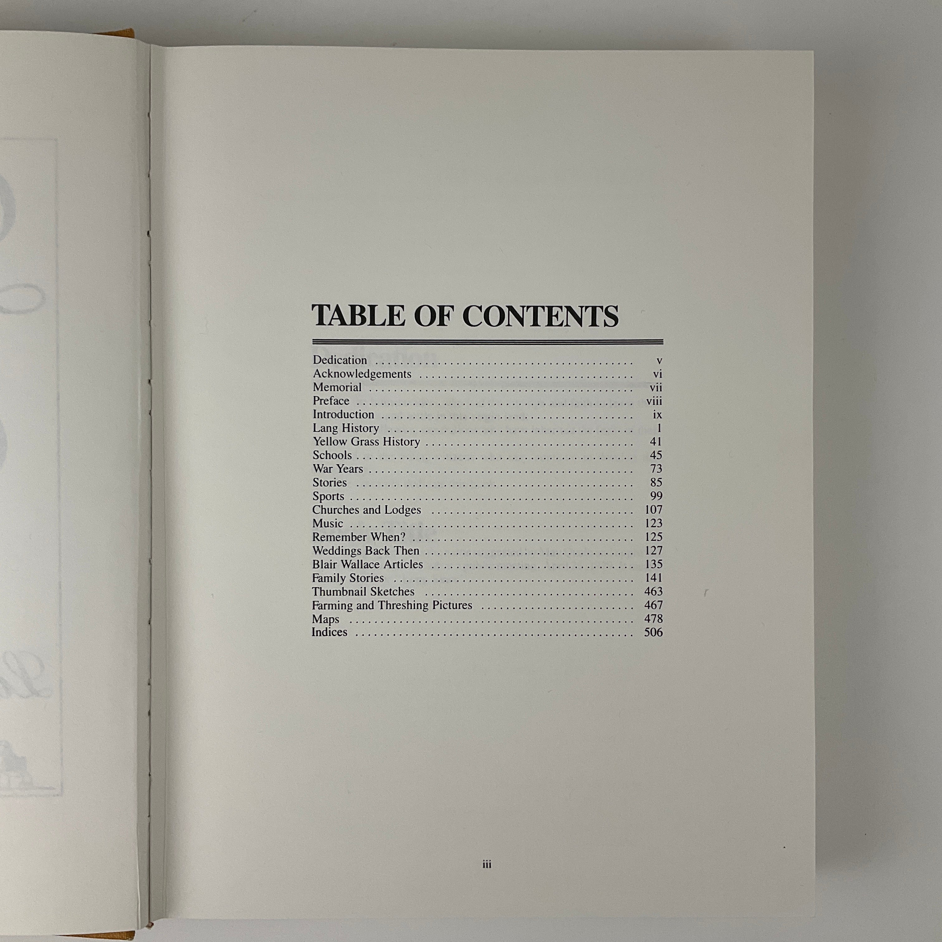 This volume contains a community history of area surrounding the village of Lang (in Saskatchewan’s Rural Municipality of Scott #8, south of Regina). The volume begins with historical overviews of Lang and Yellow Grass, an Honour Roll, and topical chapters covering the area’s schools, sports teams, and churches. Family histories contributed by area residents make up most of the volume. Includes township maps indicating section owners, cemetery lists (Lang and Lakeview), and index. Errata tipped in at p.511.