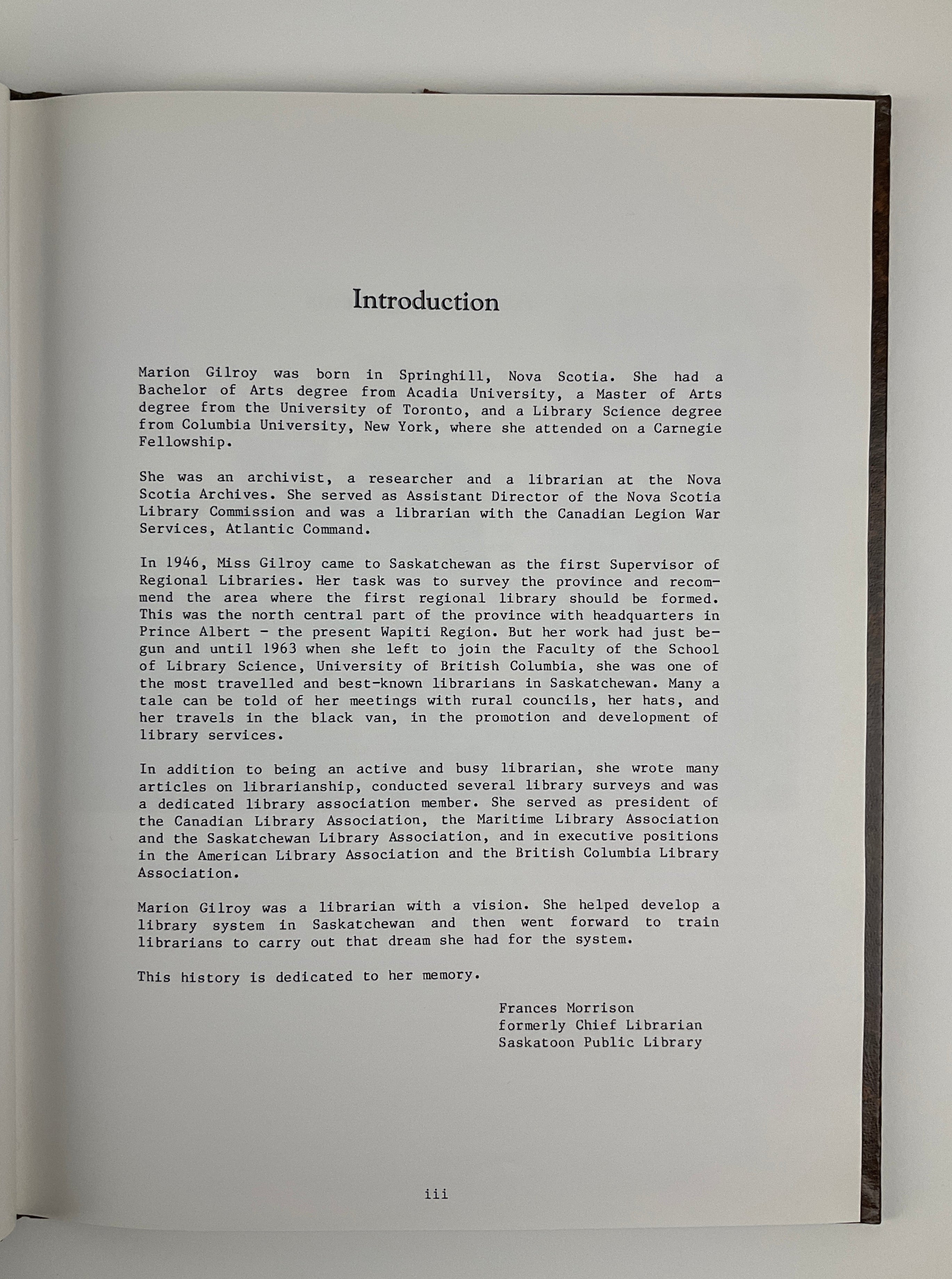Printed in honor of Marion Gilroy (Superintendent of Saskatchewan Regional Libraries, 1946-1963). In this volume, Canadian author Max Braithwaite chronicles the development of Saskatchewan's regional library system (the first in the prairie provinces). He incorporates lively anecdotes of prairie life, discussing the challenges and rewards of providing library access to remote and small communities. Gilroy's work establishing the North Central Regional Library (centered in Prince Albert) features prominently. A readable, often humorous, tribute to Saskatchewan's library system. No publication date indicated, but an "In Memorium" portrait page indicates that Gilroy's 1981 passing occurred before publication.