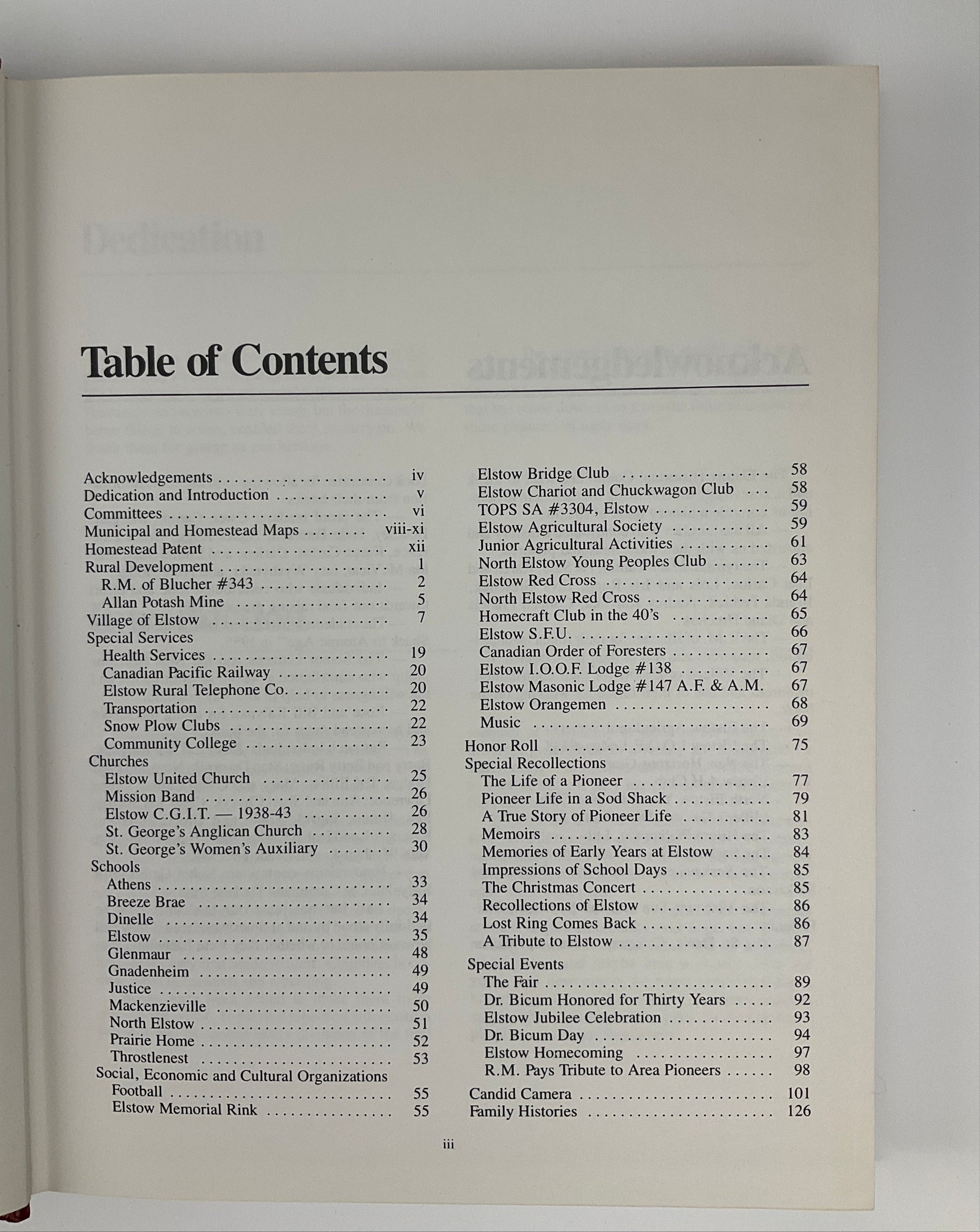 This volume compiles family histories from residents of the area surrounding the former Village of Elstow in Saskatchewan's Rural Municipality of Blucher #343. These histories make up two thirds of the volume. The first 125 pages contain a topical history of the region's Protestant churches, 11 school districts (Athens, Breeze Brae, Dinelle, Elstow, Glenmaur, Gnadenheim, Justice, Mackenzieville, North Elstow, Prairie Home, and Throstlenest), and various social/economic/cultural organizations. Included is a brief history of the Nutrien Allan Potash Facility (here, "Allan Potash Mine"). Includes index.