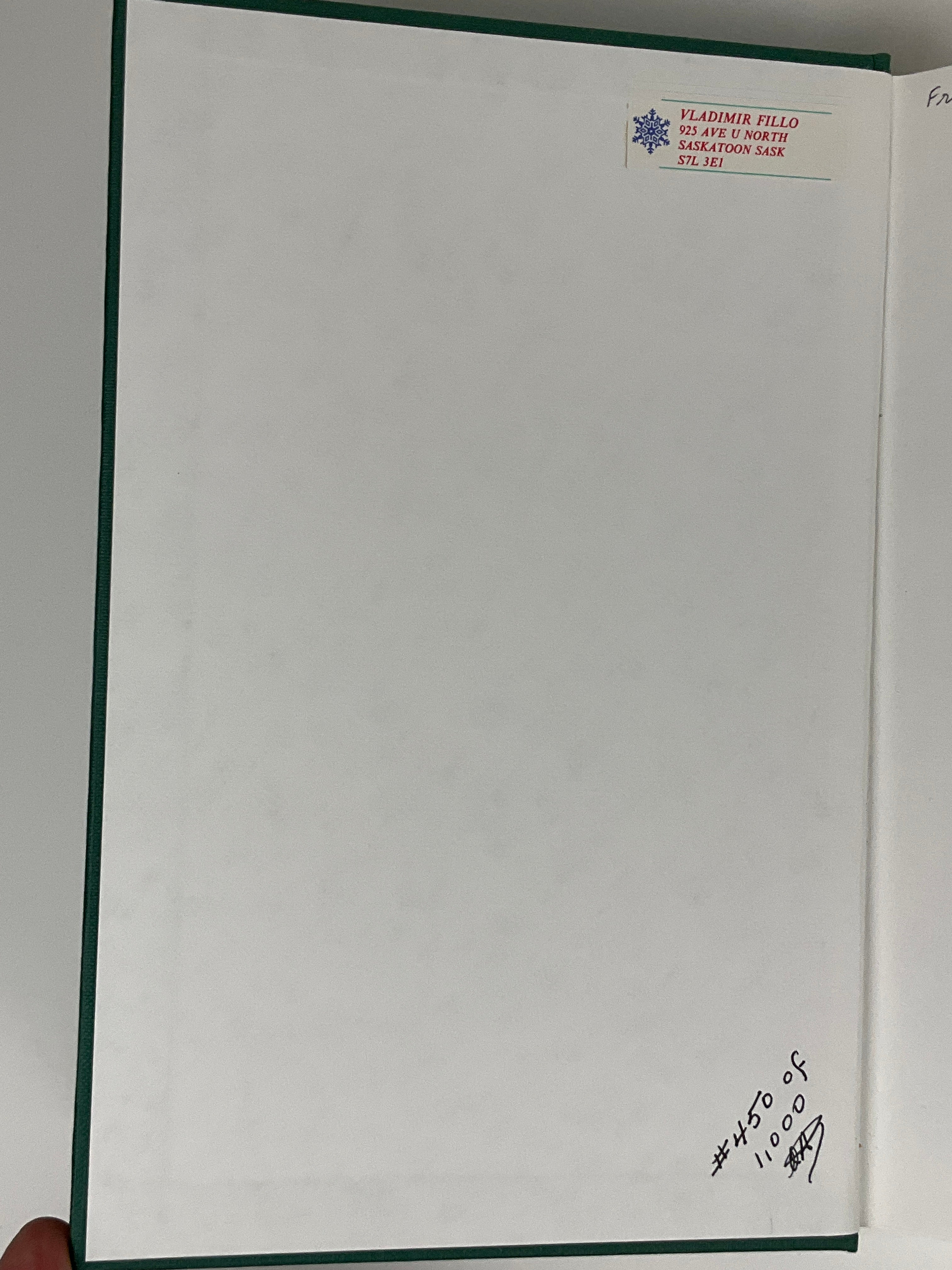 Return Mail label adhered to the front pastedown, neat gift inscription on the blank front end paper, covers rubbed.