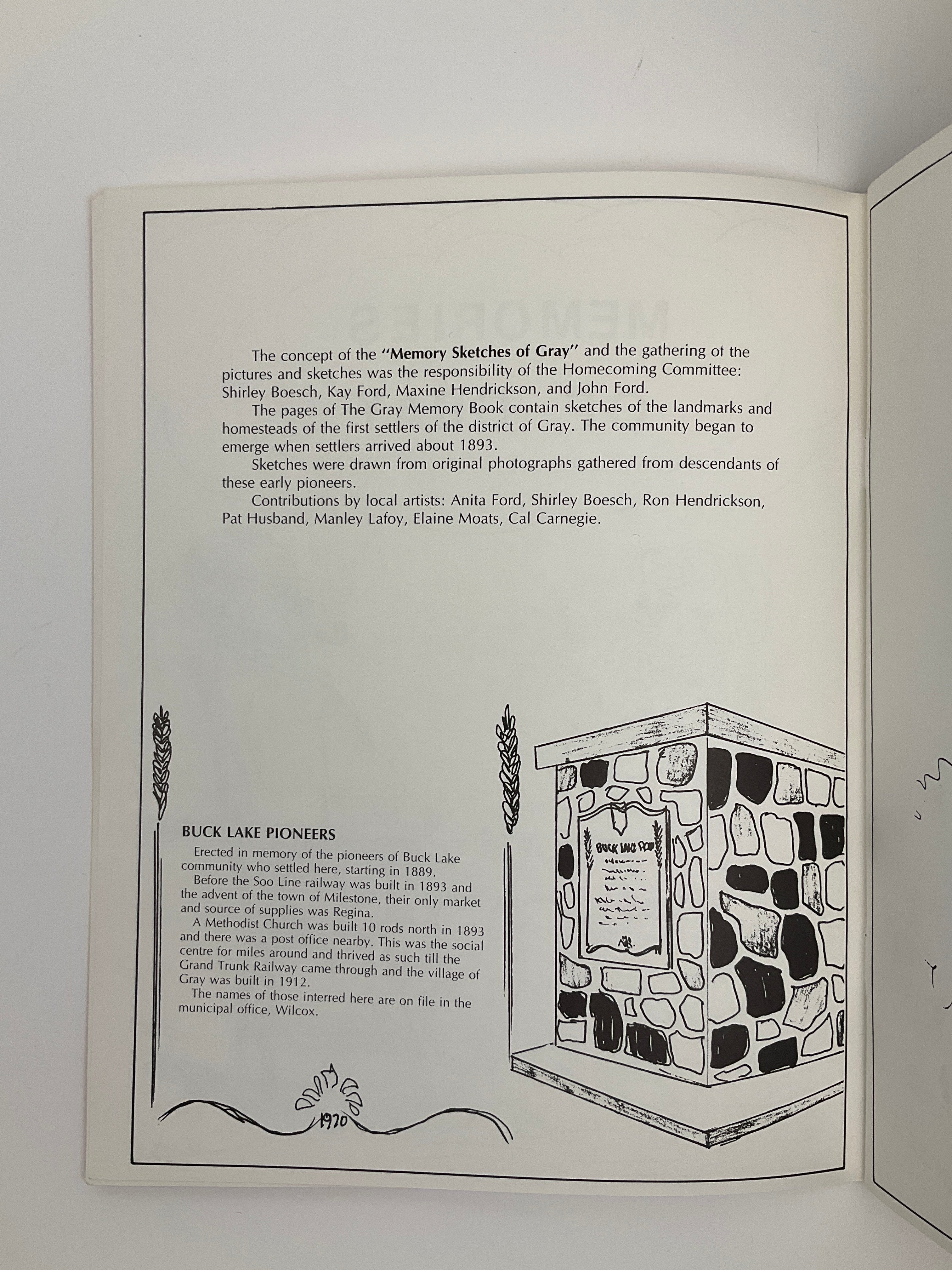 Part of the only text within the book reads - "... The Gray Memory Book contain Sketches of the landmarks and homesteads of the first settlers of the district of Gray. ... Sketches were drawn from original photographs gathered from descendants of these early pioneers. ..." Date of publication has not been indicated - a Dedication on the front cover, dated 1984, suggests a publication date of 1984 or later.