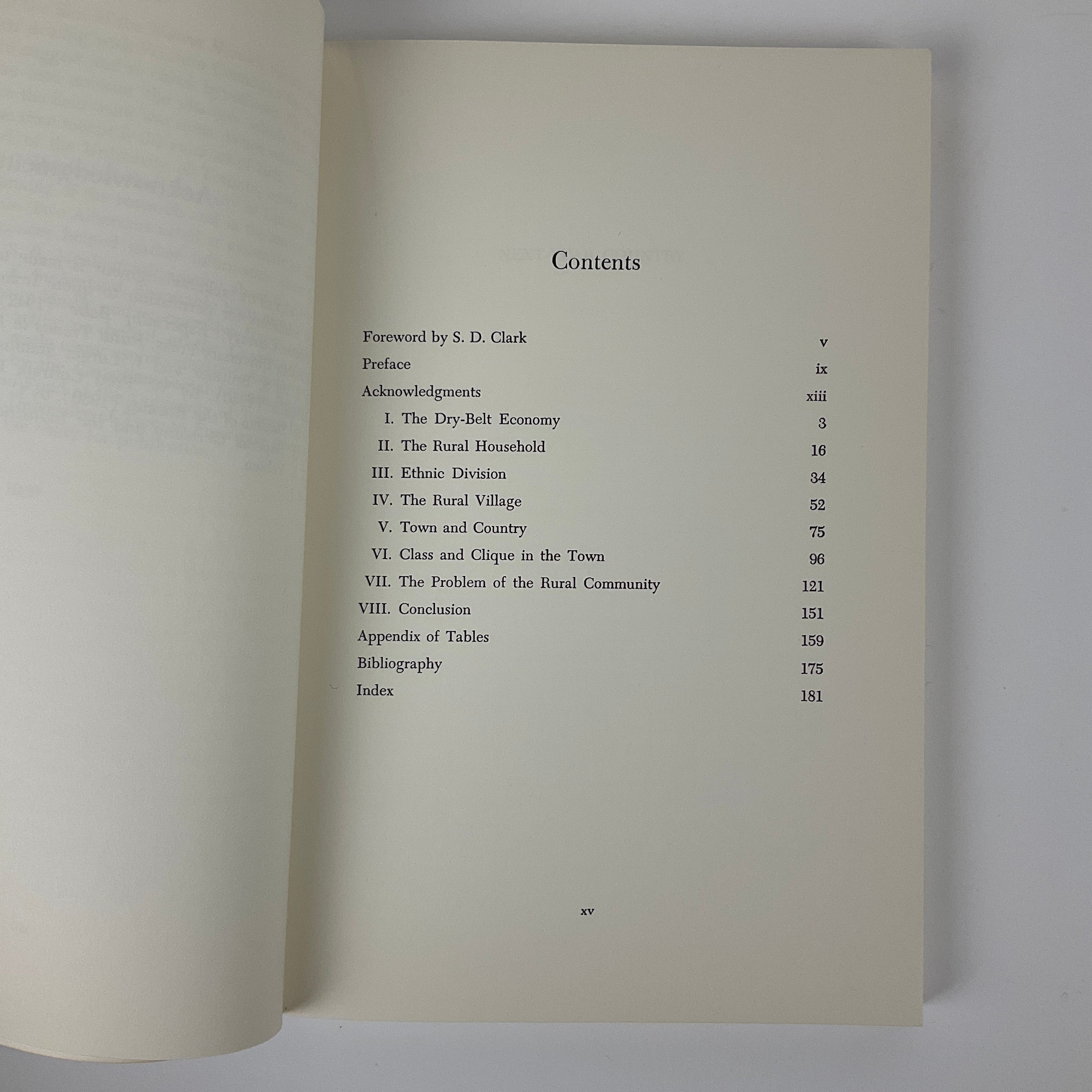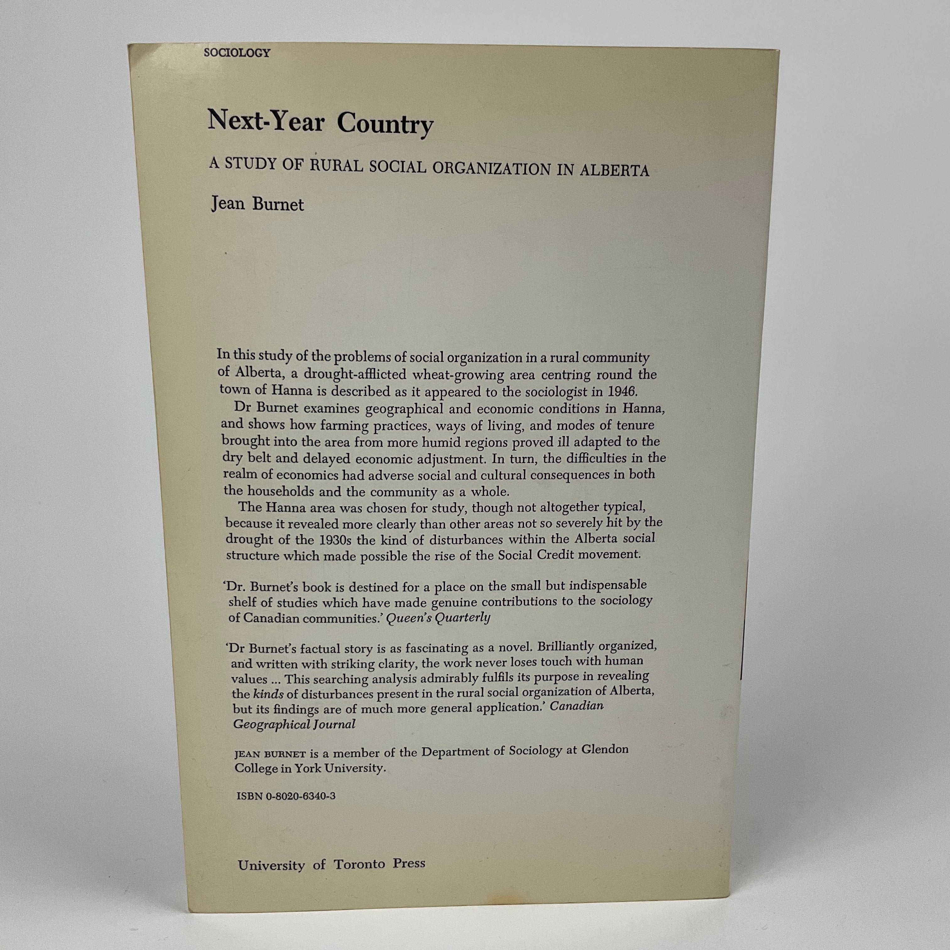 Jean Burnet (1920-2009) was a Canadian sociologist who taught founded Glendon College’s (York University) Sociology department and whose research interests included Canadian history and ethnic studies. In 1946, Burnet travelled to Hanna, Alberta (northeast of Calgary) to observe community life in the town and its rural surroundings. In 1951, she published her findings in “Next-Year Country.” The volume identifies various factors that contributed to the community’s struggle to establish stable social organization. From exploring the impact of drought on the region’s agricultural economy to scrutinizing ethnic and religious cliques in the community to analyzing new technology’s role in homes, Burnet casts a close sociological eye over rural prairie life in the 1940s. Includes index and bibliography.