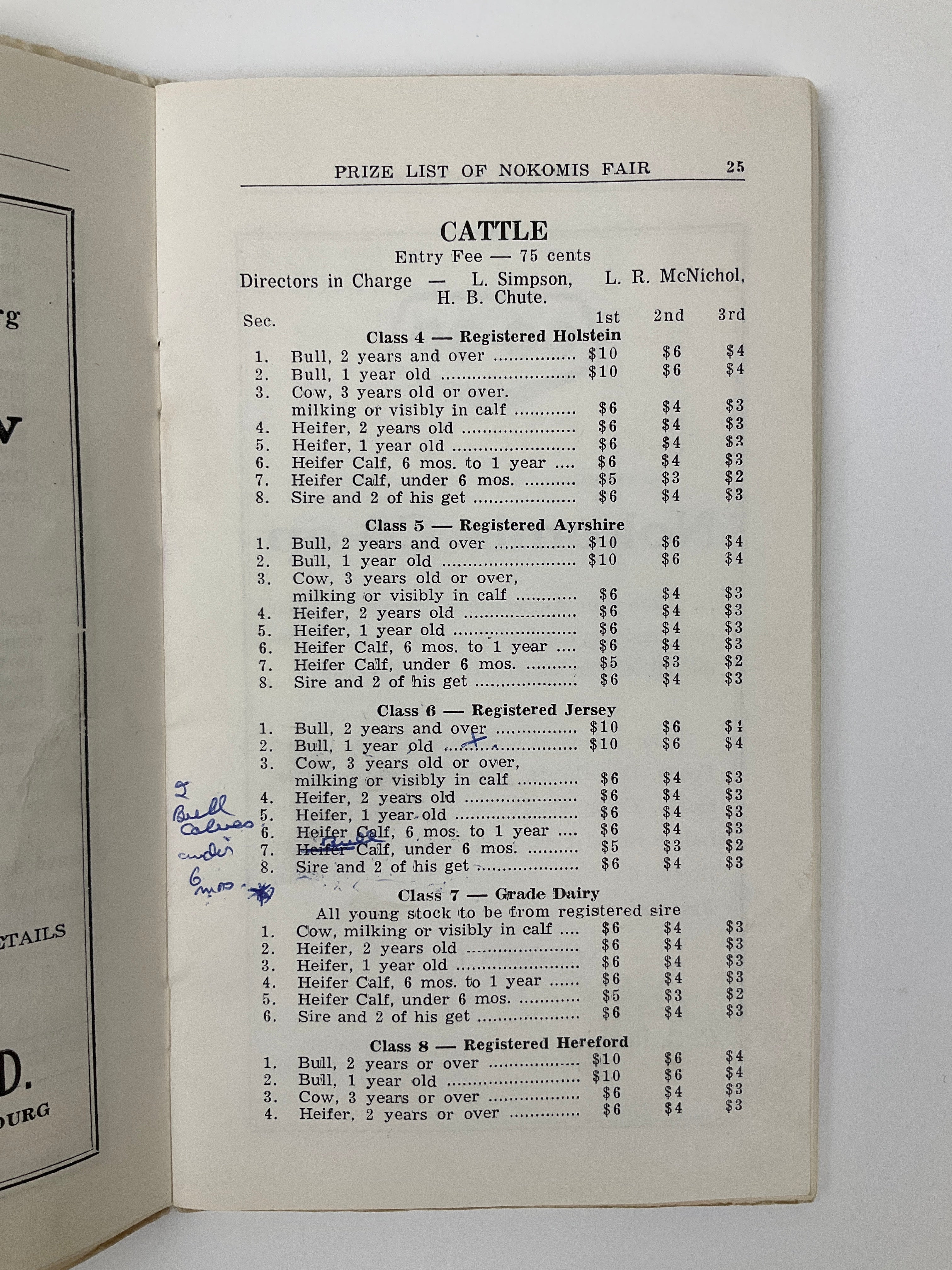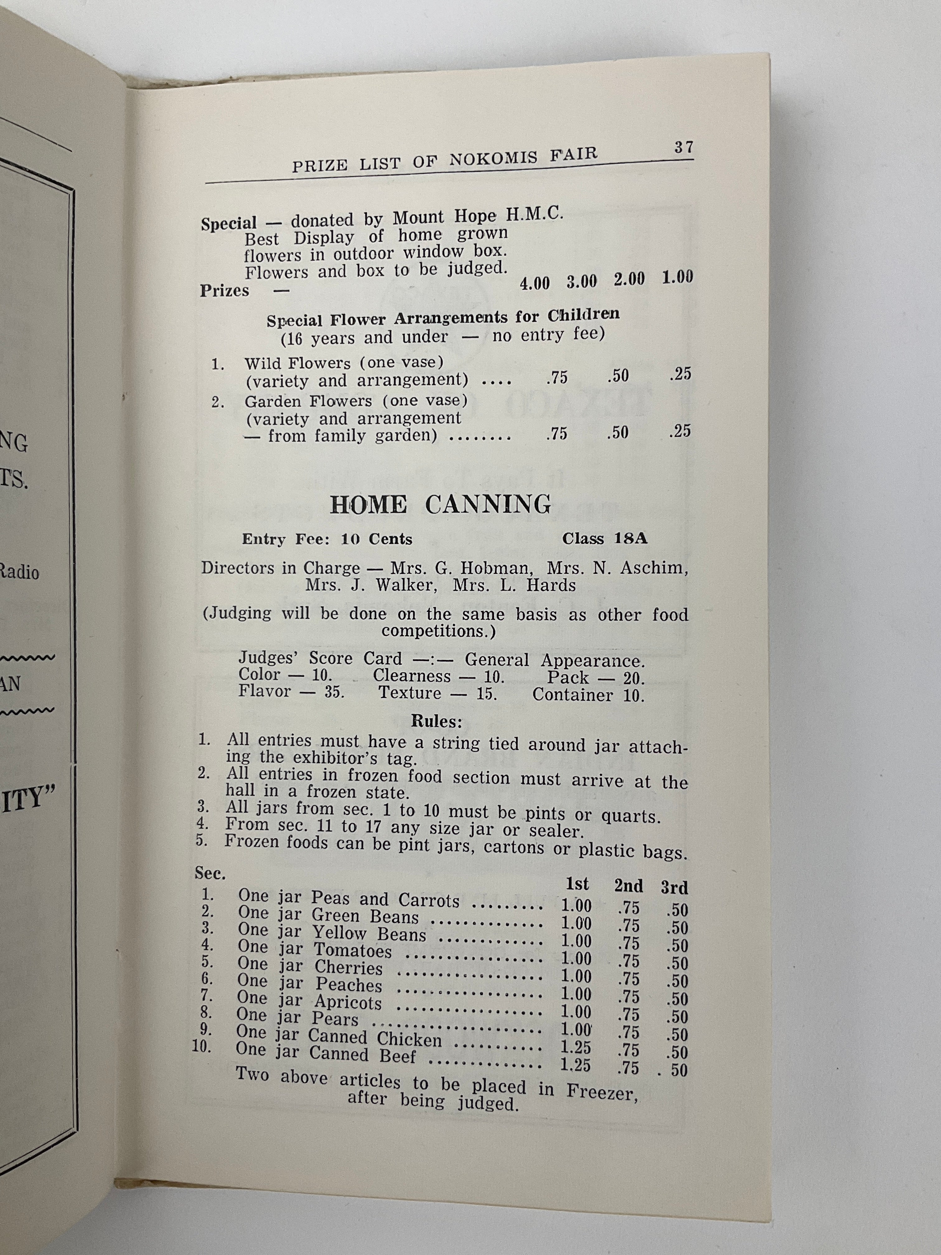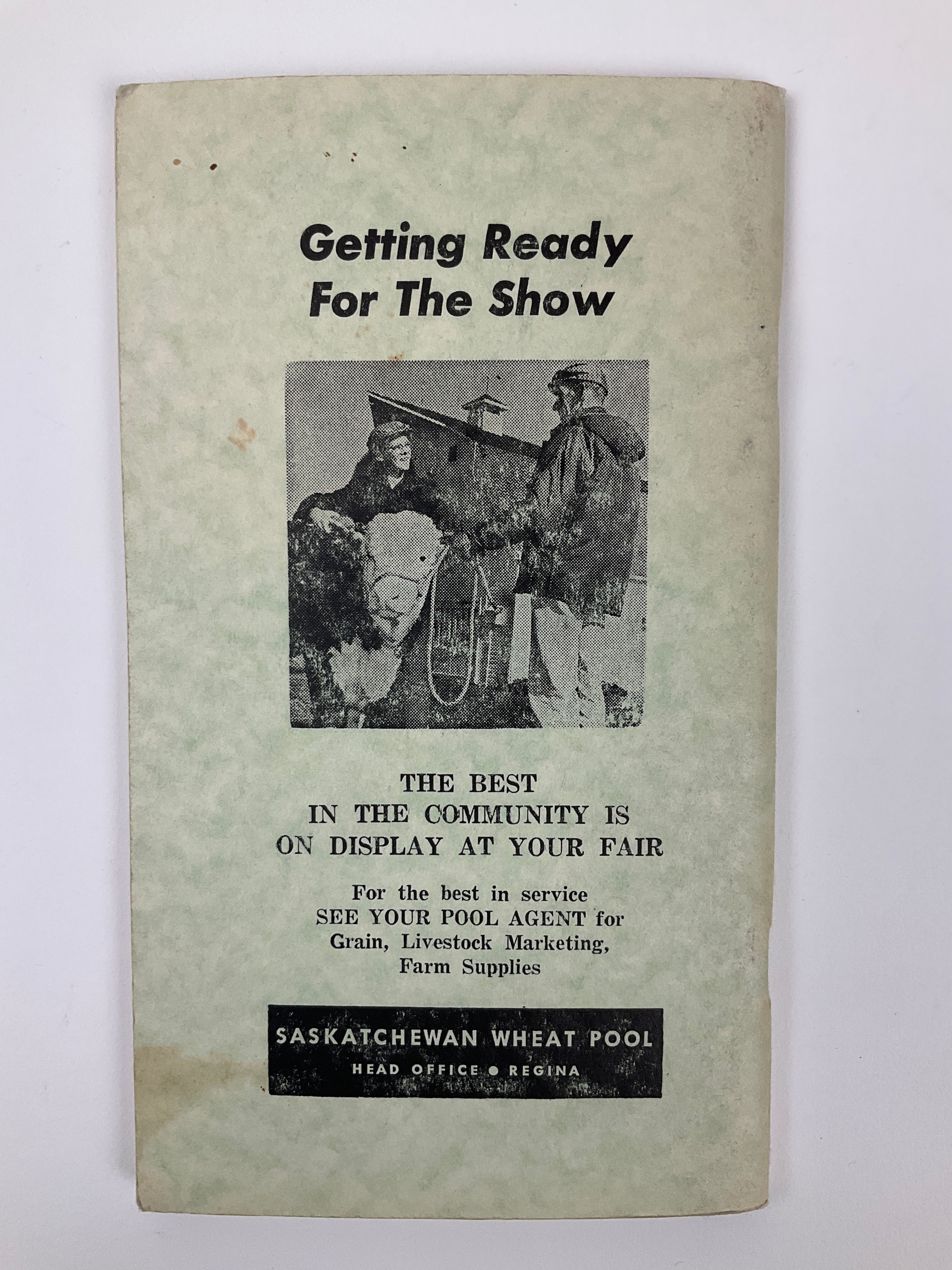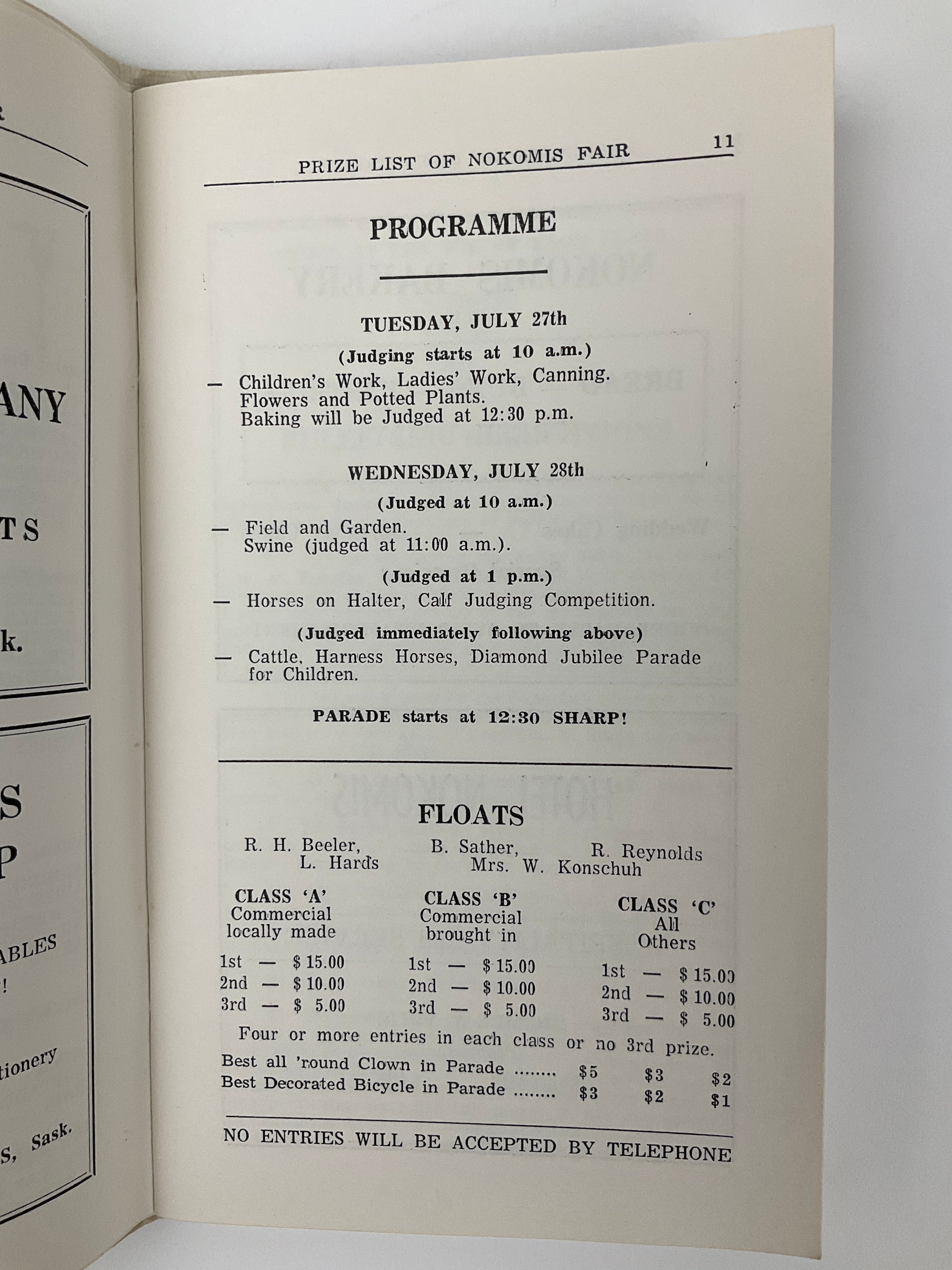 The Nokomis Agricultural Society has been organizing an agricultural fair for the residents of the Mid-Saskatchewan community since 1908. These prize lists outline the dollar values to be won by first, second, and third place winners across a variety of competitions and categories. Judging - Livestock (Poultry, Swine, Cattle, Sheep, Horses), Field Crops (Wheat, Durum, Oats, Barley, Flax, Rye, Rape), Garden Vegetables, Flowers and Potted Plants, Home Canning, Baking, Needle Arts, and numerous Children's Exhibits. Includes advertisements from Nokomis and district merchants.