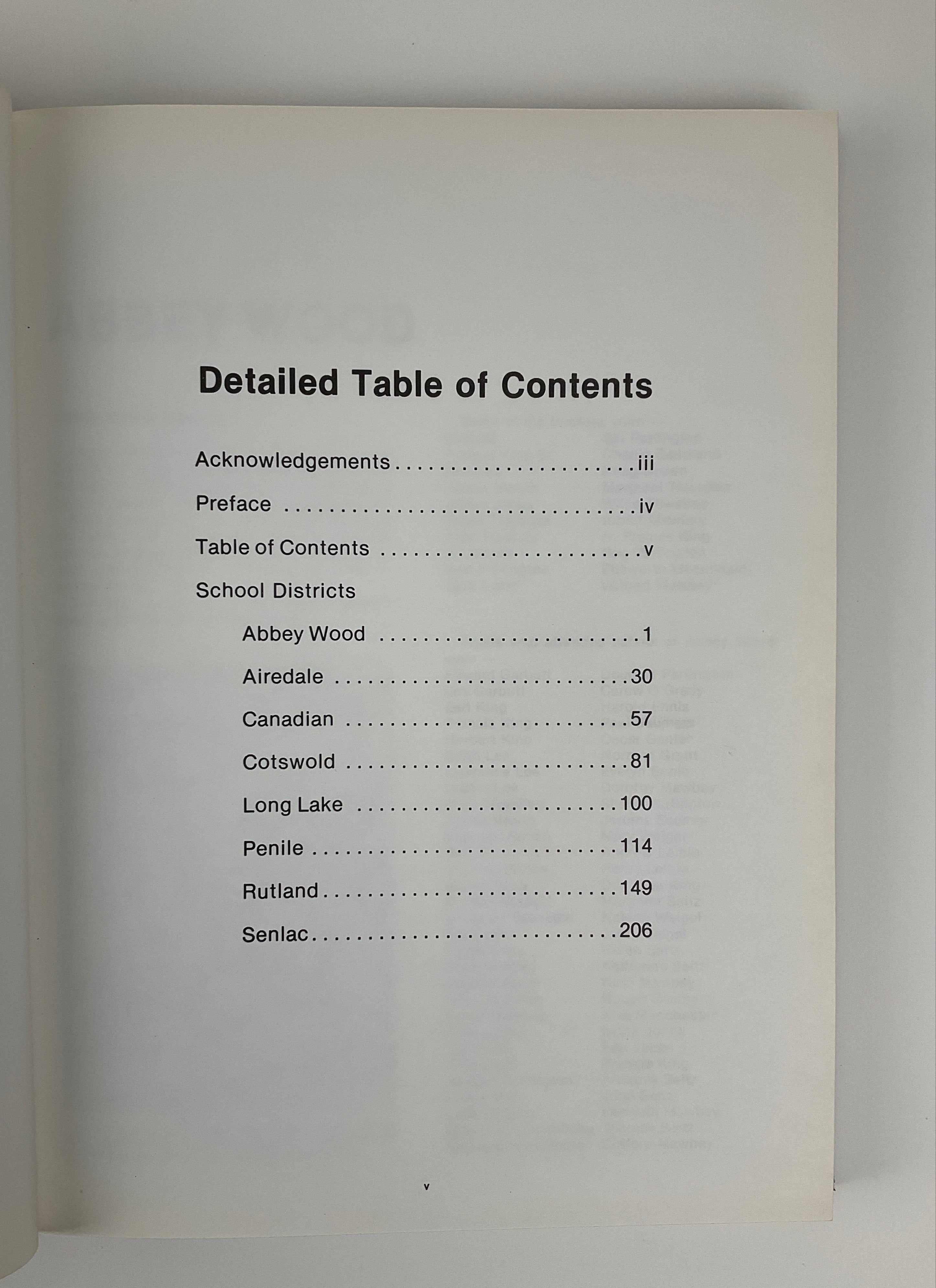 This volume contains a community history of eight school districts near the village of Senlac (in Saskatchewan’s Rural Municipality of Senlac #411): Abbeywood, Airedale, Canadian, Cotswold, Longlake, Penile, Rutland, and Senlac. The volume consists of family histories contributed by area residents, arranged by school district. Each district’s section begins with a brief historical overview of the school or region, and many end with a photo section depicting district life.