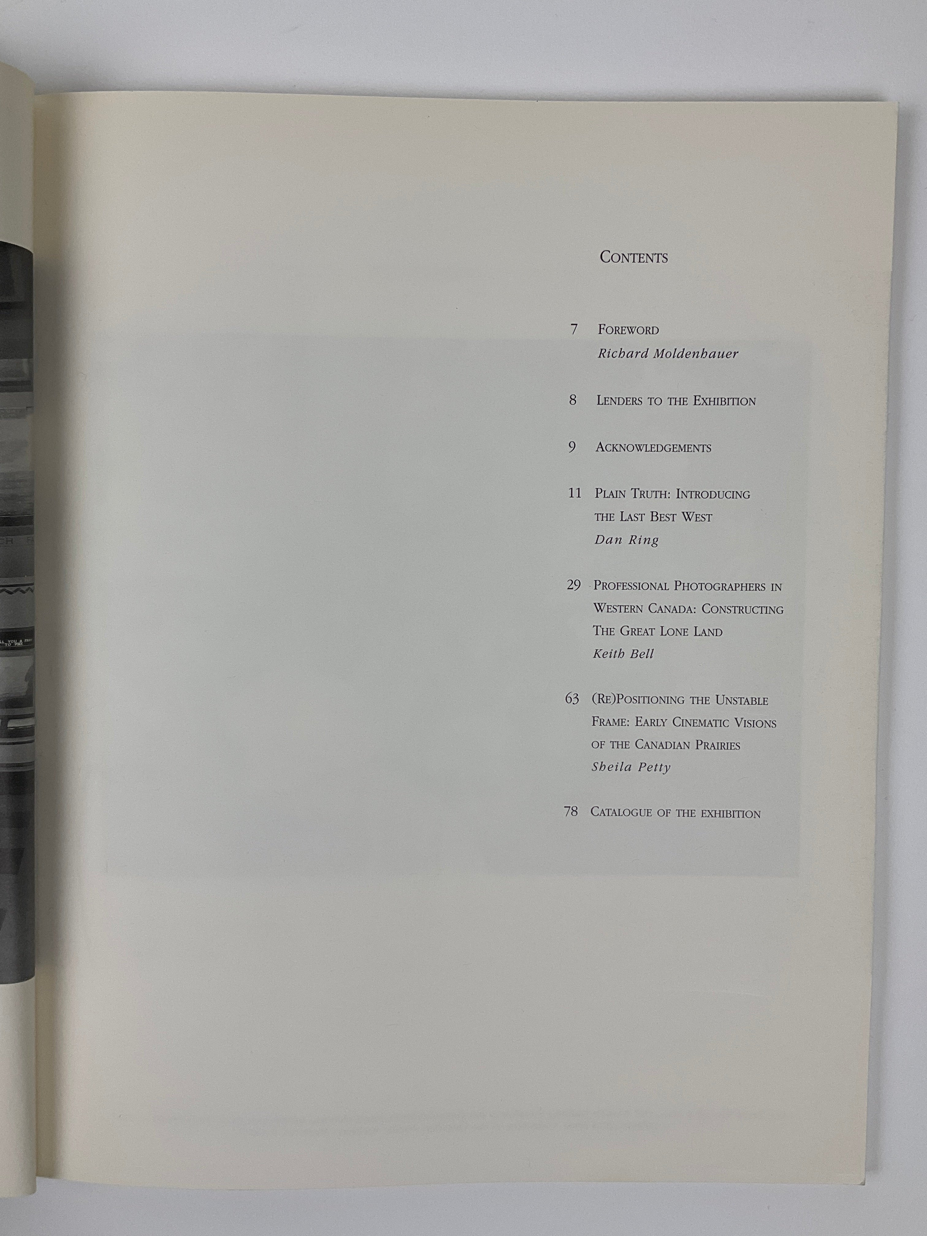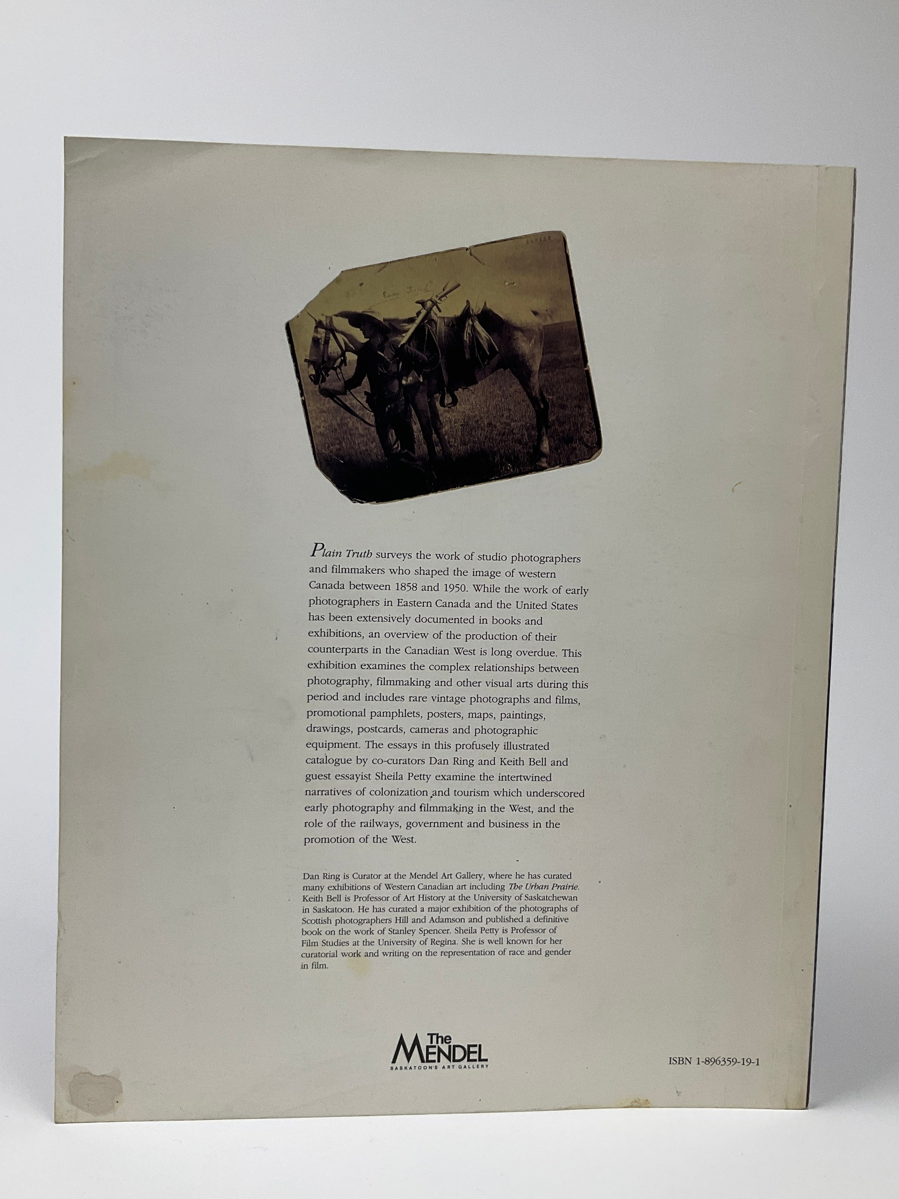Richard Moldenbauer, Interim Director of the Mendel Art Gallery writes in the Introduction "Plain Truth surveys the work of studio photographers and filmmakers who represented the Canadian West between 1858 and 1950. While the early photographers of Eastern Canada and the United States have been extensively documented in books and exhibitions, much of the production of their counterparts in the Canadian West remains largely unknown to the general public,. This exhibition continues Mendel Art Gallery's commitment to critically asses material culture of the Western region in relation to the visual production of artists and photographers that we initiated in the 1993 exhibition The Urban Prairie." Includes essays by curators Dan Ring, and Keith Bell and guest writer Shelia Petty.