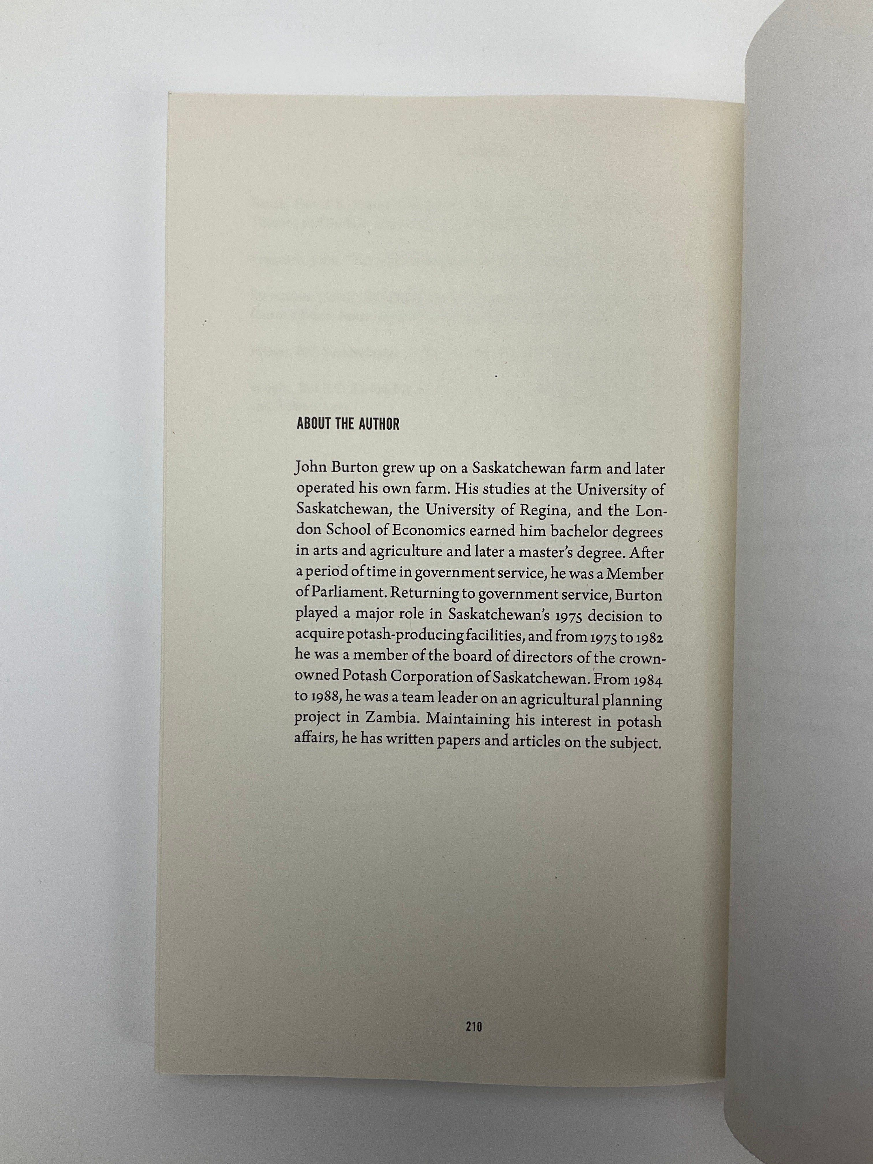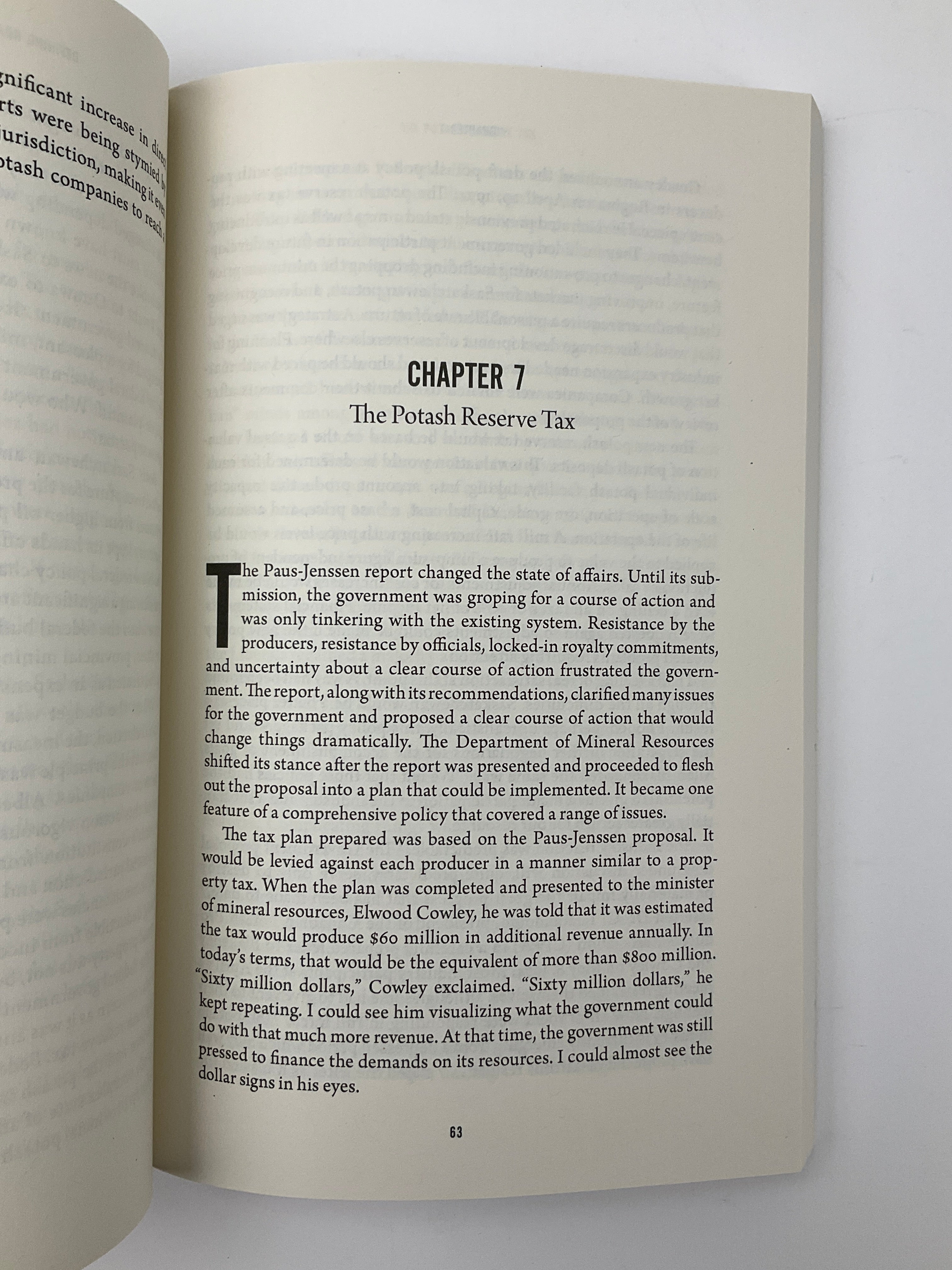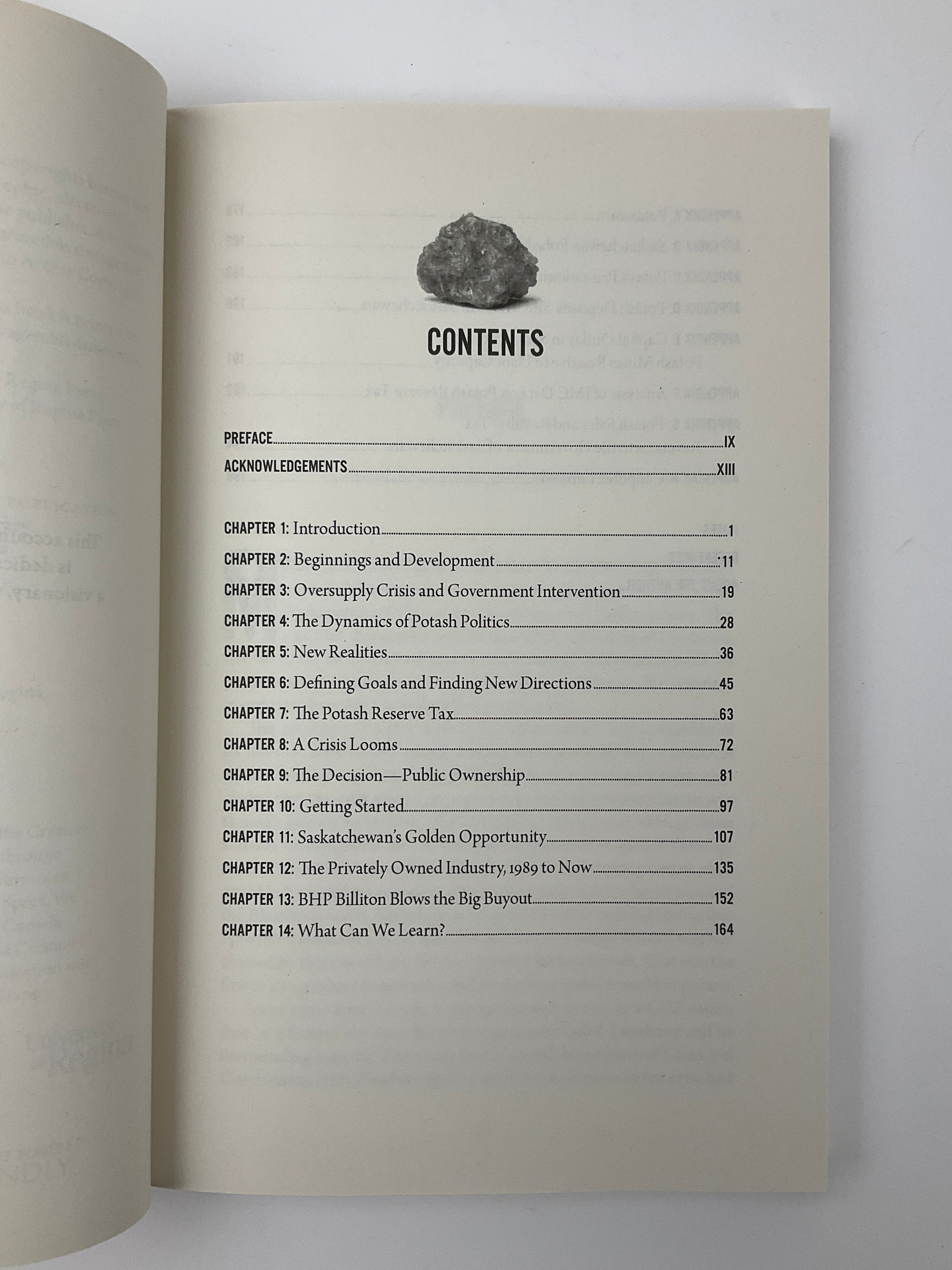 The author writes in the Preface " ... In 2004, I completed a thesis that examined potash affairs in Saskatchewan from its first discovery in 1942 to the tumultuous events of 1975. It was the final requirement to earn a master of arts degree from the University Of Regina. This publication builds on that thesis and brings events forward to the present time. It attempts to provide the reader with a better understanding of the factors that went into the phenomena of a new resource coming on the scene, how it was managed, and the impact it had on the province. It is not simply a narrative that provides a comprehensive history of potash in Saskatchewan. Rather it focuses on the basic factors and features that determined how potash was developed, what role it played in the economy, what influences were brought to bear on its development, and what external factors influenced the pattern of development. The overarching question identified is to try and find what is best for Saskatchewan. The recent episode in which Australian-based BHP Billiton made an unsuccessful attempt to aquire PCS Inc. is examined as another chapter in the ongoing saga of Potash in Saskatchewan. ..."