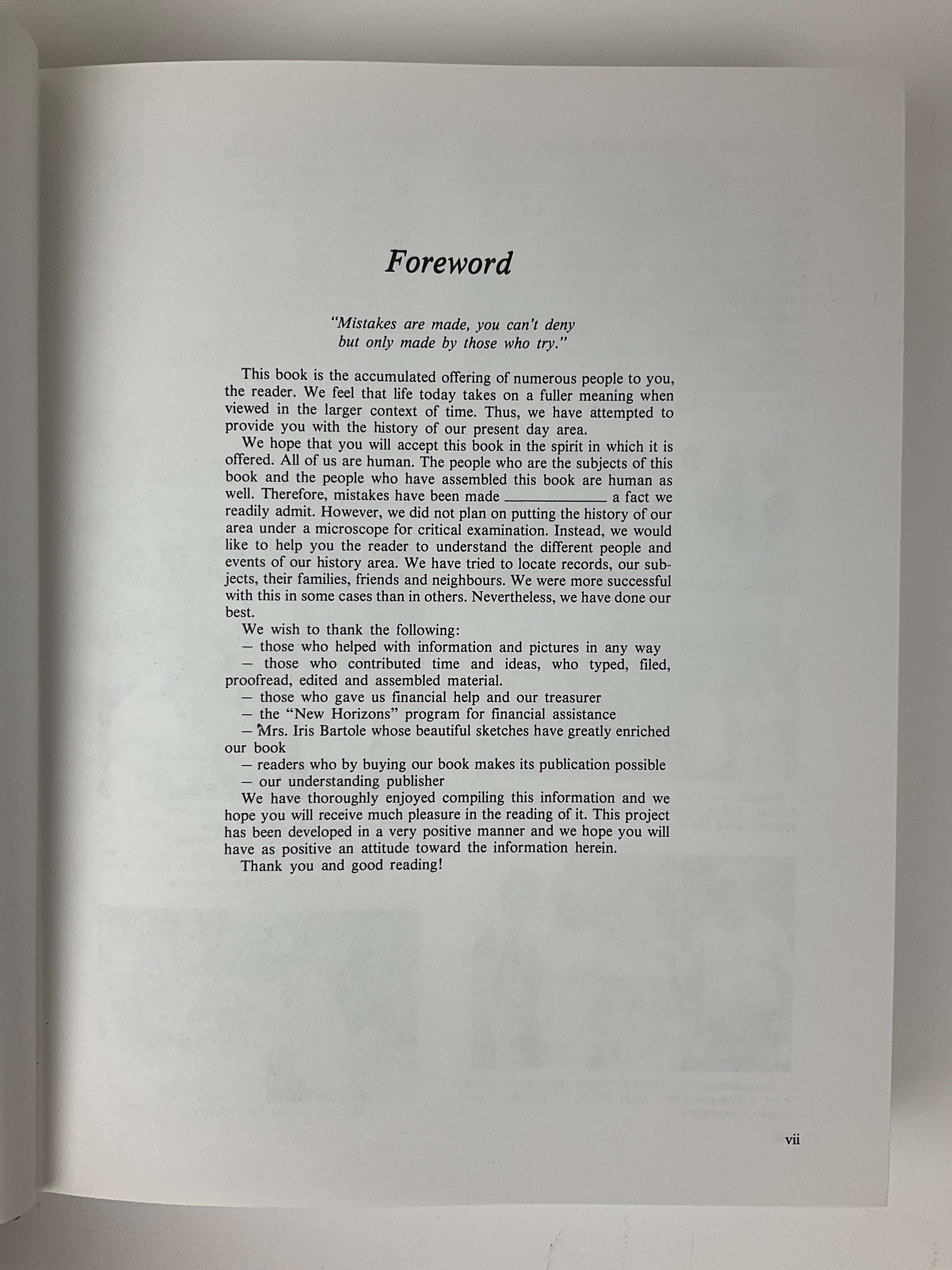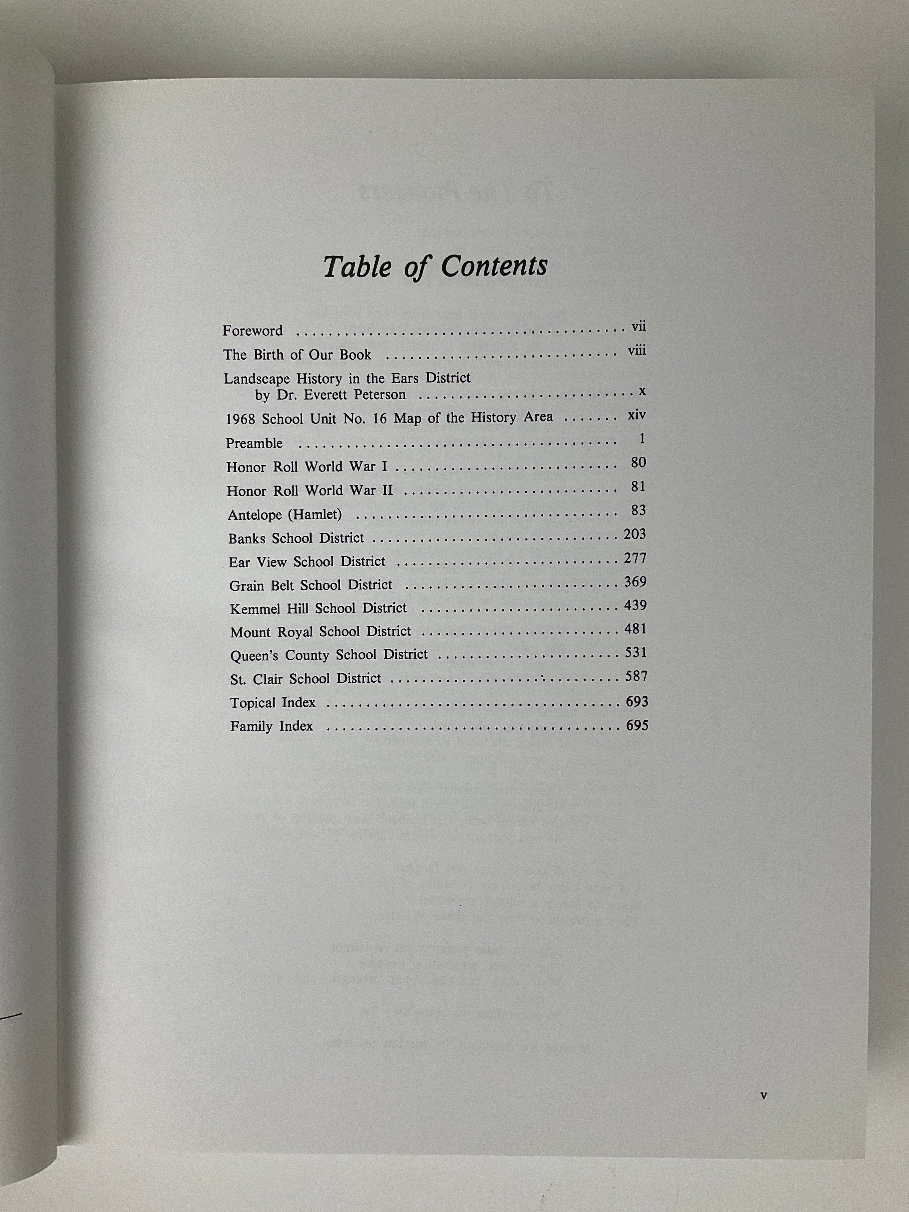 This community history documents the rural southwest region of Saskatchewan, with a focus on the hamlet of Antelope and the surrounding school districts of Ear View, Grain Belt, Kemmel Hill, Mount Royal, Queen's County, and St. Clair. The book is organized into sections by district, each containing a brief historical overview followed by family histories submitted by residents and former residents of the area.