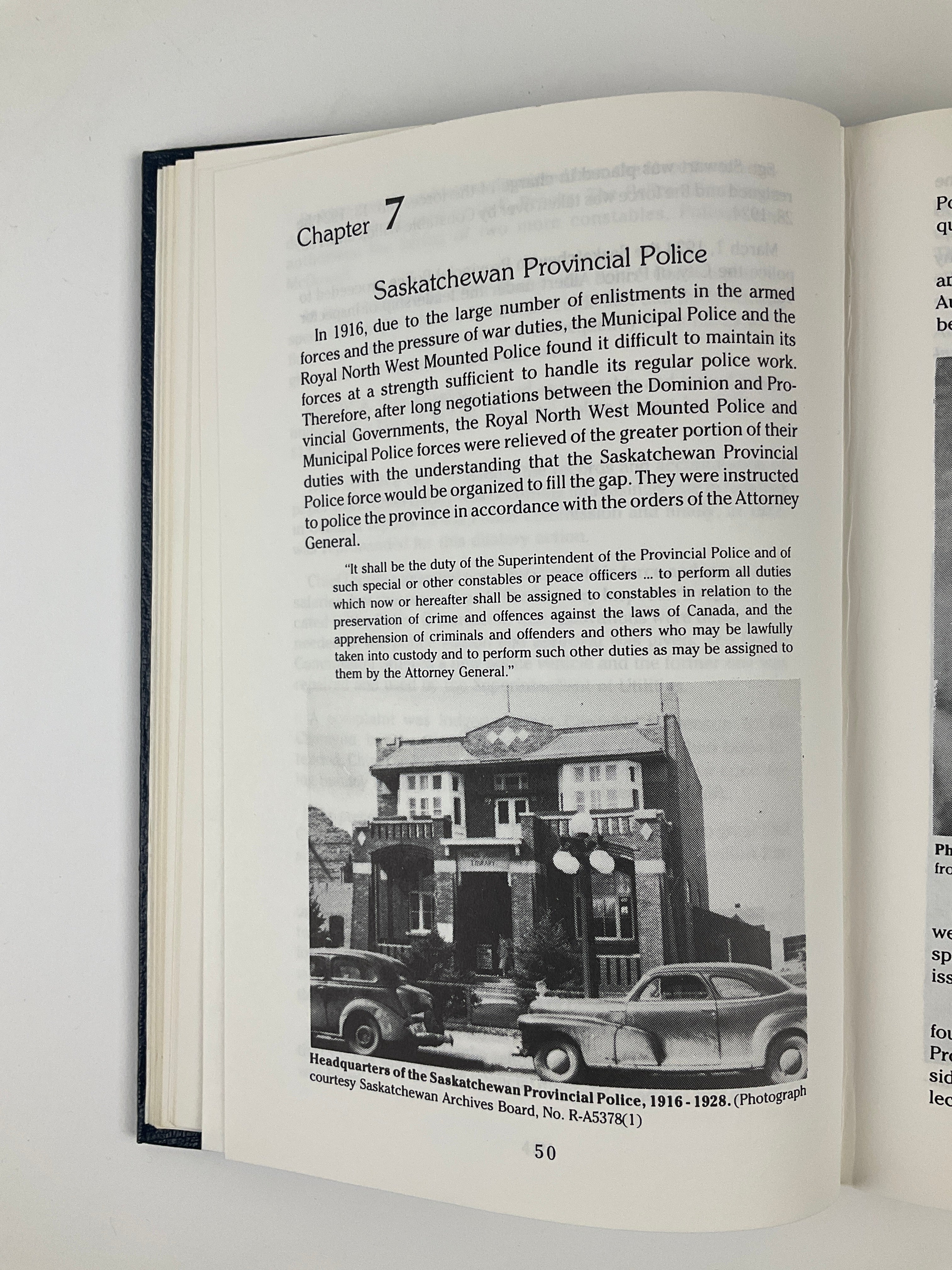 This volume profiles the Prince Albert Police from its inception in late 1885 until 1986. The first half of the book chronologically covers the force under 13 successive police chiefs (including a 5-year period headed by the Saskatchewan Provincial Police). In the second half of the book, author Joan Frith discusses the Prince Albert Police’s identification and traffic departments, detectives, patrol and court officers, and police dogs. Throughout, she leavens institutional history with anecdotes of everyday law enforcement and lively accounts of major events (such as a 1977 riot at Prince Albert Correctional Centre). Frith also emphasizes the Prince Albert Police’s community presence, highlighting its role in public life beyond law enforcement. No publication date indicated, but the volume’s title and contents suggests a publication date of 1986 or later.