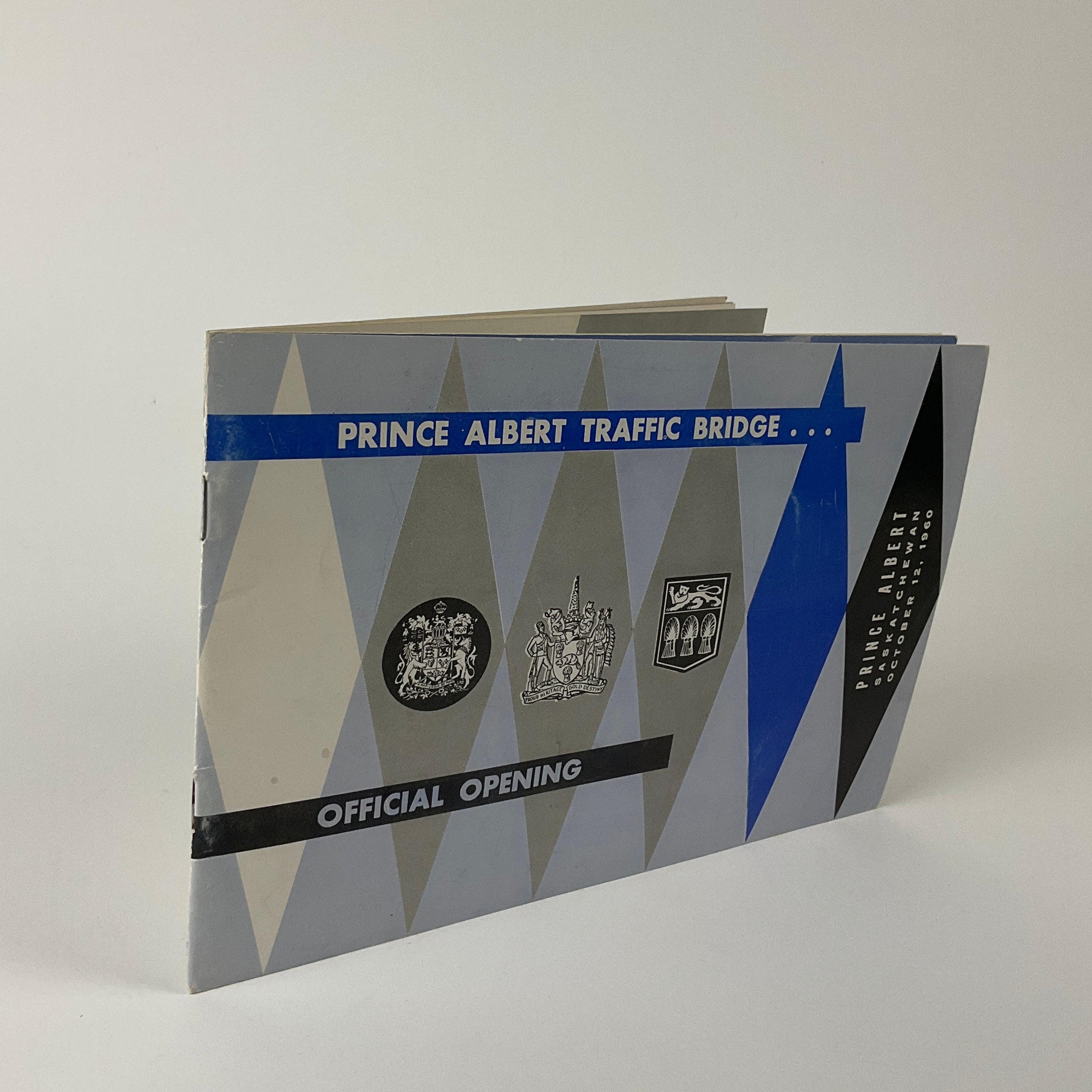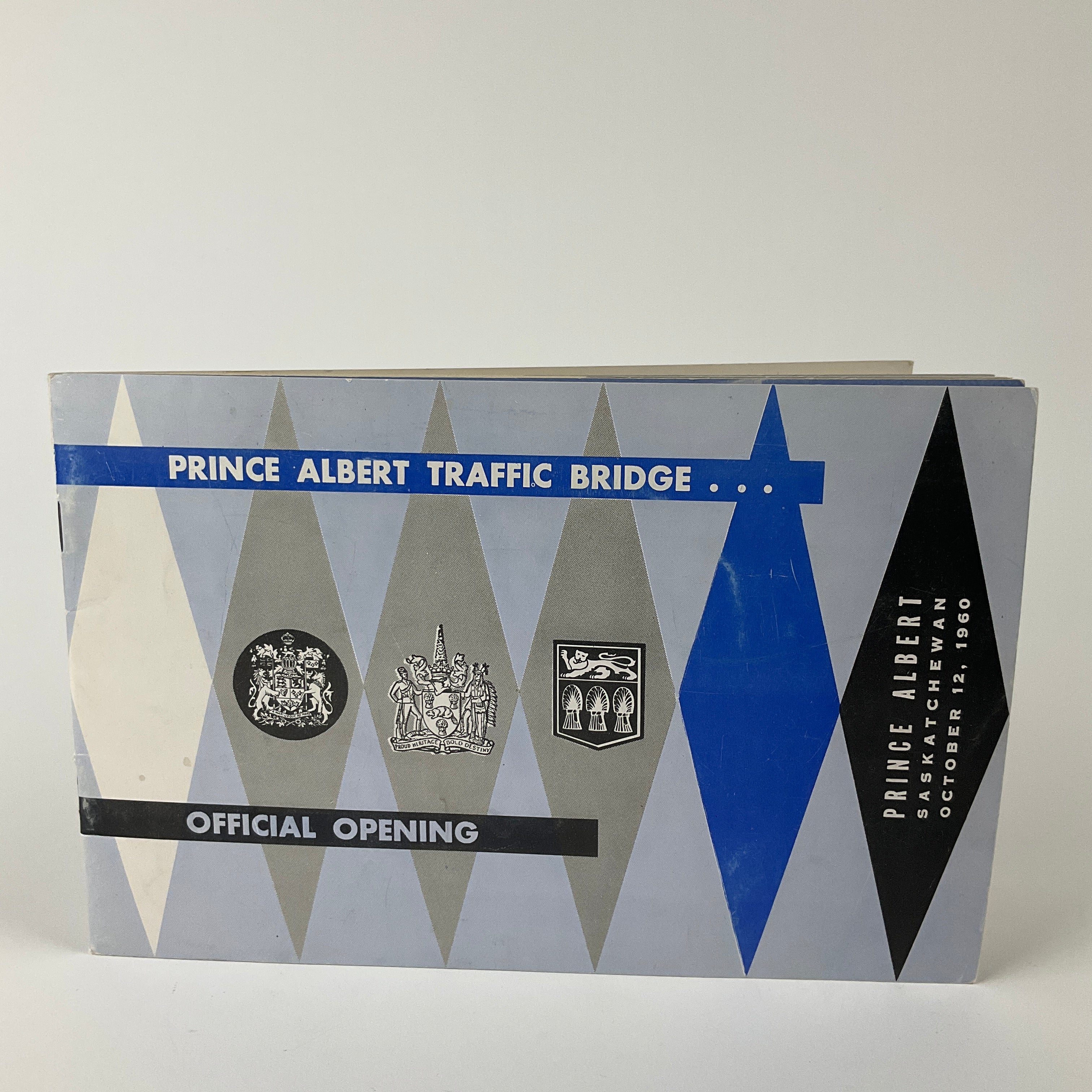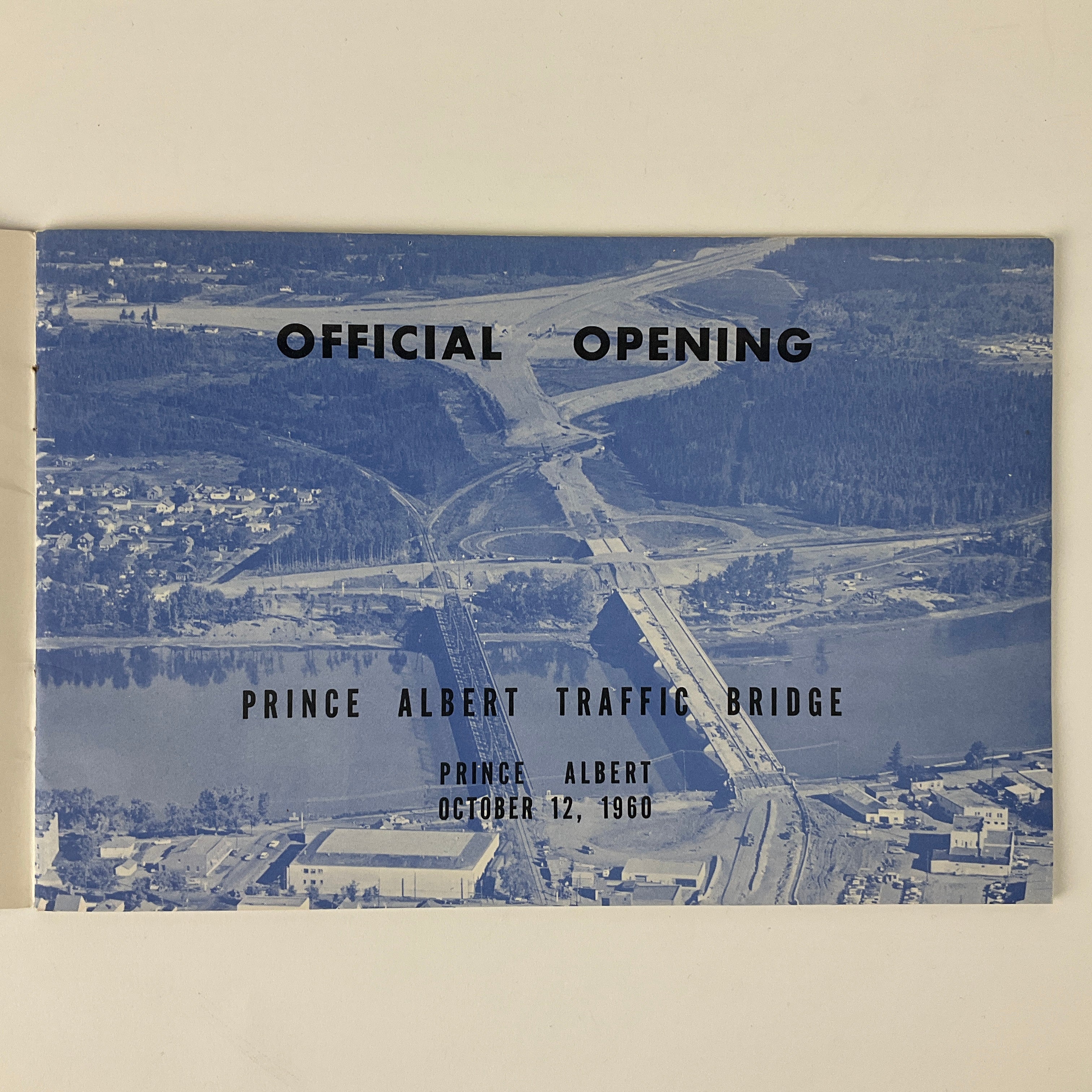 This booklet celebrates the opening of the Prince Albert Traffic Bridge, which was conceptualized in 1958 and completed in 1960. Funded by all three levels of government, the bridge was heralded as a gateway to further transportation and economic development in northern Saskatchewan. The booklet features photos and descriptions of the construction process alongside brief commentary by the bridge’s engineer (M. B. Pierce) and Saskatchewan’s Minister of Highways and Transportation (C. G. Willis). It also includes congratulatory messages from government leaders: John G. Diefenbaker (Prime Minister of Canada, and eventual namesake of the bridge), Tommy C. Douglas (Premier of Saskatchewan), and Allan Barsky (Mayor of Prince Albert).