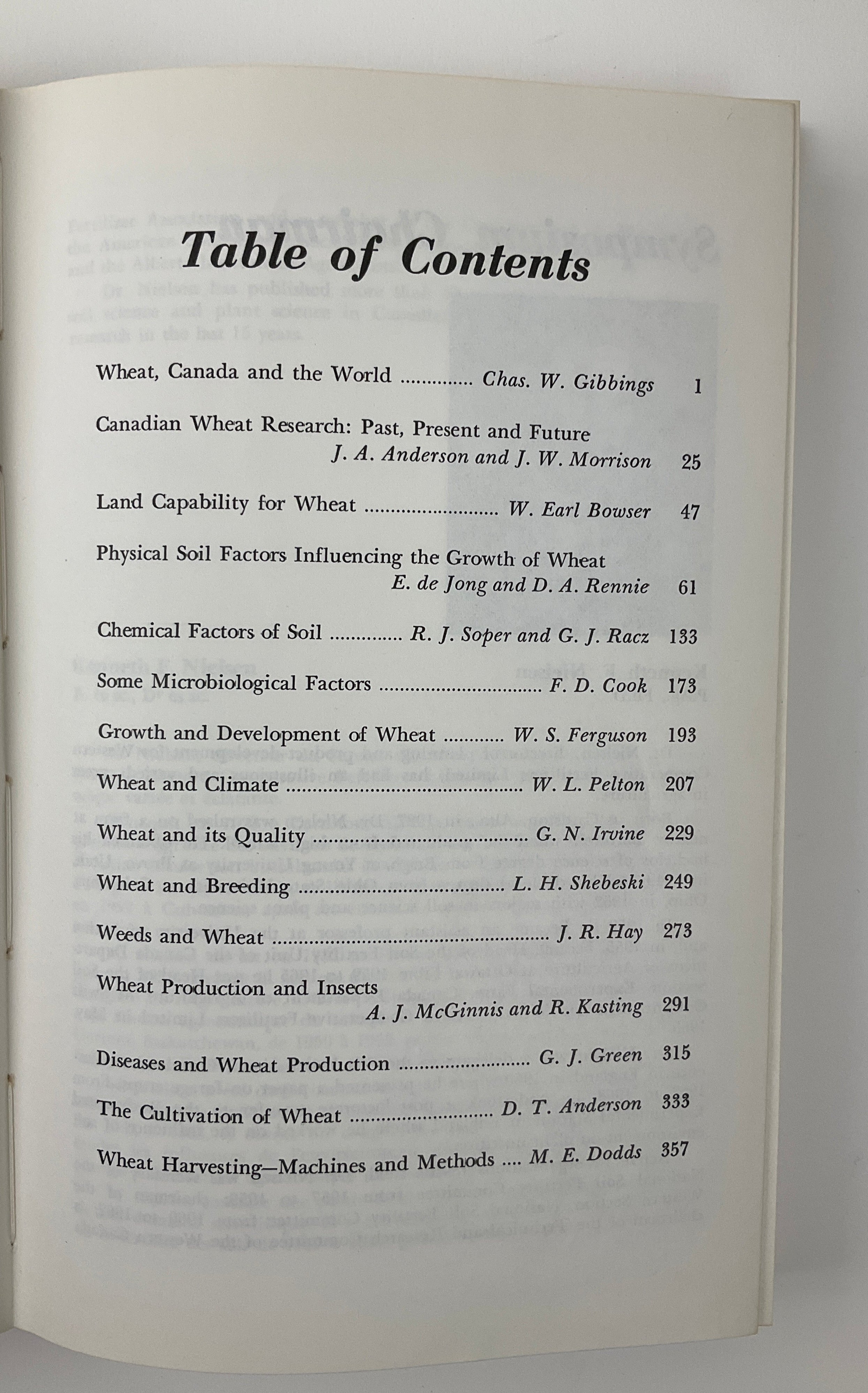 This volume contains fifteen papers originally presented at the Canadian Centennial Wheat Symposium, an event chaired by Kenneth Nielsen (a 1994 recipient of the Order of Canada for his work on fertilizers and soil sciences). Each of the papers discusses some aspect of cultivating wheat on the Canadian prairies. Topics range from soils to climates to diseases to experimental breeding. Contributors include academics and researchers from across the prairies as well as members of Canada’s Department of Agriculture. The contributions are academic in tone – many contain graphs, charts, endnotes, and references. Together, the papers provide a snapshot of research interests and scientific progress pertaining to wheat production on the Canadian prairies in the 1960s.