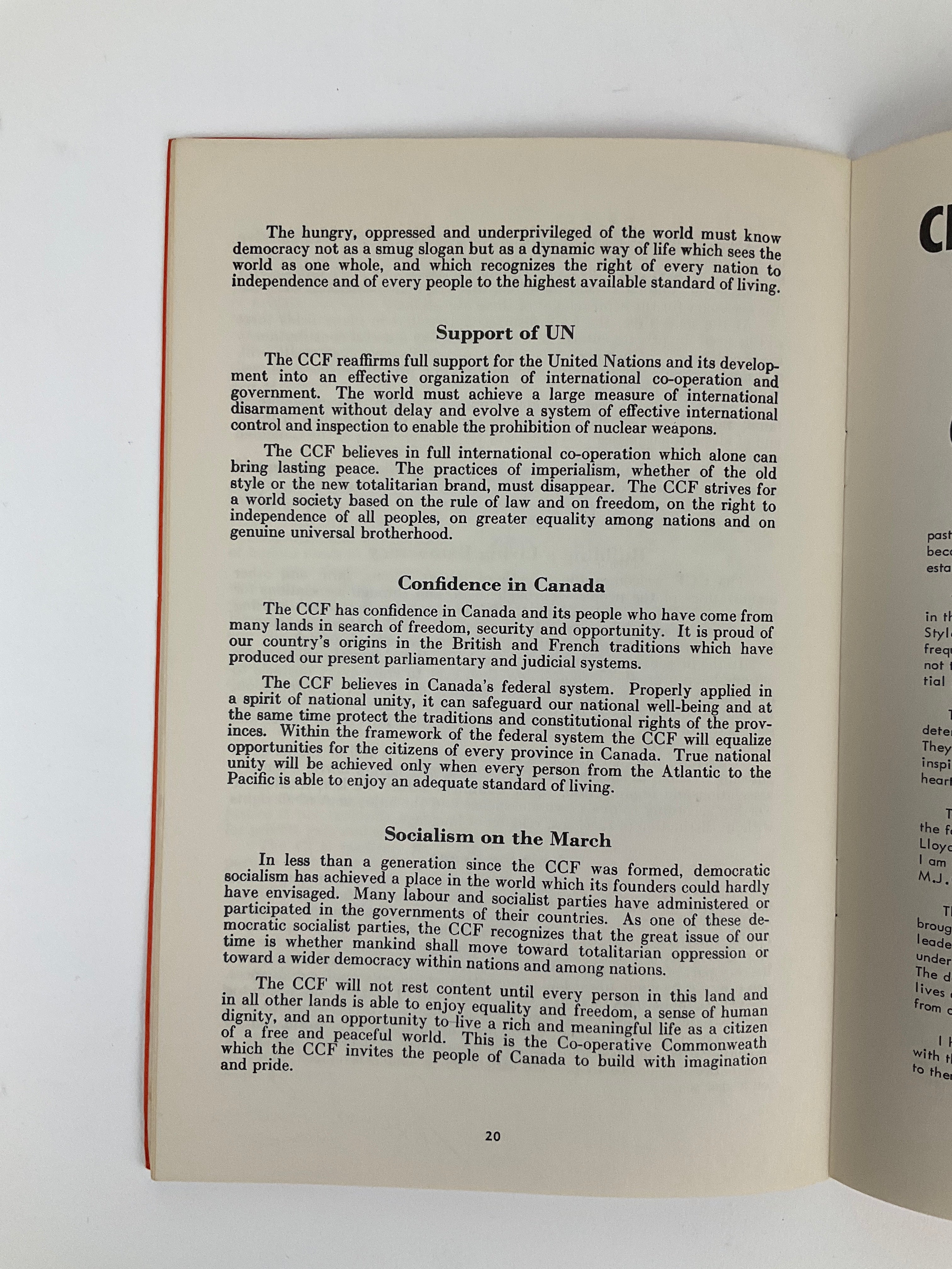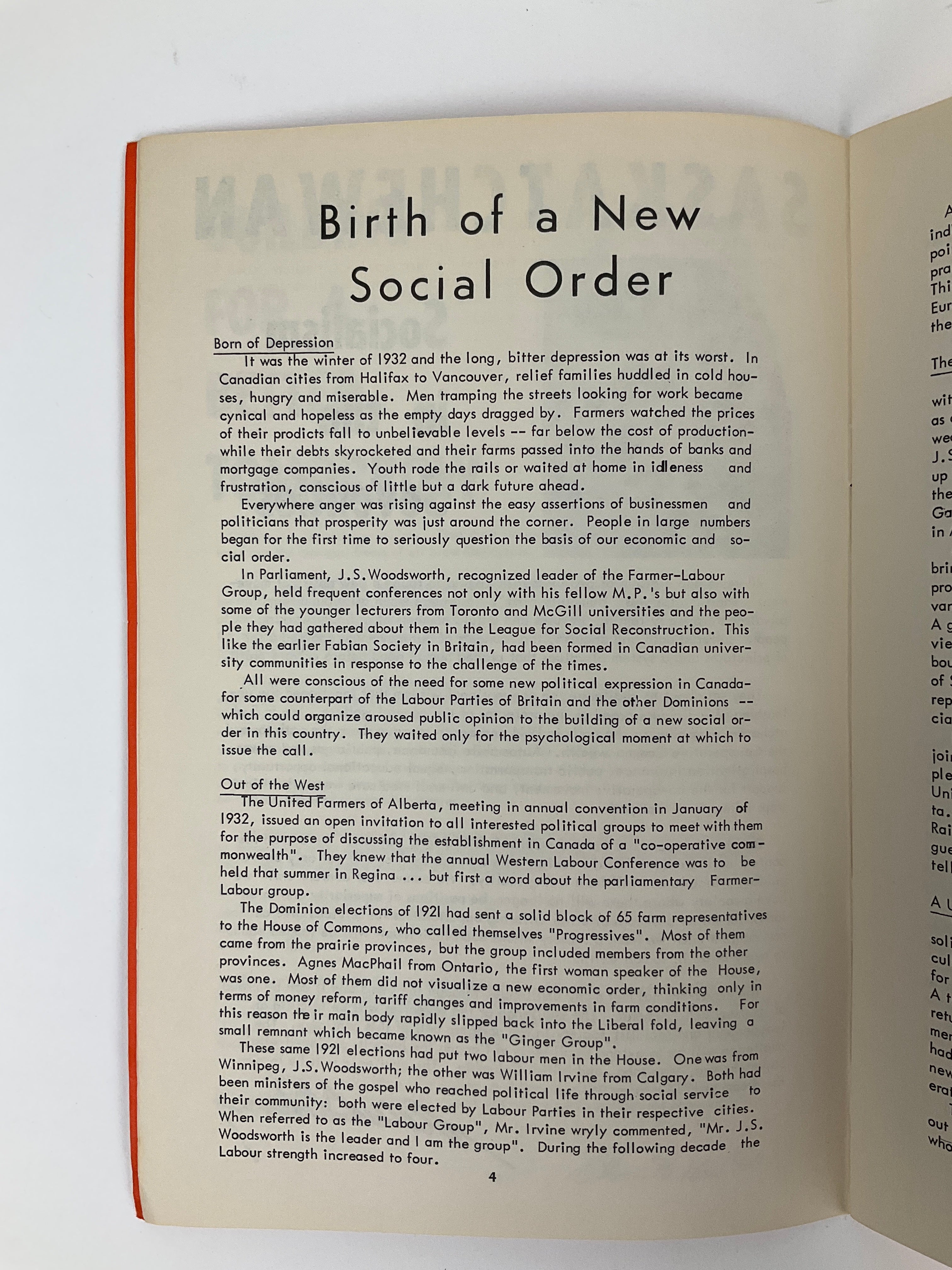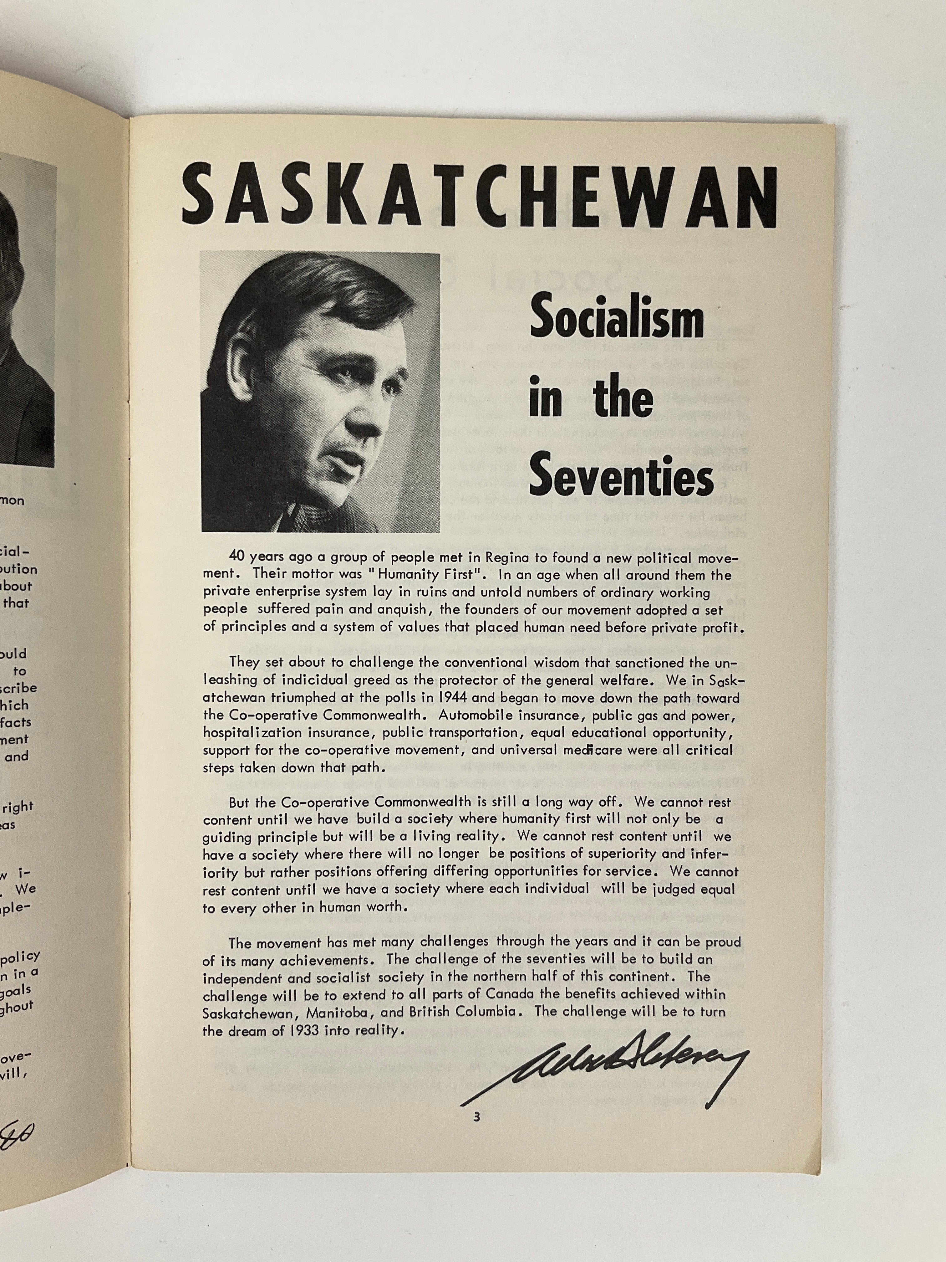 This pamphlet offers a concise history of the New Democratic Party, highlighting the principles and policies that form its foundation. It includes excerpts from the Regina Manifesto and the 1956 Winnipeg Declaration of Principles of the Co-operative Commonwealth Federation, along with messages from Alvin Hamilton, Allan Blakeney, and David Lewis.