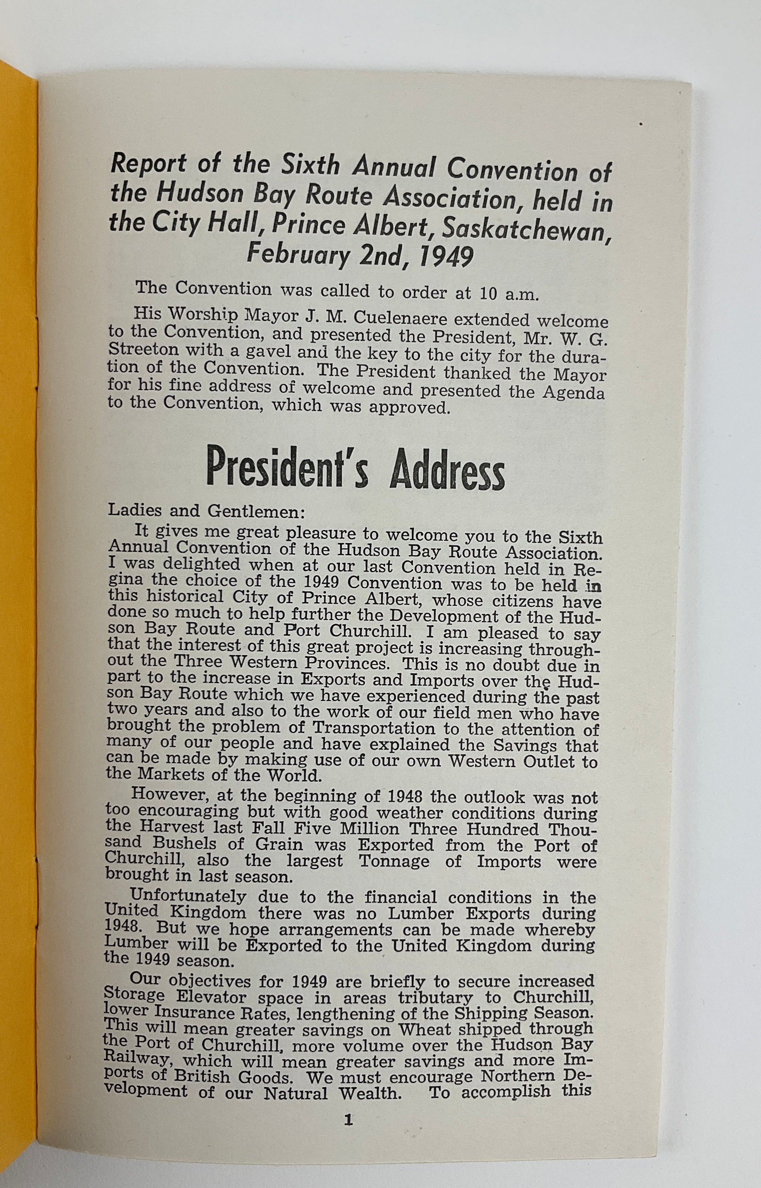 Report of the Sixth Annual Convention of the Hudson Bay Route Association Held in the City Hall, Prince Albert, Saskatchewan February 2nd, 1949