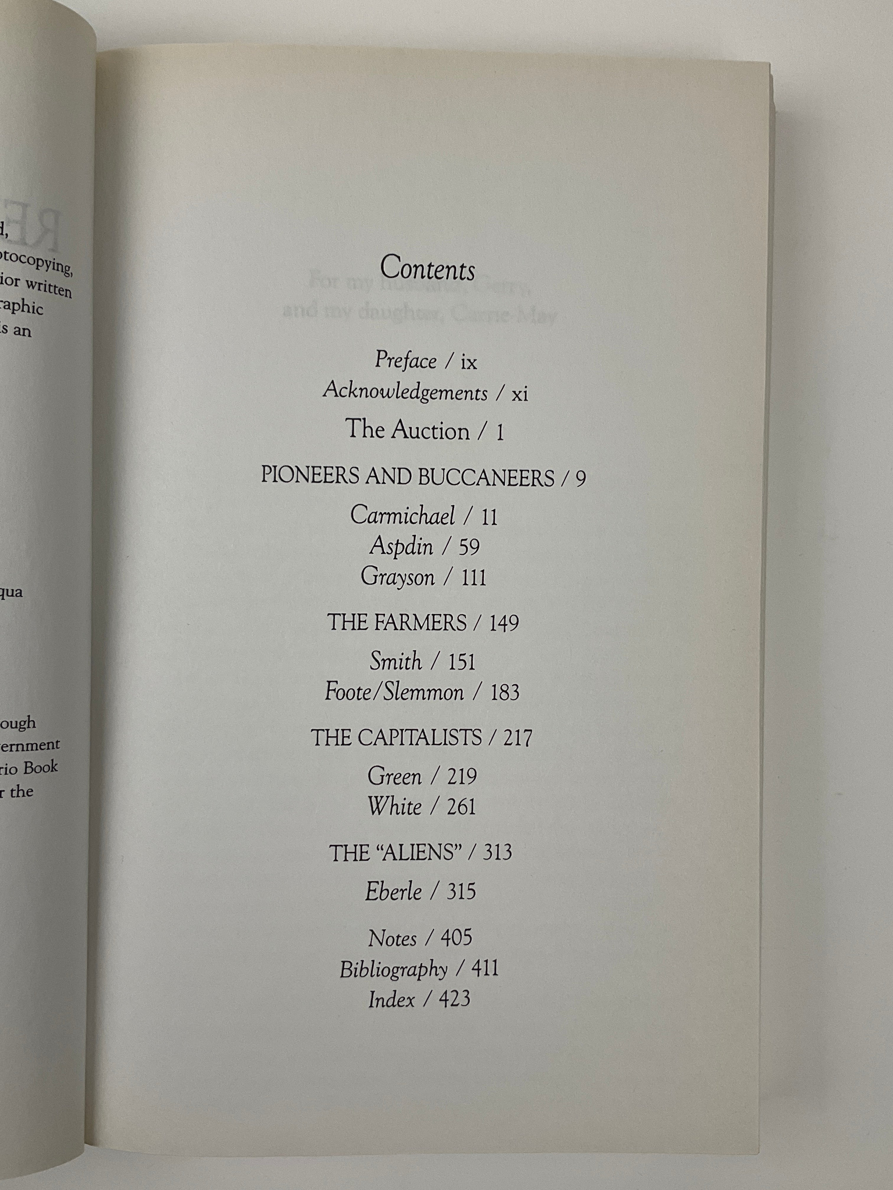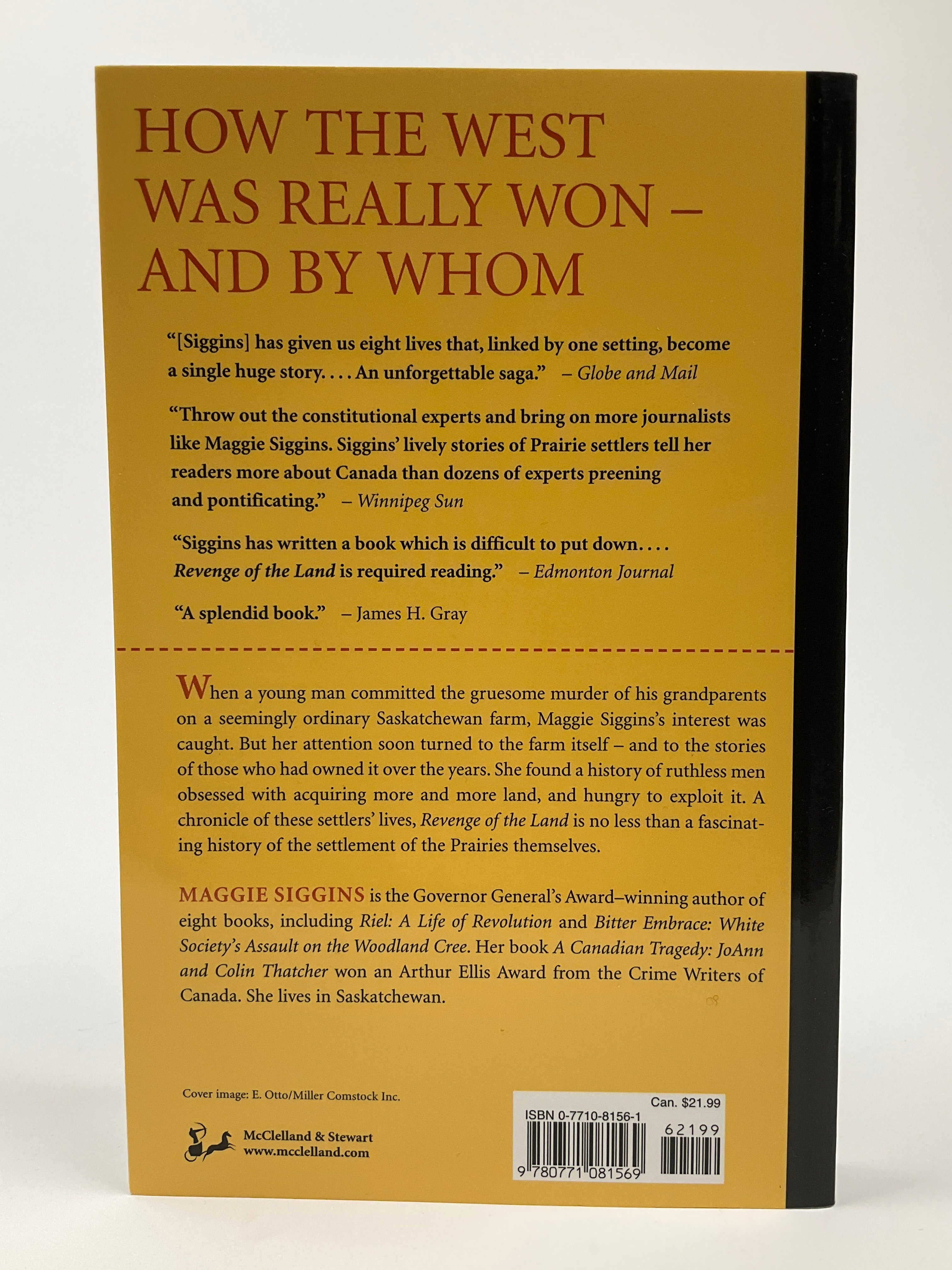 Maggie Siggins writes in the Preface, "This is the history of one particular farm, 640 acres of black brown clay, located seven miles south of Moose Jaw, Saskatchewan. It was chosen because a ghastly murder occurred there, but a commitment was undertaken: no matter how uneventful or commonplace, the story of every person who owned even a part of the land from 1883 to the present would be faithfully chronicled. The subsequent research revealed that of the eight men - always men becuase the wives, like most women, are lost in written history - whose names appeared on the title, not one lived a mundane life, not one escaped a fate full of astonishing surprises. How could they, when from the moment the first sod was turned, revenge was heaped on each who dared to violate the land?"