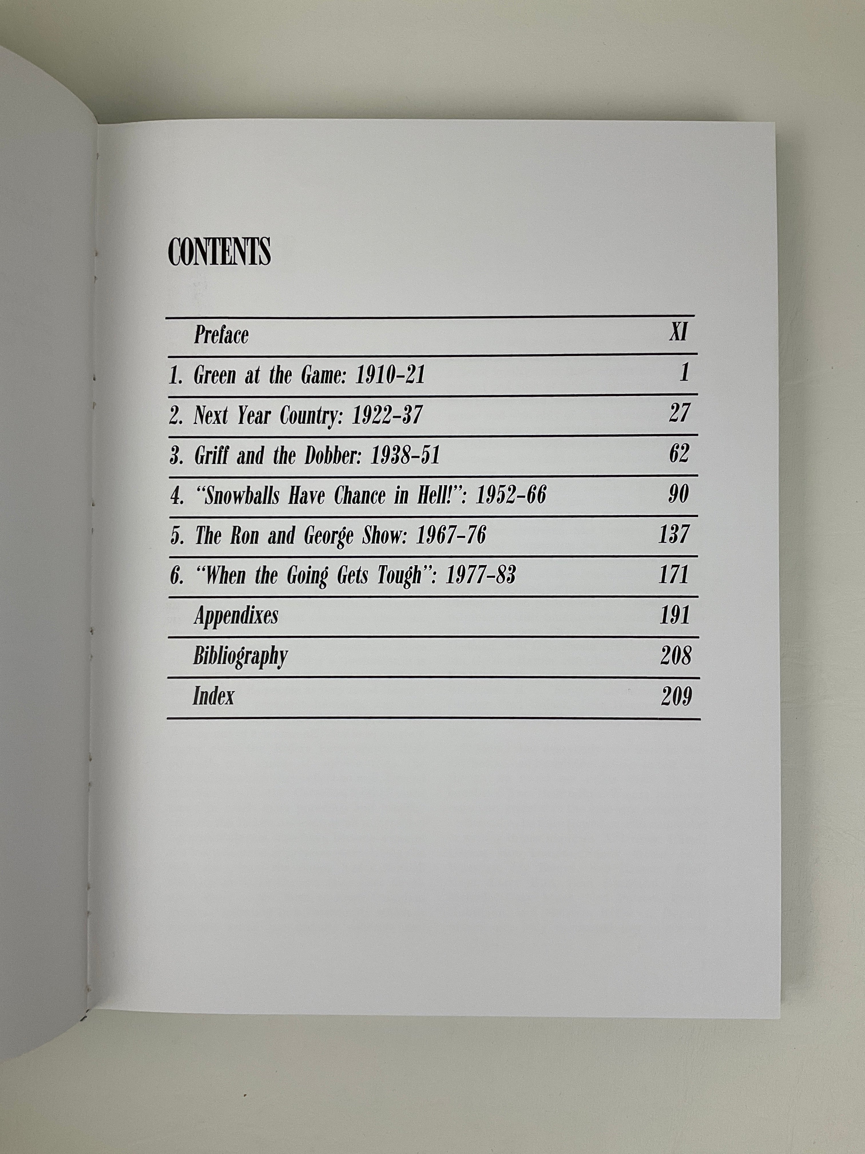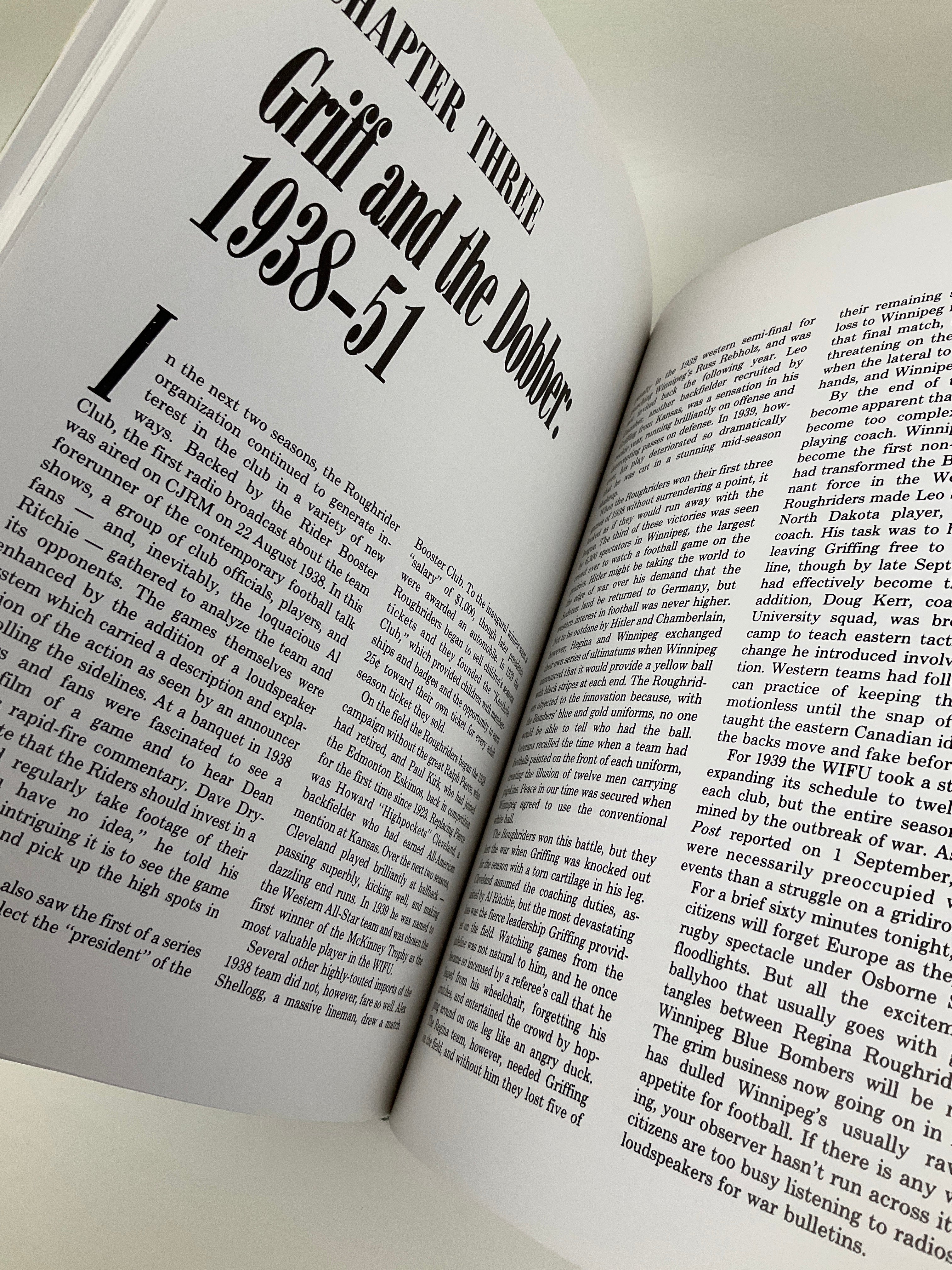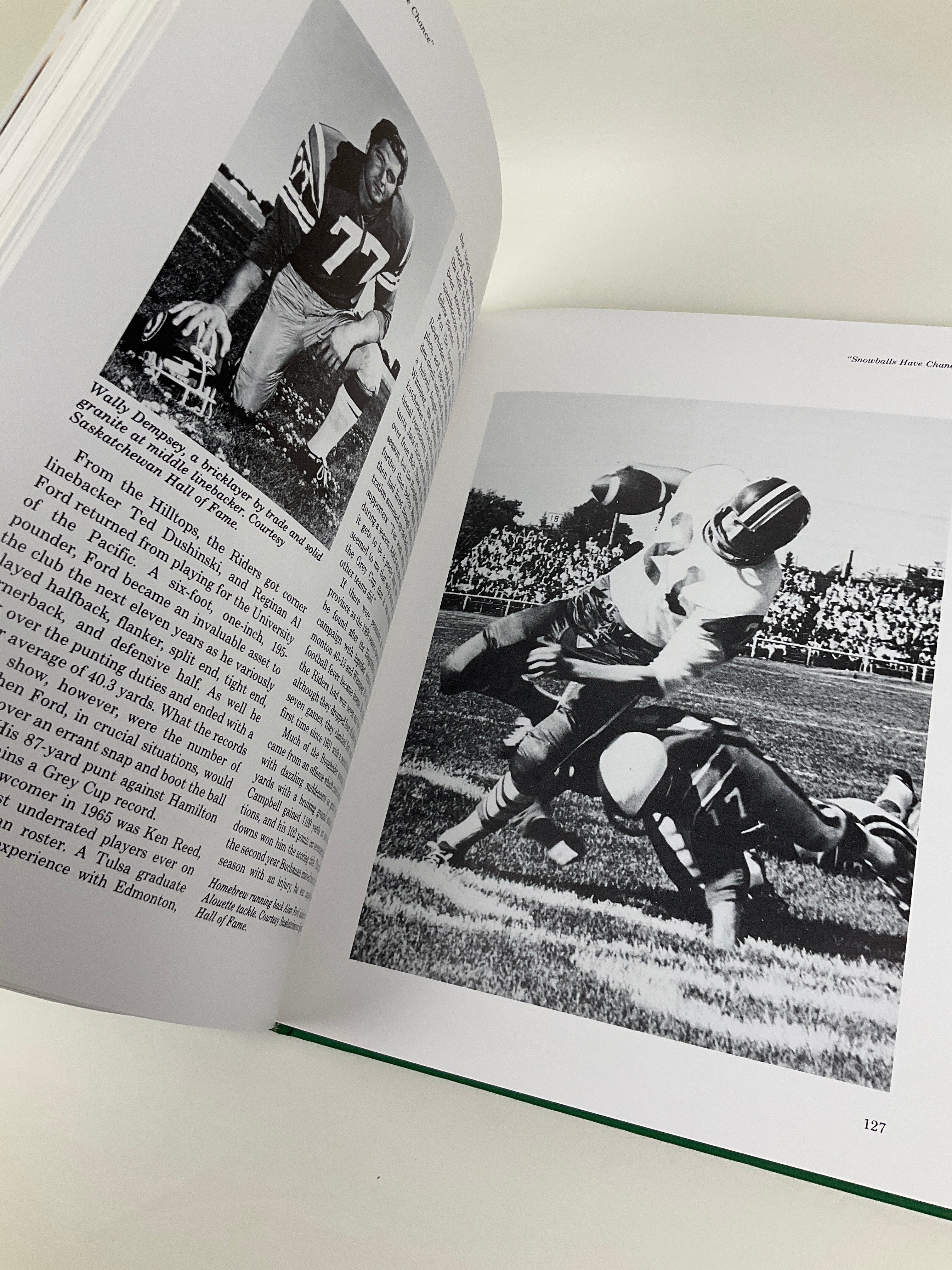 This volume chronicles the Saskatchewan Roughriders’ successes, failures, and fan base from the club’s inception in 1910 as the “Regina Rugby Club” (initially planned to be a rowing club) through its first Grey Cup victory in 1966 (defeating the Ottawa Rough Riders) to its difficulties in the 1970s and early 1980s. The authors craft a narrative both detailed and readable, mixing rosters, trades, and score lines with colorful anecdotes and humor. Throughout, the volume emphasizes the role of Saskatchewan Roughriders fans (rather than just the club’s coaches, stars, or owners) as an integral feature of football in the province. Includes year-by-year league standings, award recipients and team/league record-holders, lists of Saskatchewan Junior athletes who played for the club, a list of “Miss Saskatchewan Roughrider” from 1951-1983, and an index.