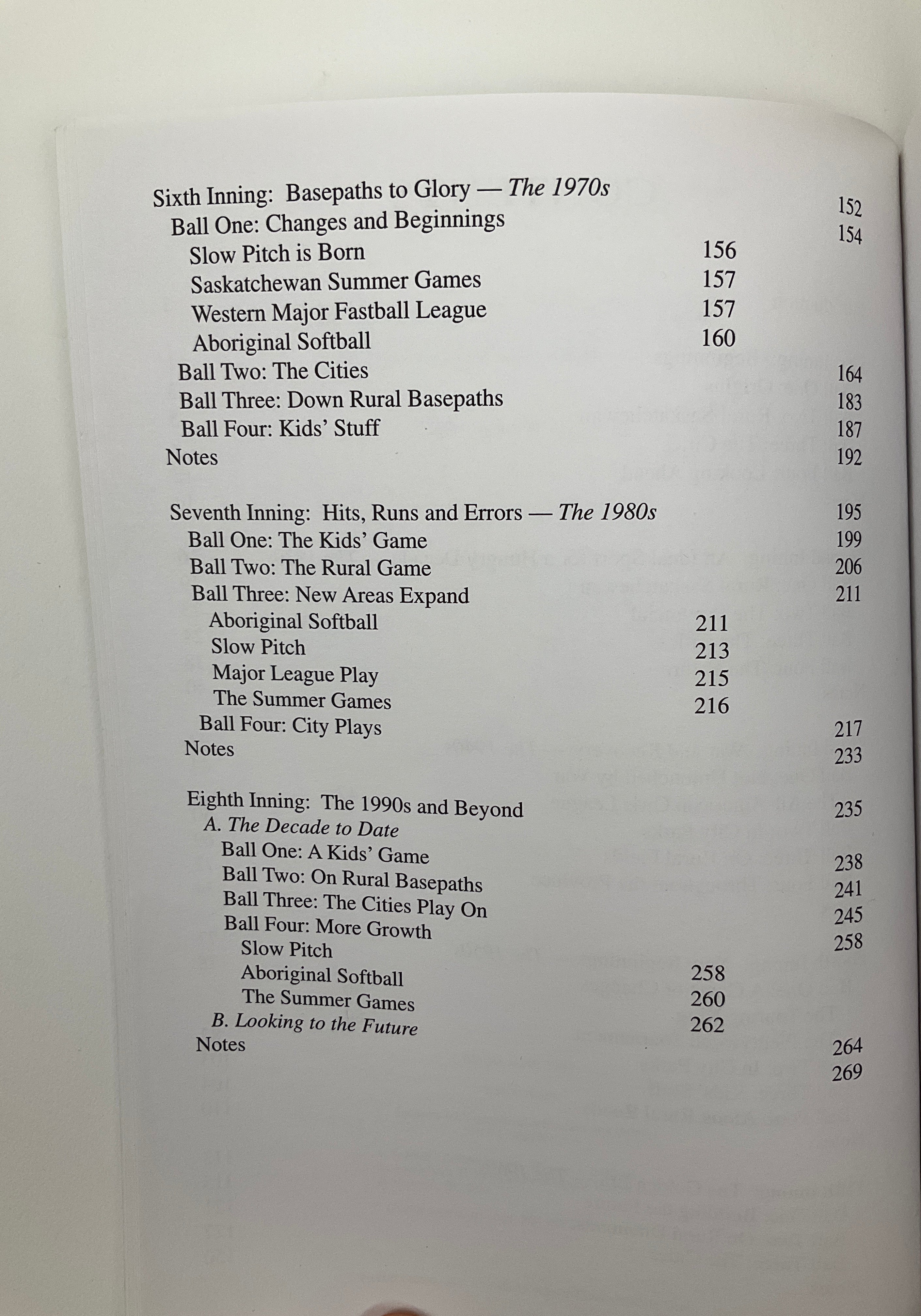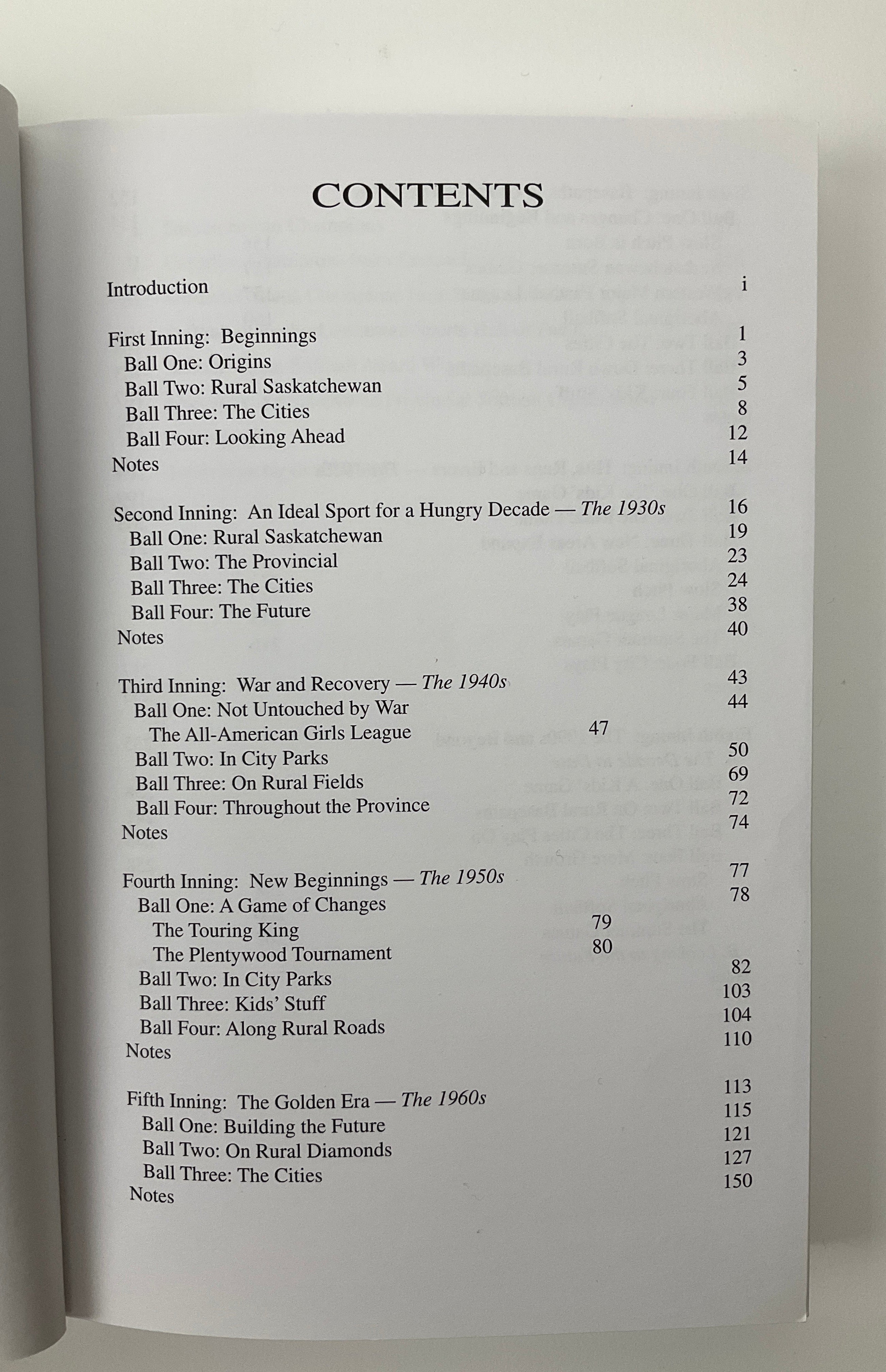 A chronicled history of the sport from its introduction to the province in the early twentieth century thru the mid 1990s. Looks at many levels of the sport - from youth tournaments to the senior men's leagues. A few of the highlights, feature essays on Saskatchewan's contribution to the All-American Girls League, the old Plentywood Tournament, the Western Major Fastball League, the Saskatchewan Summer Games. Research by the undimable Leonard Doell