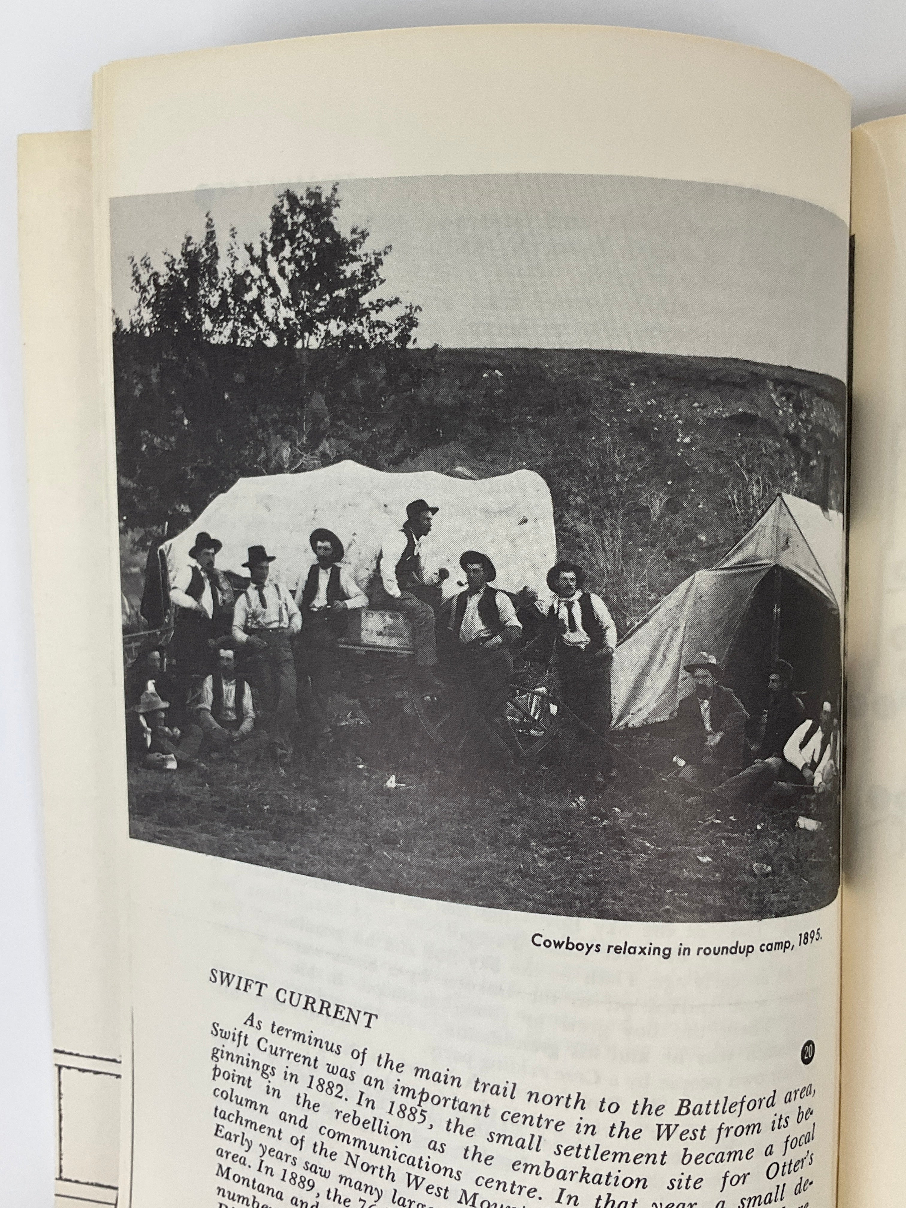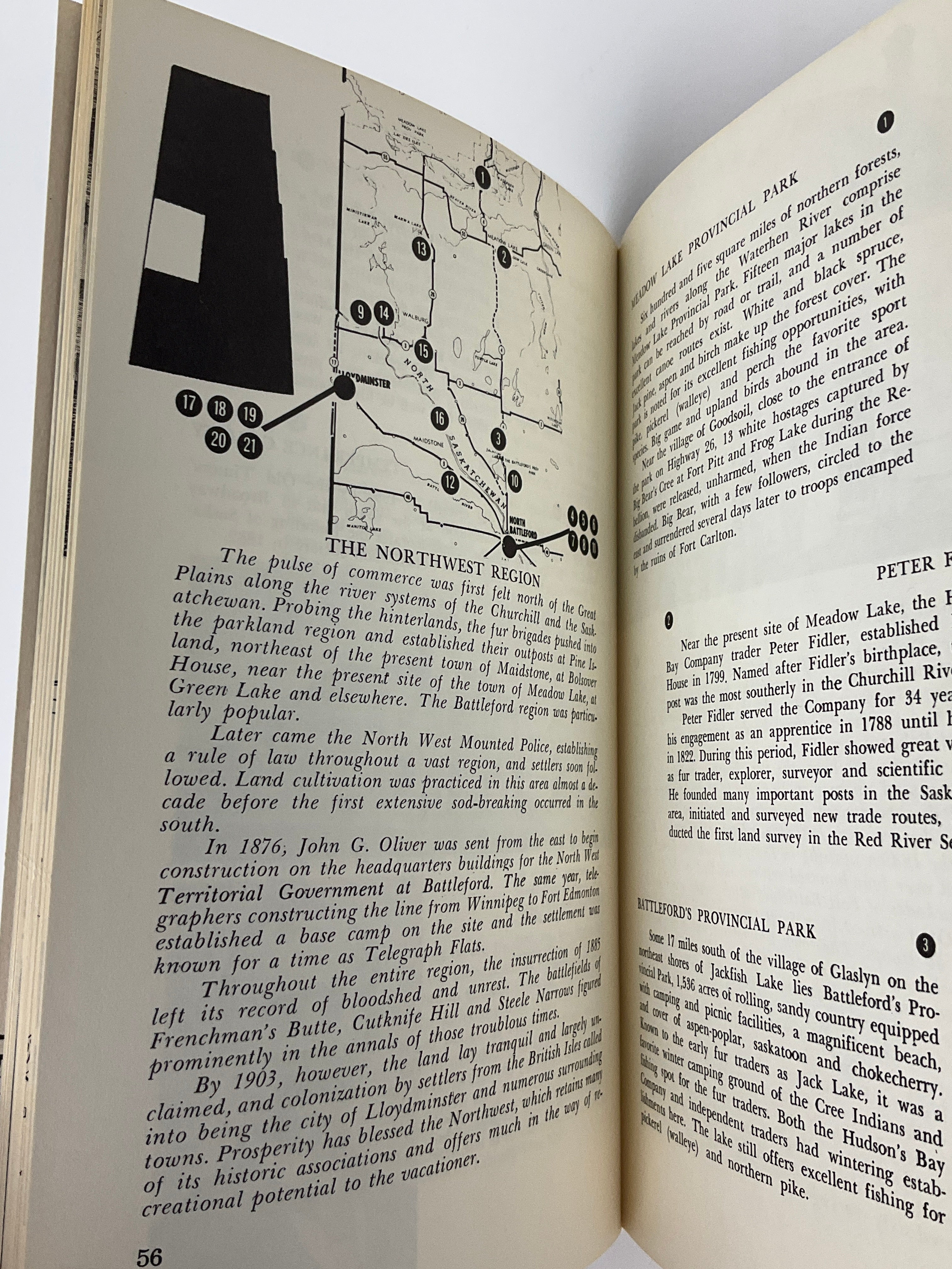 Prepared as part of the celebrations surrounding Saskatchewan’s sixtieth year of incorporation as a province, this slim volume identifies historic landmarks and sites around the province. The volume divides Saskatchewan into seven geographic regions – each section includes a map indicating points of interest, overviews of major settlements and regional history, and short descriptions of each point of interest. Includes index, a list of museums in the province, and a short history of Saskatchewan by J. D. Herbert (Director of Historic Sites for the province’s 1955 Jubilee Committee).