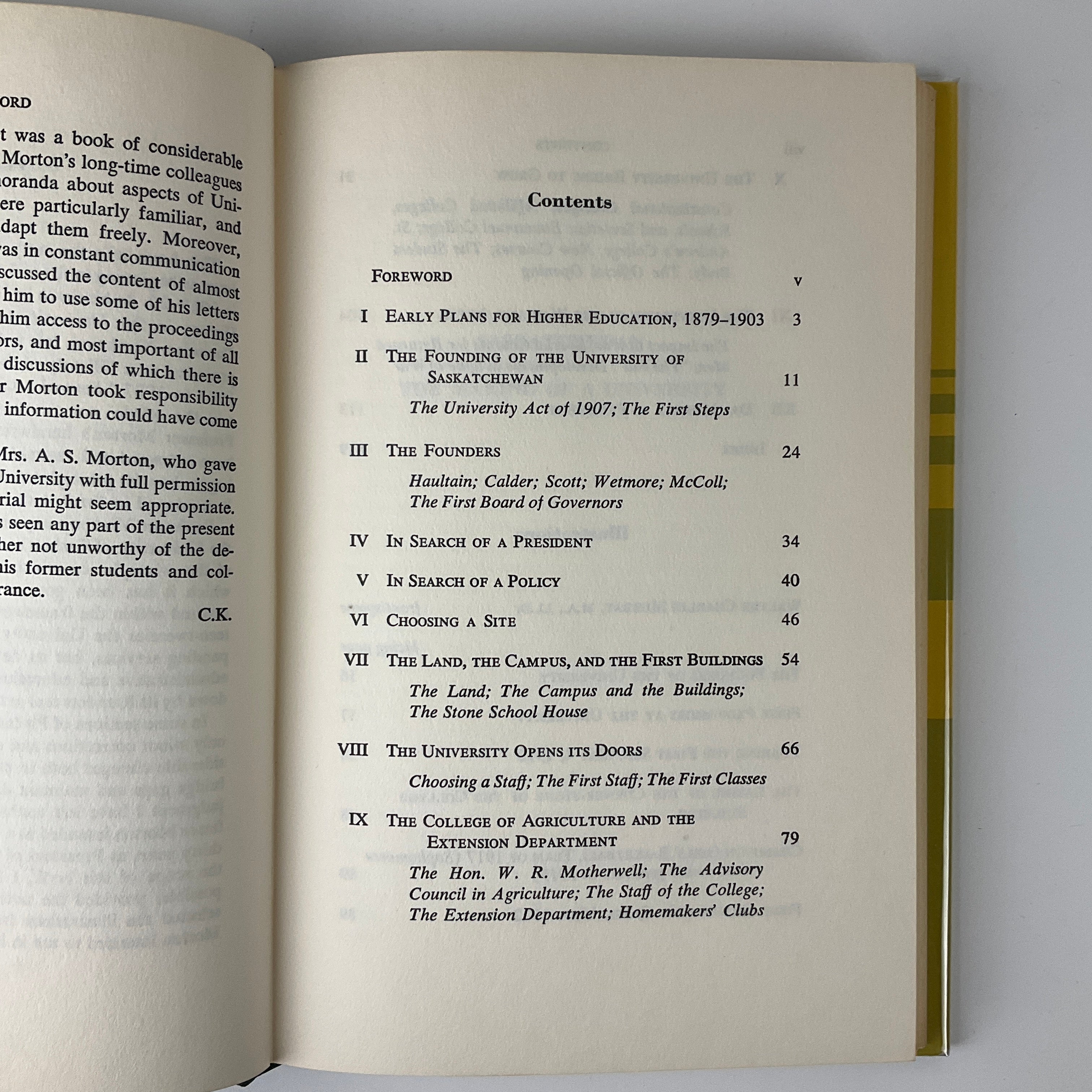 Two University of Saskatchewan professors produced this institutional history: Arthur S. Morton (from History, library) prepared a manuscript of the University’s early history prior to his death in 1945, and Carlyle King (from English) revised that manuscript for publication. The book covers the first twelve years of the University’s existence, beginning with its founding in 1907 and ending with the effects of WWI and the Spanish Flu pandemic. The authors highlight major figures and events in the University’s establishment, and Morton’s close contact with Walter Murray (first University President) ensures access to a high level of institutional knowledge. Throughout, the authors situate the University’s growth in the context of events and trends in higher education in western Canada.