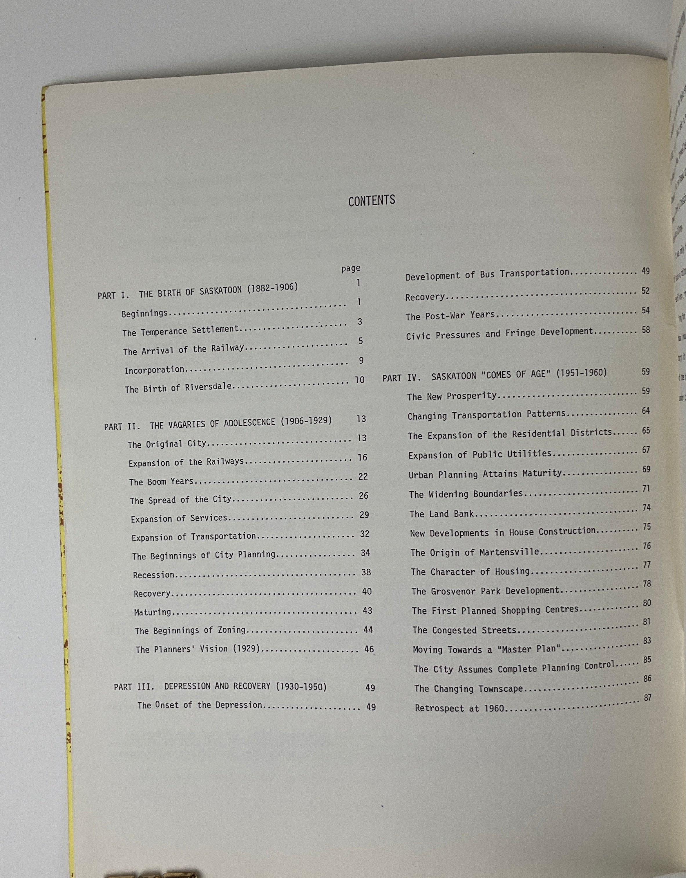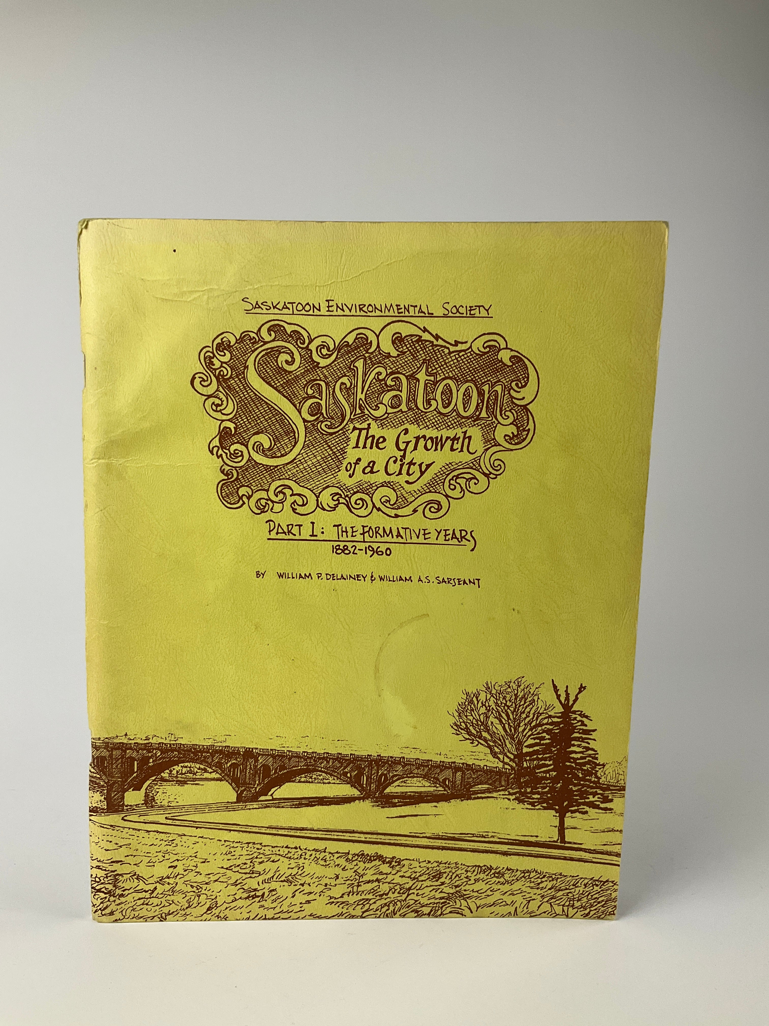 Intended to be the first half of a two-part history of Saskatoon, this volume appears as no.2 in a "Saskatoon Past, Present & Potential" series published by the Saskatoon Environmental Society. Based on a M.A. thesis by William P. Delainey (currently co-editor of "Saskapedia"), the book traces Saskatoon's growth from a temperance colony founded in 1882 into an urban centre in the early 1960s. The authors discuss issues such as city planning and zoning, factors influencing growth, transportation and services, civic politics, and commercial activity and industry. Although the book has academic roots, the text is supported by maps and photographs more often than footnotes.