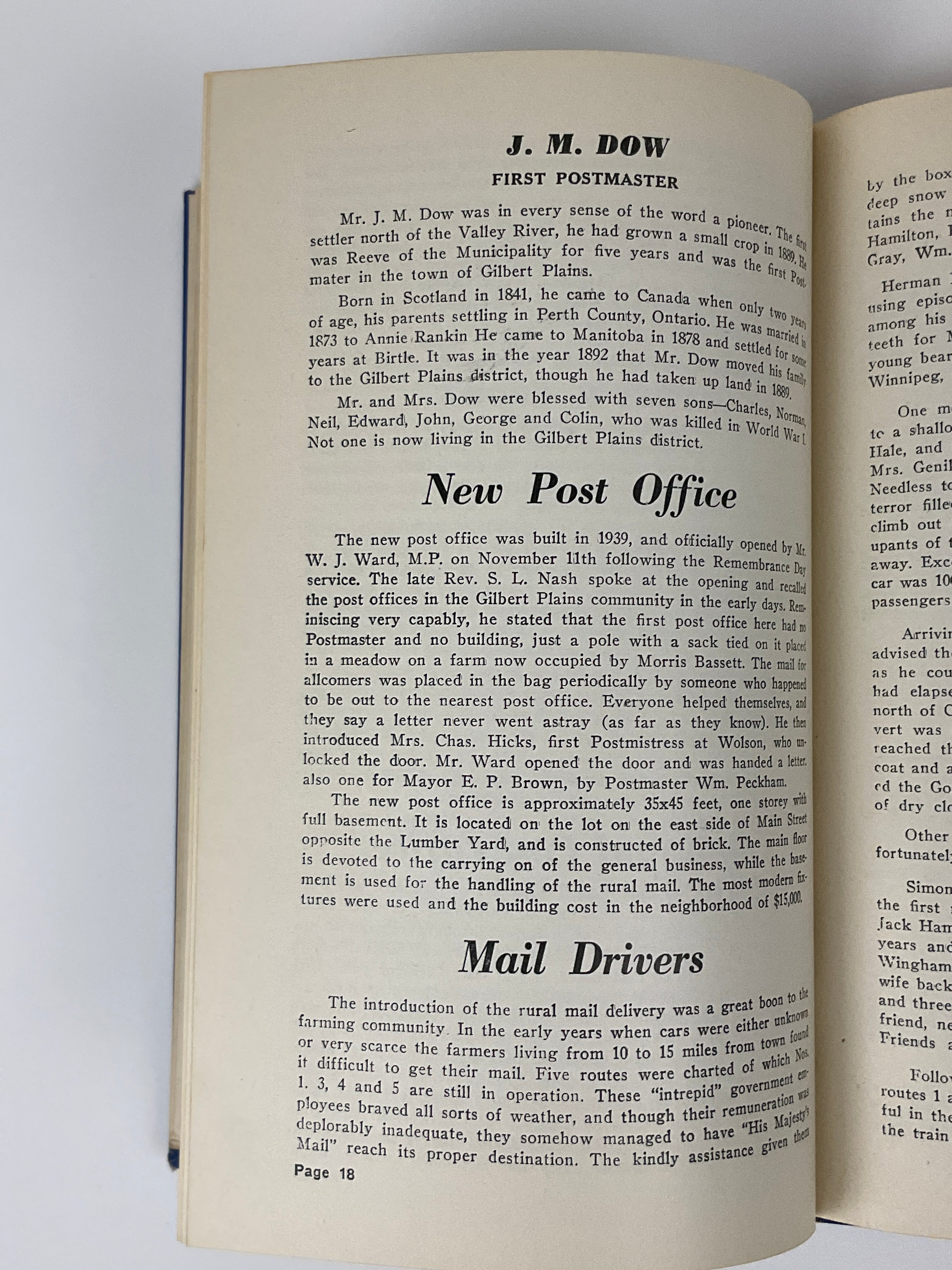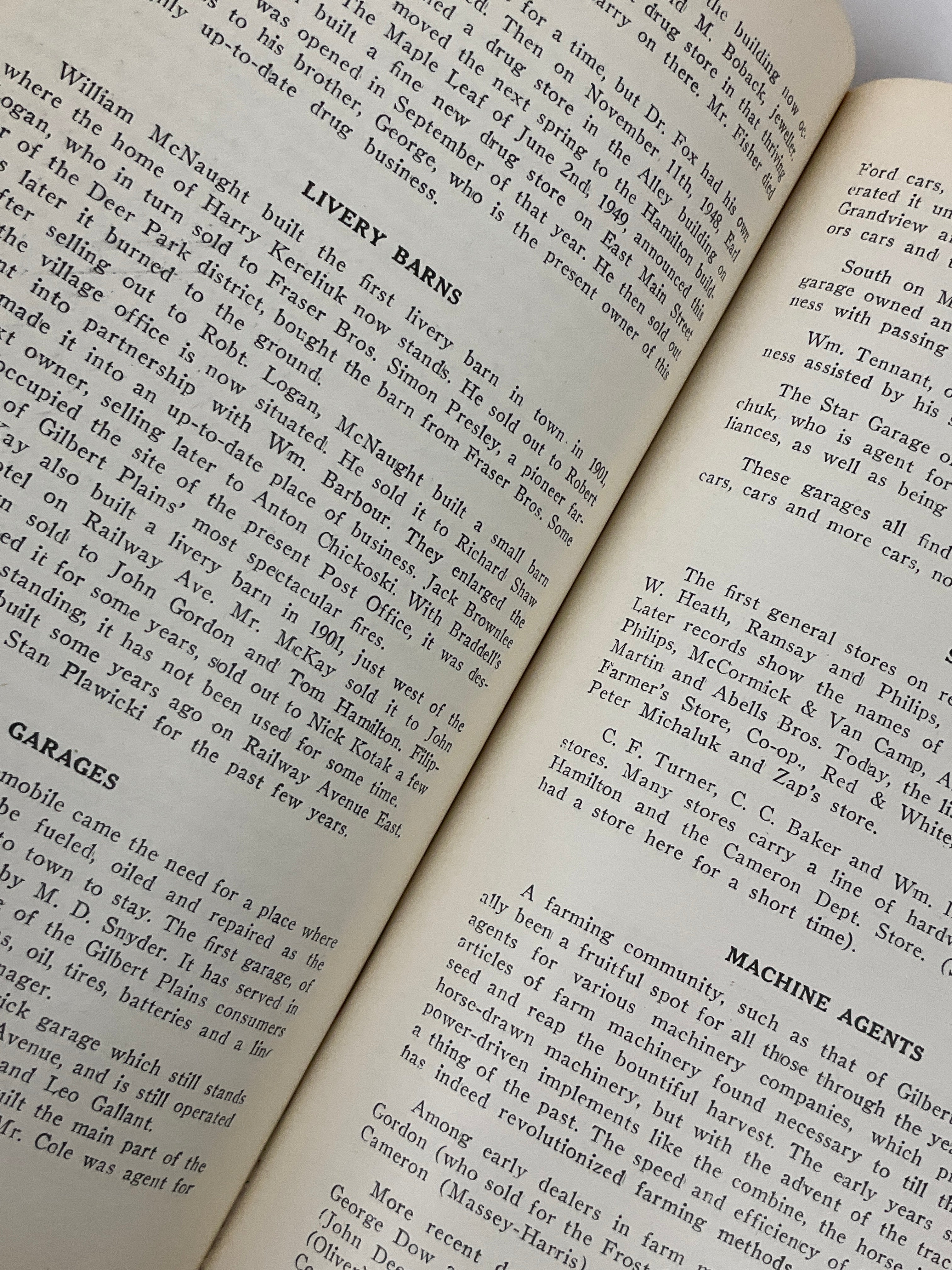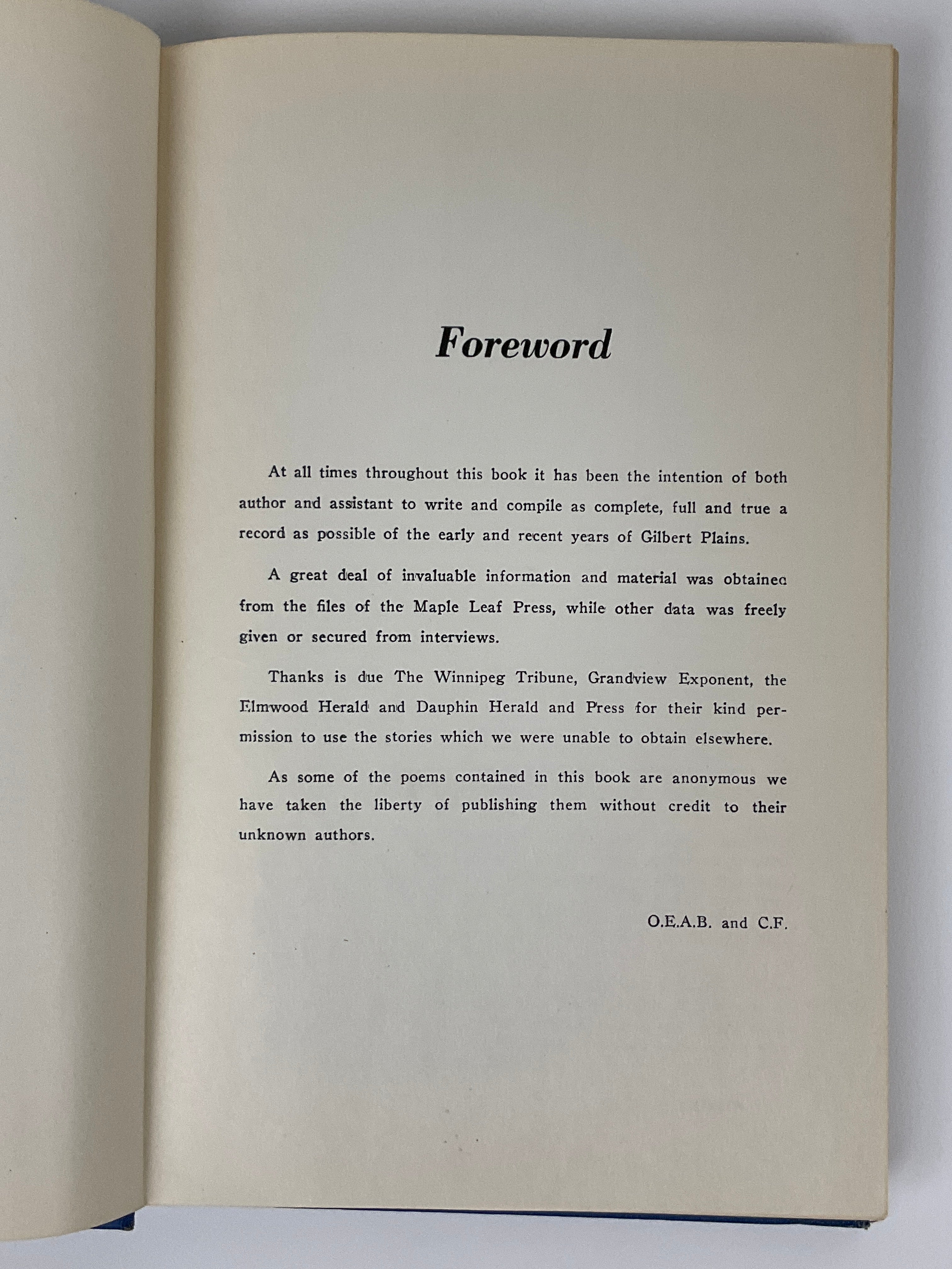 This community history documents the Gilbert Plains region of Manitoba, an area approximately thirty miles square, bordered by the Duck Mountains to the west and the Riding Mountains to the east, and traversed by the Drifting Valley and Wilson Rivers. The volume includes chapters on early pioneers, churches and education, the development of Gilbert Plains Township, early businesses, agriculture, lodges and community organizations, as well as significant local events such as floods and fires. Also featured are an Honour Roll and a small selection of biographical profiles of area residents.