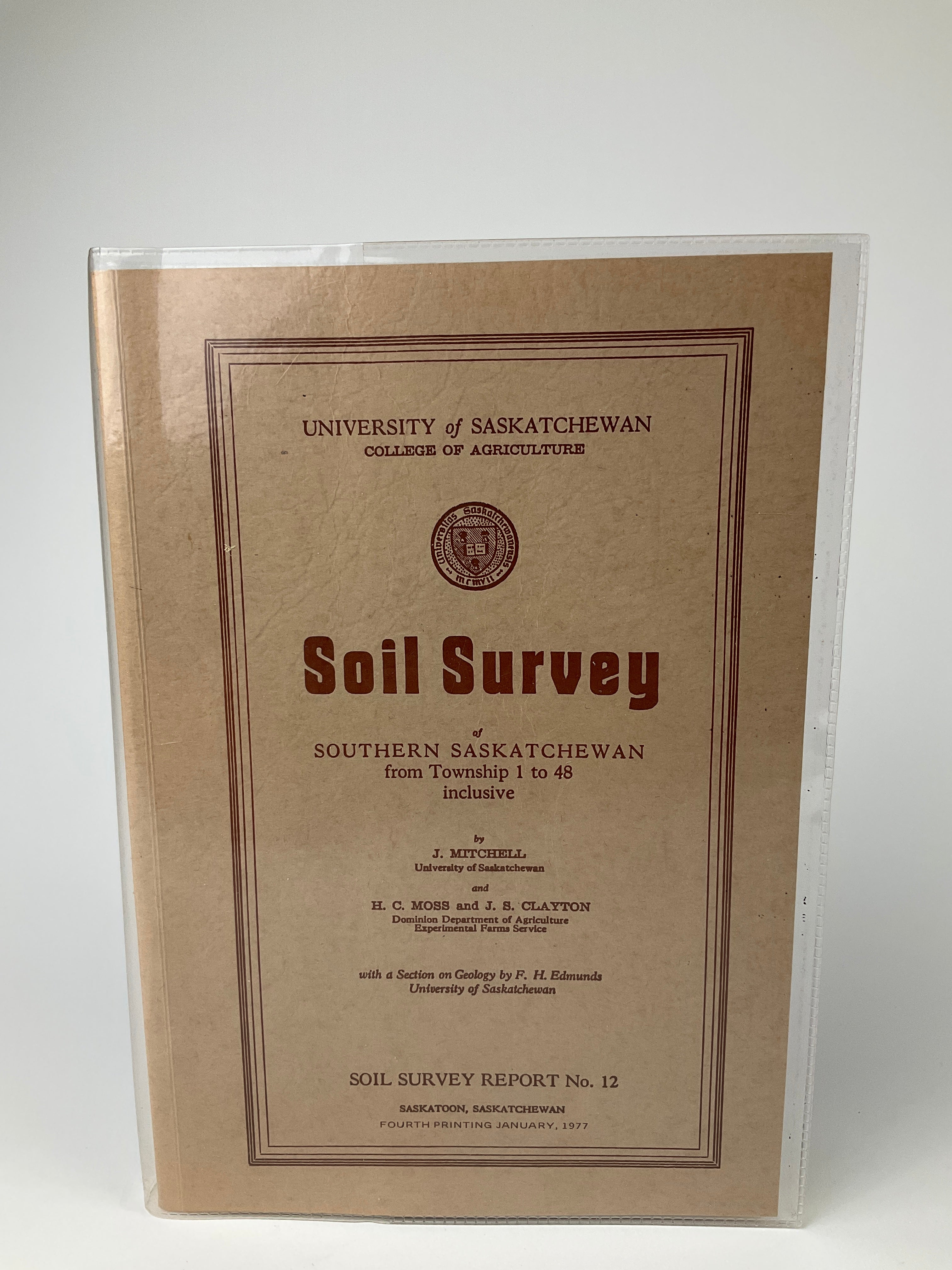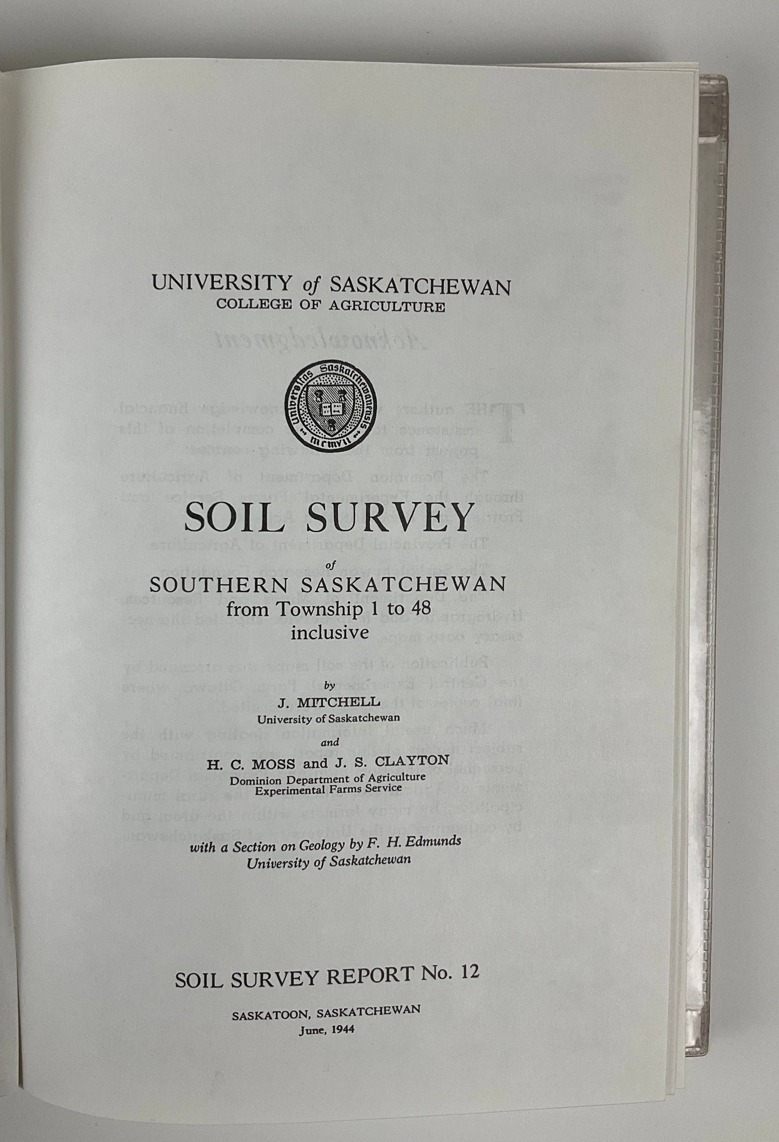Conducted by the University of Saskatchewan’s Department of Soils (now, Dept. of Soil Science) in 1944, Soil Survey #12 organizes the province’s regions by soil type, further dividing each soil into subtypes or “Associations.” The report contains information about drainage, topography, composition, texture, and other geological and organic aspects. As a publication of the University’s College of Agriculture, the Soil Survey also includes reports on the agricultural suitability of each soil type. The soil ratings created by Moss and Mitchell remain standards for assessing soil in the province. A comprehensive report of the province’s soil compositions [for regions south of Prince Albert].