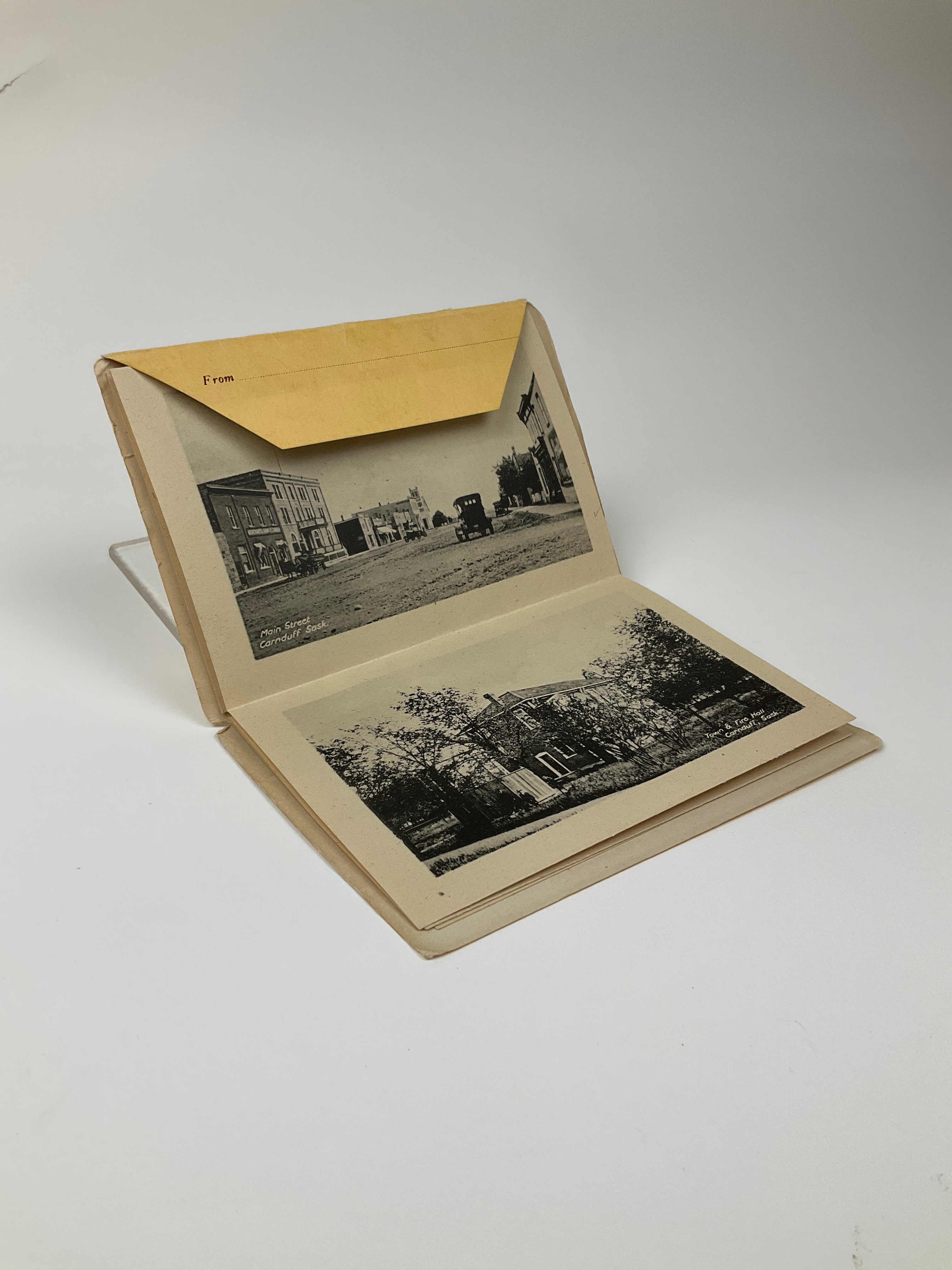 Small accordion-pleated viewbook, approximately 3.75x5.5 inches, when folded, comprising 8 double-sided panels (16 views in total), printed recto and verso with black-and-white halftone images of early 20th-century Carnduff, Saskatchewan. Views include: two street scenes each of Railway Avenue and Main Street; single views of Pacific Avenue, Elevator Row, the Court House, the Avonmore Hotel, and the Odd Fellows Hall; as well as images of the Presbyterian, Methodist, and Baptist churches, and the Public School.