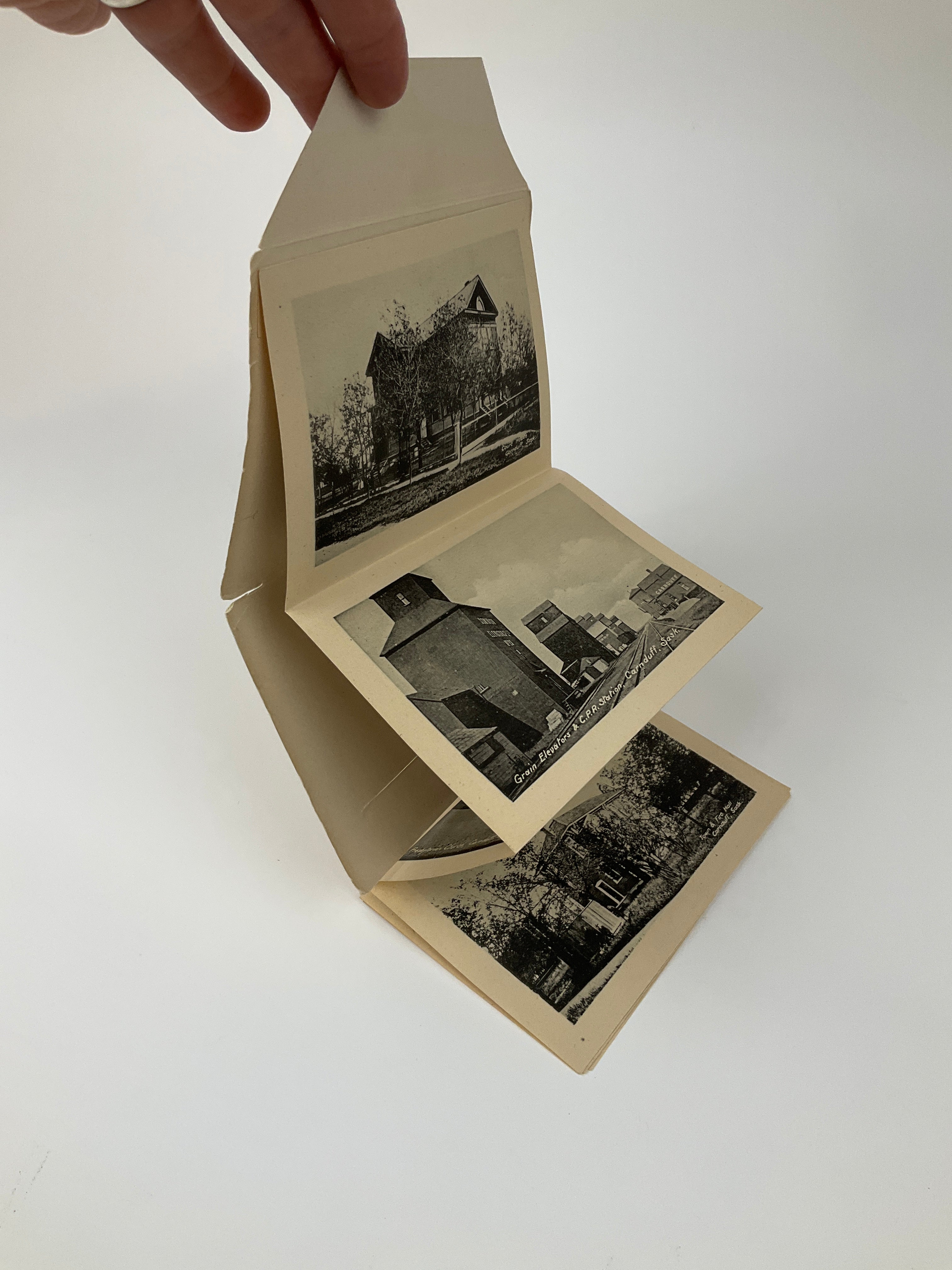 A single folded leaf, measuring approximately 5.75 x 30.75 inches [14.5 x 78 cm] when fully extended; folded accordion-style into 8 double-sided panels. Printed recto and verso with B&W photographs. Housed in the original printed cardstock folder, which serves as both cover and enclosure.