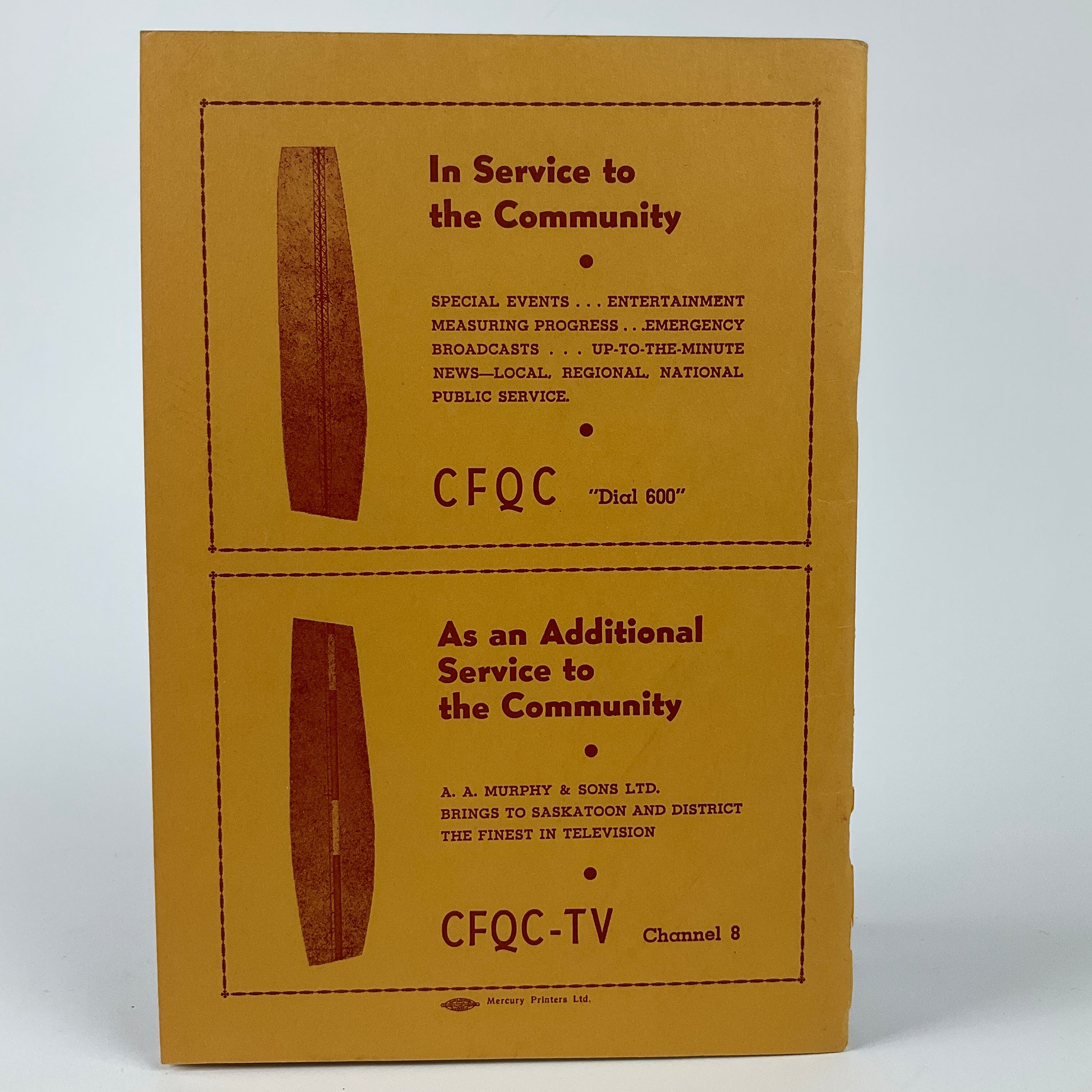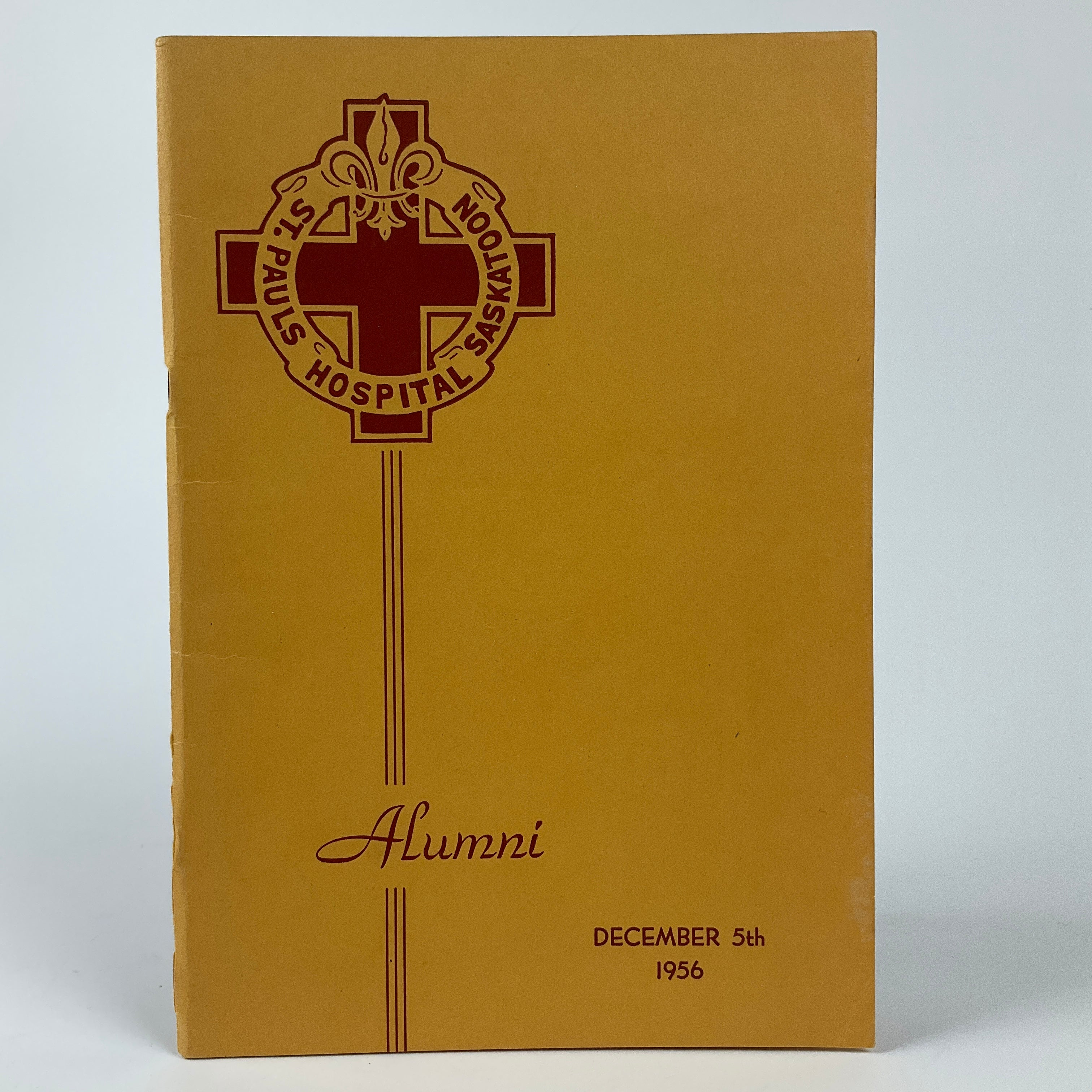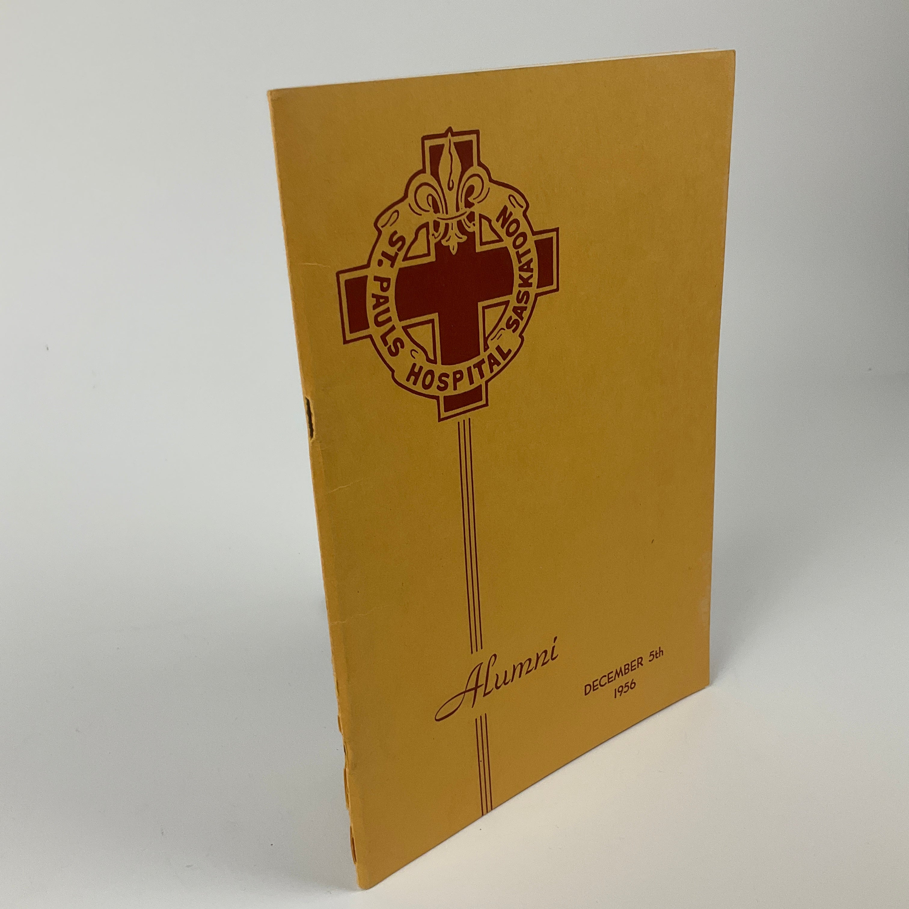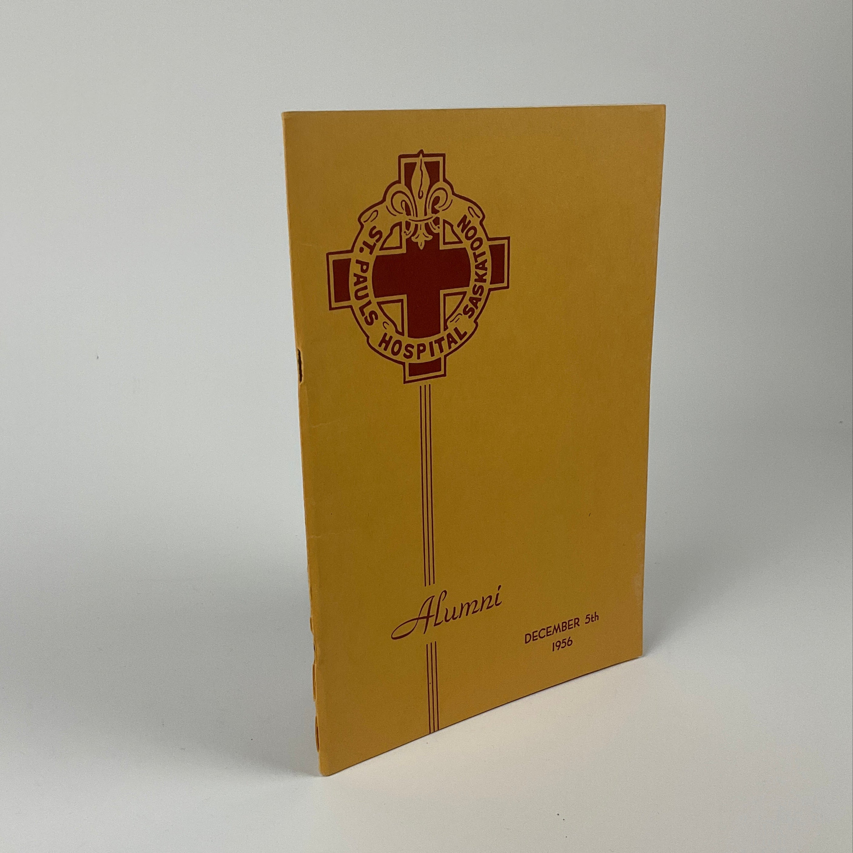 This programme was produced for a 1956 St. Paul's School of Nursing Alumni Association's variety night in Saskatoon. The booklet opens with a message from the Association's president, a list of the Association's executive, and a short history of St. Paul's Hospital. Portraits of the night's performers (an eclectic international group, including Finnish juggler Seppo Leivo and American singer Russell Byrd) are spaced throughout the programme, with the order of ceremonies appearing on p.29. Most pages are filled with advertisements solicited by the Alumni Association, rendering the programme a time capsule of Saskatoon area businesses in the mid-1950s.