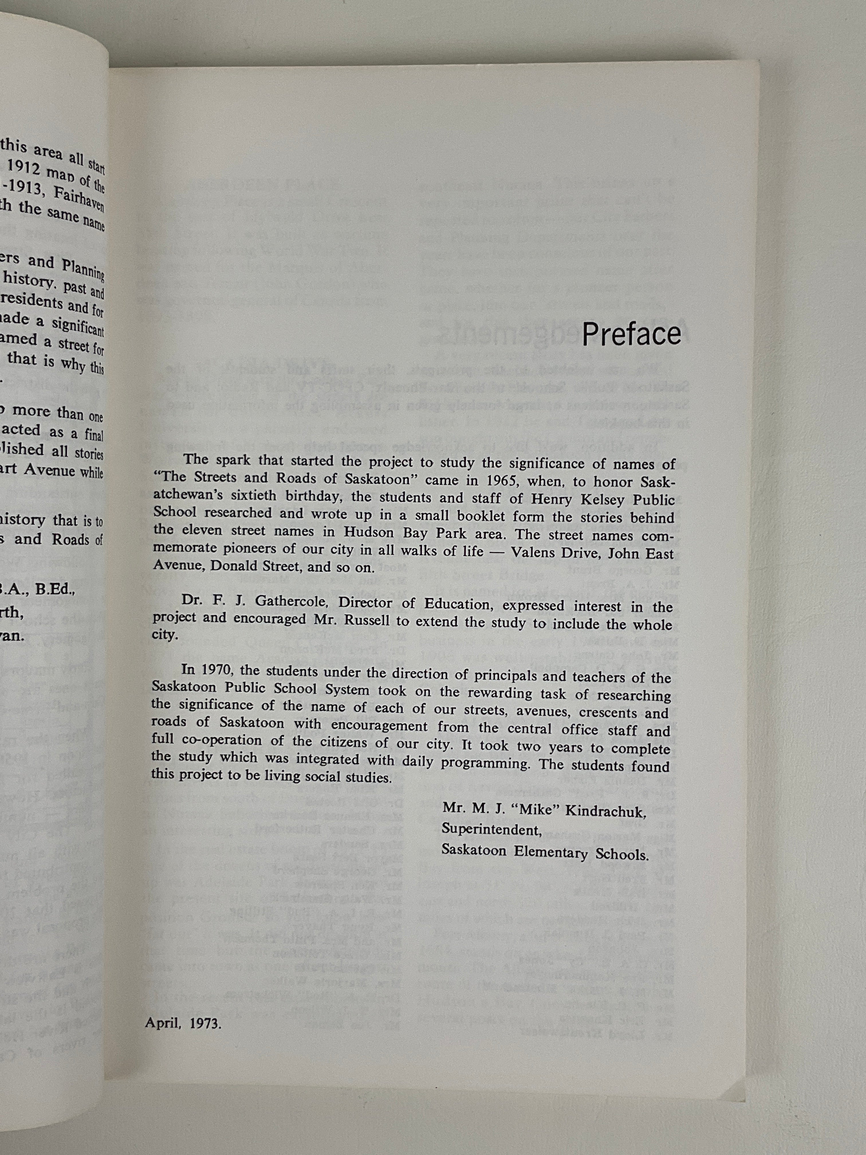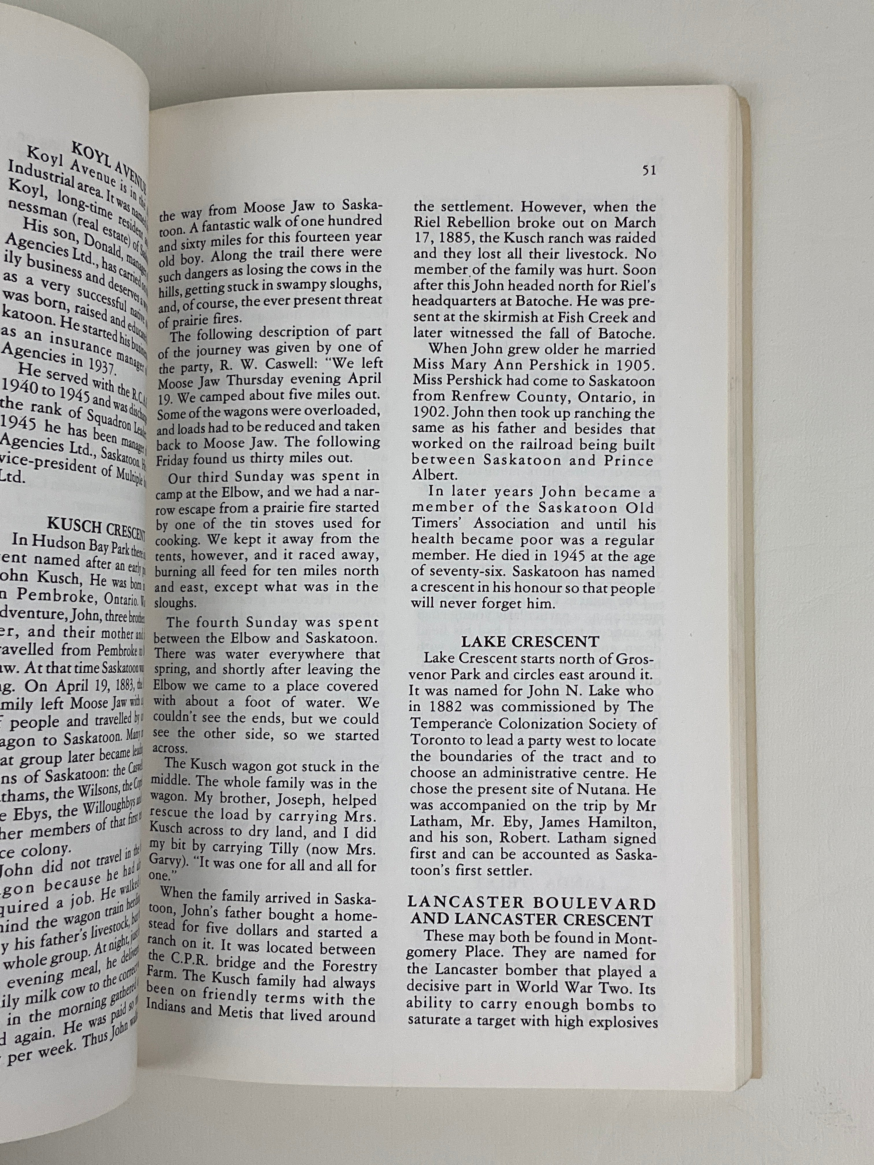 Streets and Roads of Saskatoon is a local history resource that documents the origins of roughly 400 street and road names in Saskatoon. The authors trace how many of the names reflect royal, military, political, and local figures, neighborhoods, events, or natural features. Created as part of a social studies project, the book includes historical notes and maps, explaining not just what the streets are called, but why—they offer insight into the people and stories behind Saskatoon’s evolving urban landscape.